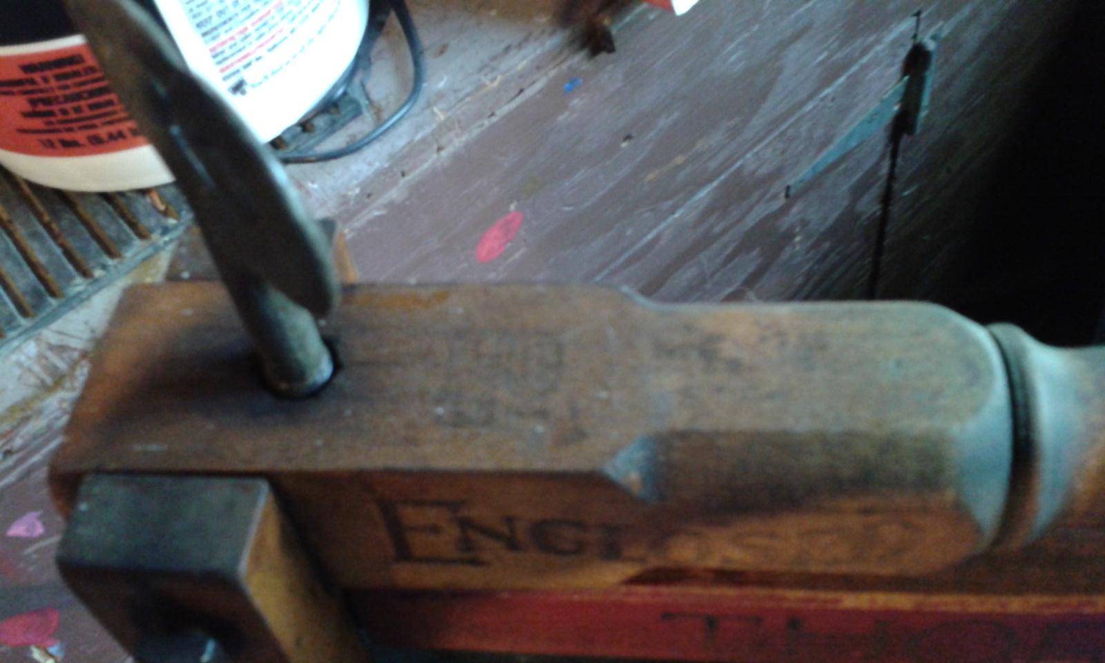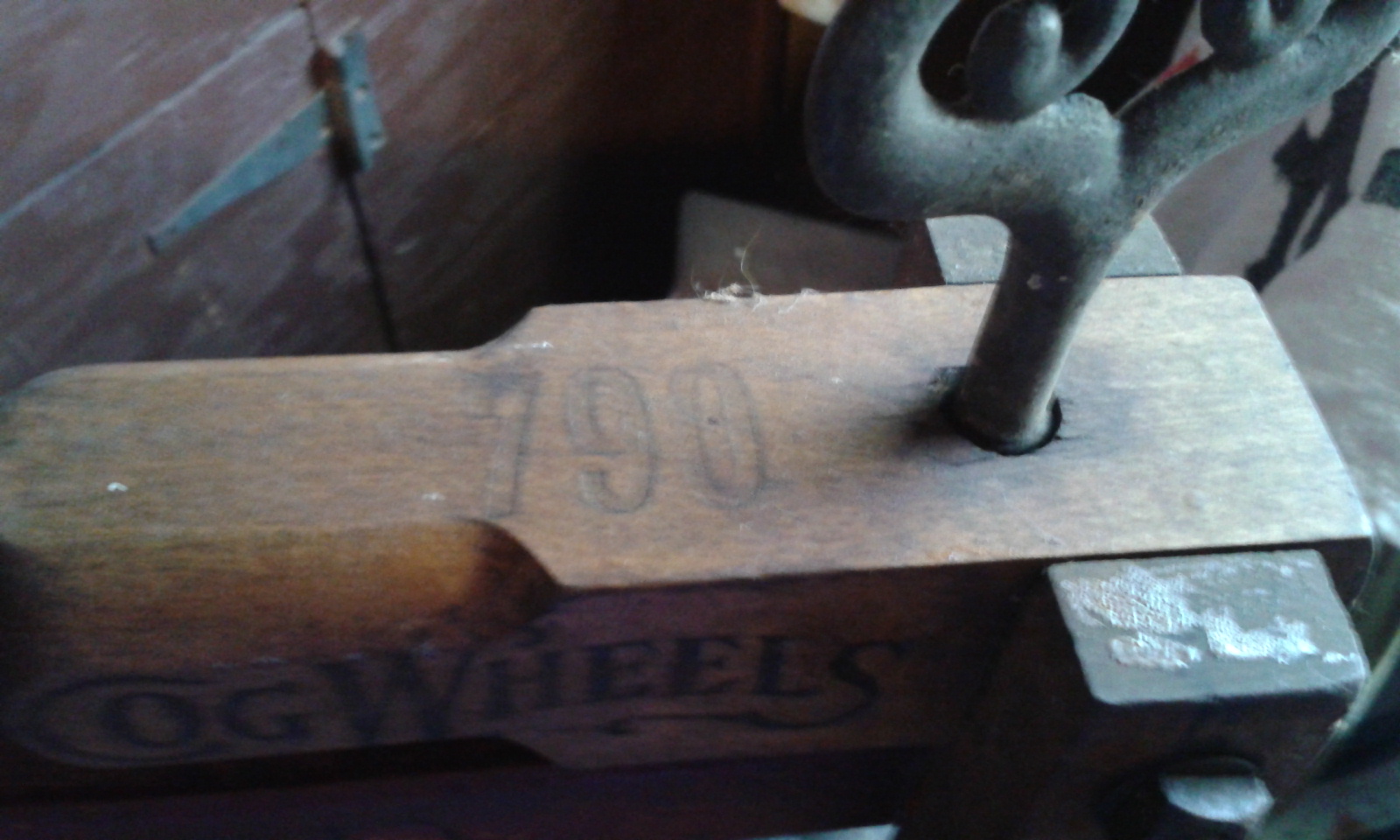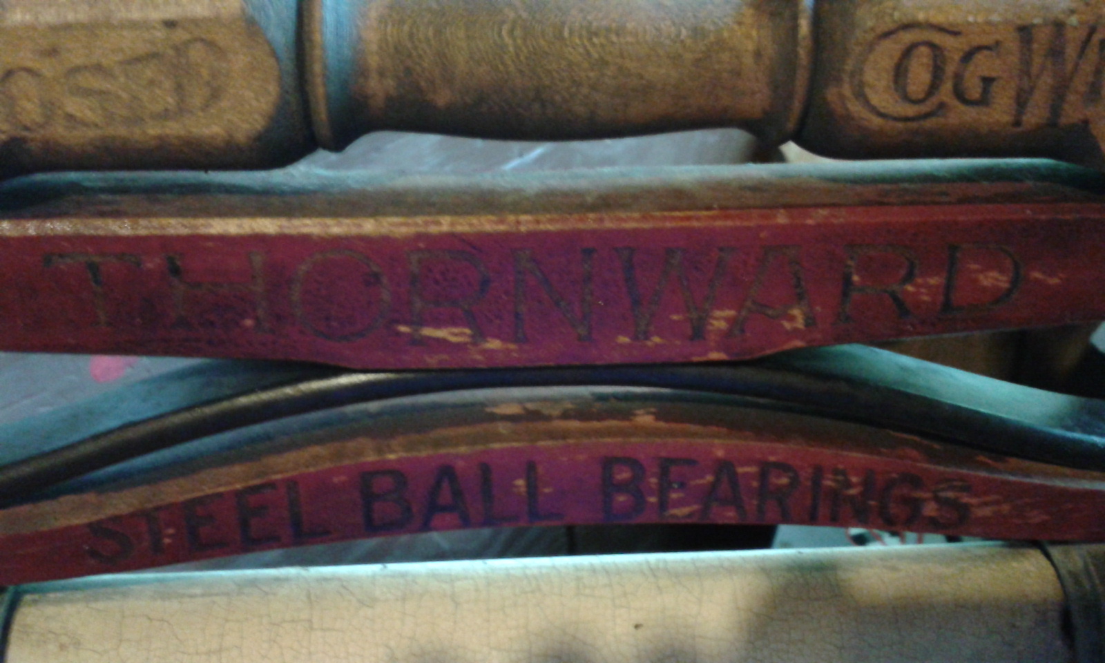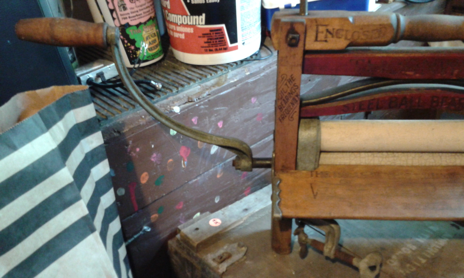 Thornward No. 790 wringer, enclosed cog wheels, steel ball bearings.  Moveable hinges on bottom (for round tub?)