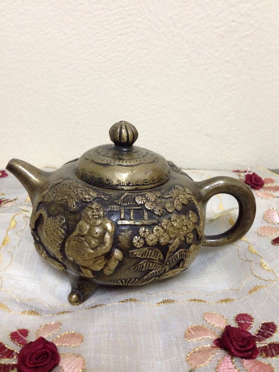 Three legged bronze teapot, carved figurane carry wine jar on the teapot. Unknown production year.