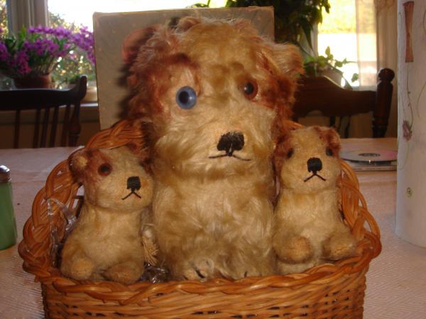 There is one larger dog and two smaller ones, my mom believes they are nestled in their original basket. No buttons in ear, but they do have tags. Maybe "Molly" dogs? Very much loved! Said to be bought in Germany after World War II, if I remember correctly.