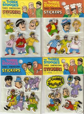 I have 19 packages of 3D Three Stooges stickers, each pack containing 4 stickers. The stickers are in 6 different print combinations. They are unopened and are held in a 6-pocket vinyl display case with a heading "The Three Stooges three dimensional stickers. 'They stick on anything!'" They are made in Taiwan, have a copyright date of 1980 to Norman Maurer Productions, Inc. and the product number is 3014.