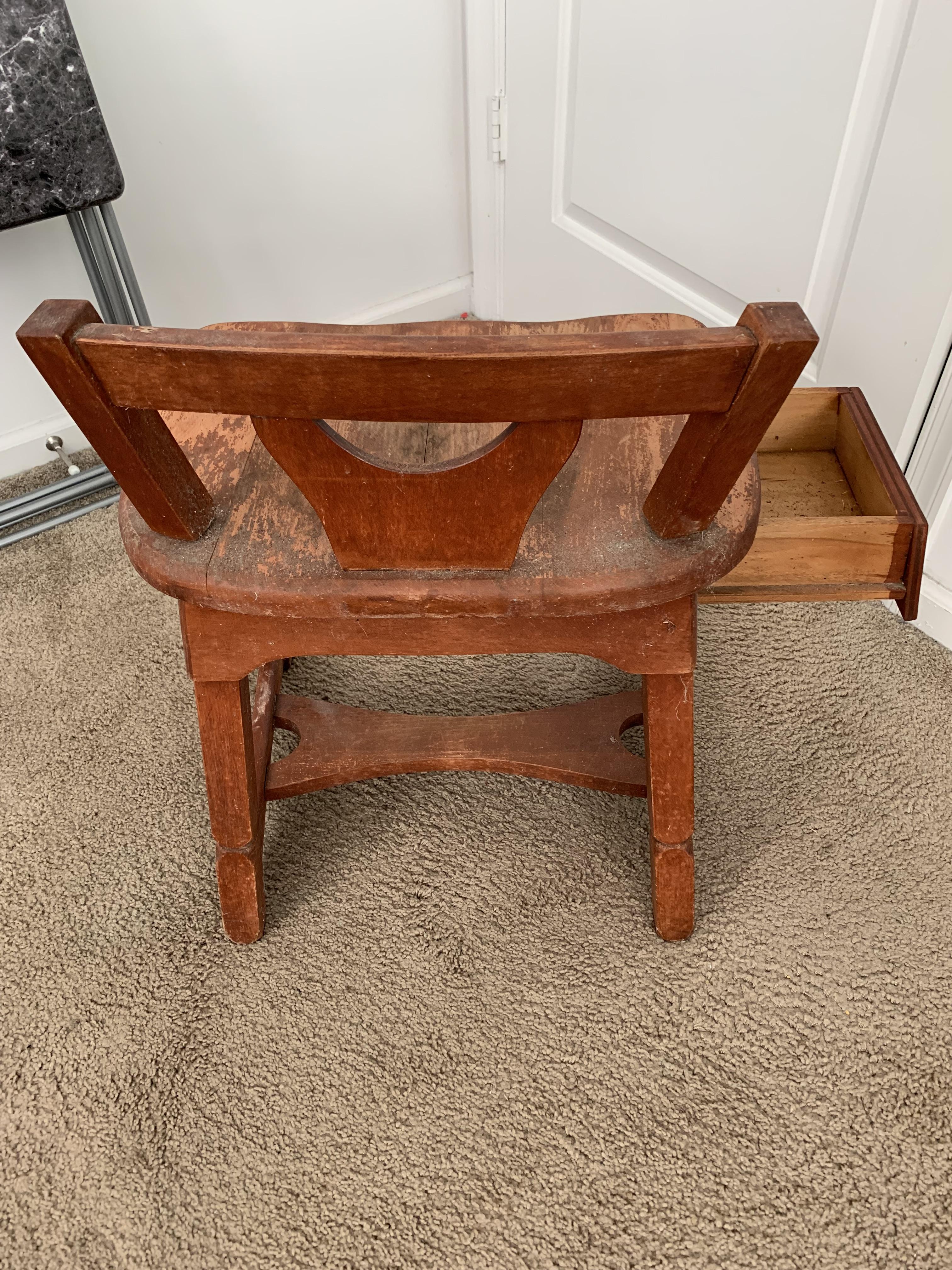 This appears to be a sewing chair. I can't find any real information online. Something similar was a Murphy Company Sewing Chair. No dating info found on photo.