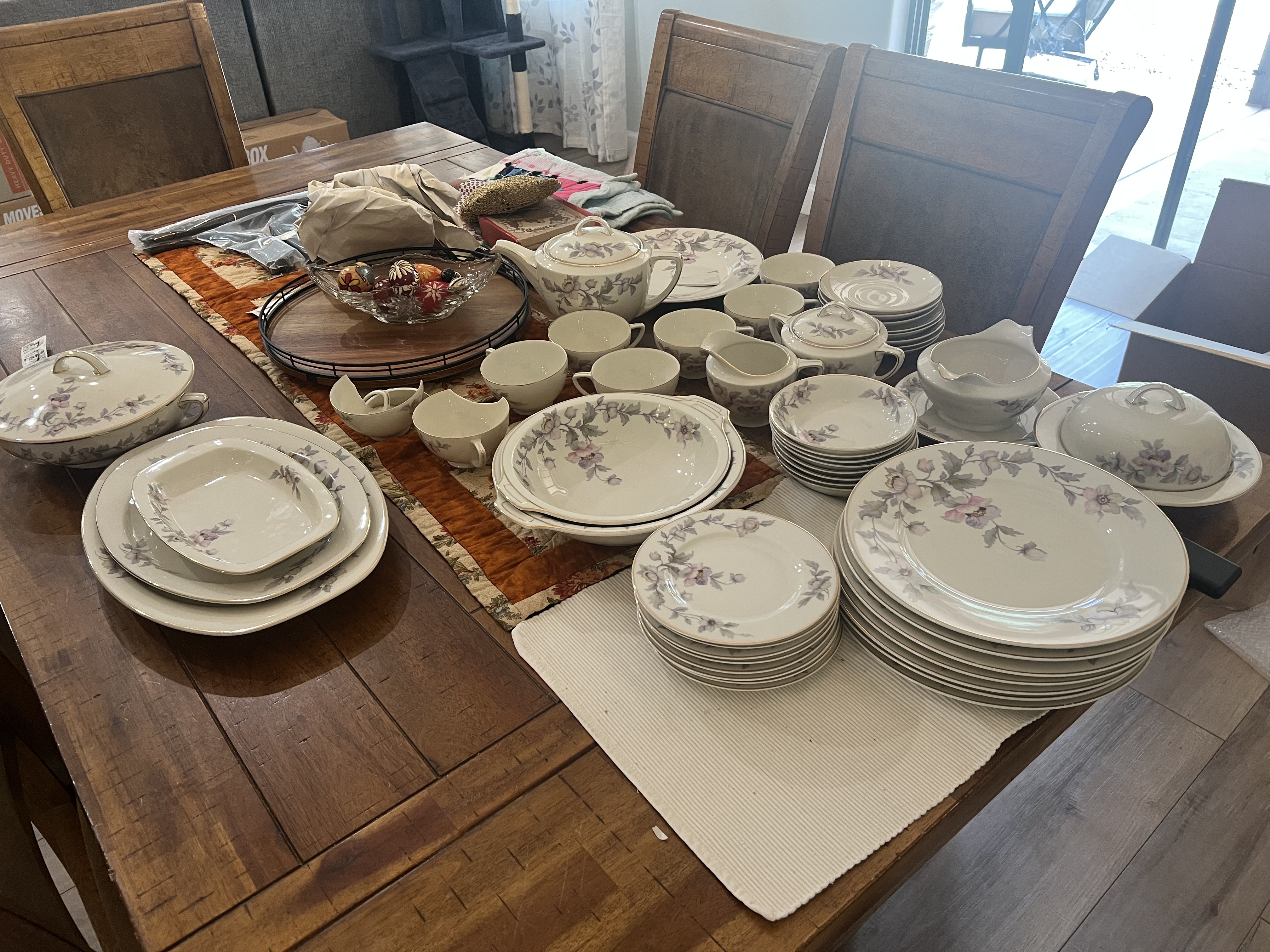 This china set from the 1940s features a cream background adorned with gold trim and delicate lavender and pink dogwood flowers. The set includes: