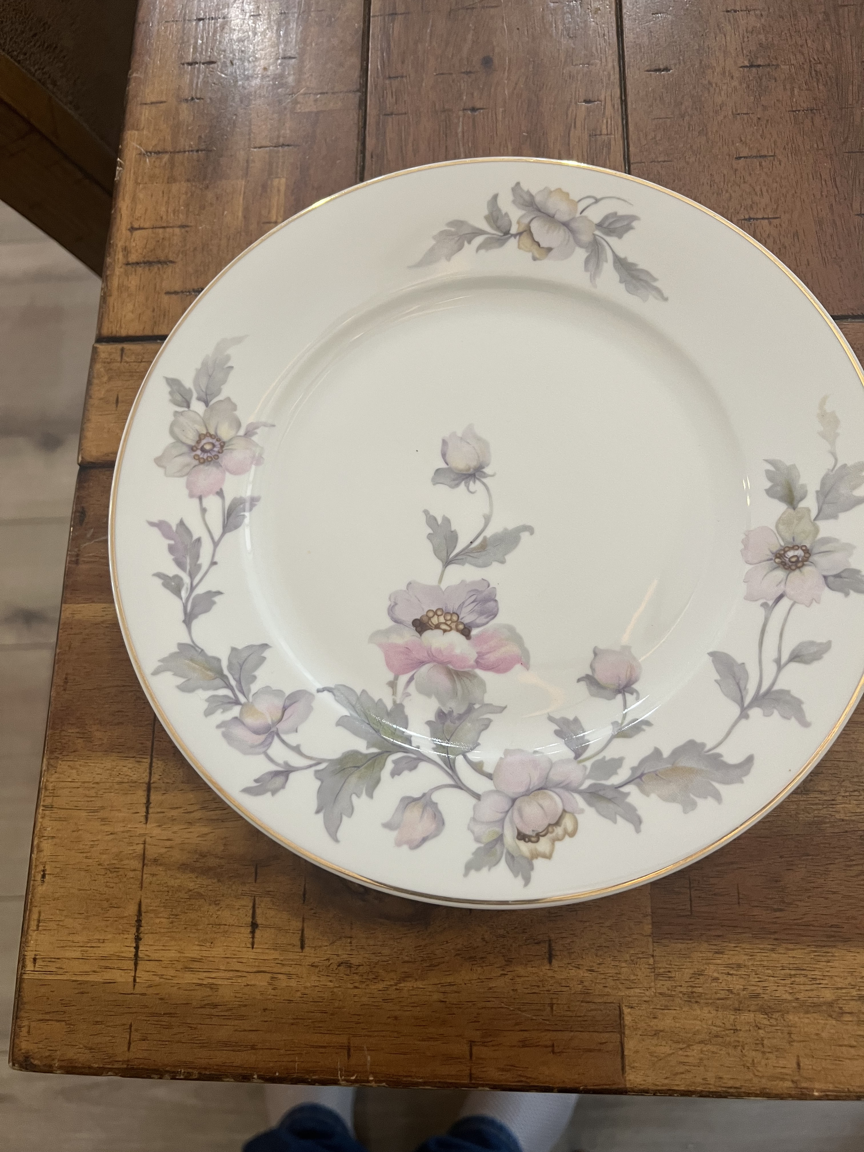 China set believe from 1940’s. Back stamp is crown , TK Thun, Bohemia , Czechoslovak.. cream background with gold trim, lavender and pink dogwood flowers. There are 7 dinner plates, 8 salad plates, 6 cups & saucer, 8 dessert dishes, various serving pieces. Items in very good condition. Gold trim shows some wear. No knife scratches. Flower pattern is all intact. No chips I have the 2 broken cups and broken plate.