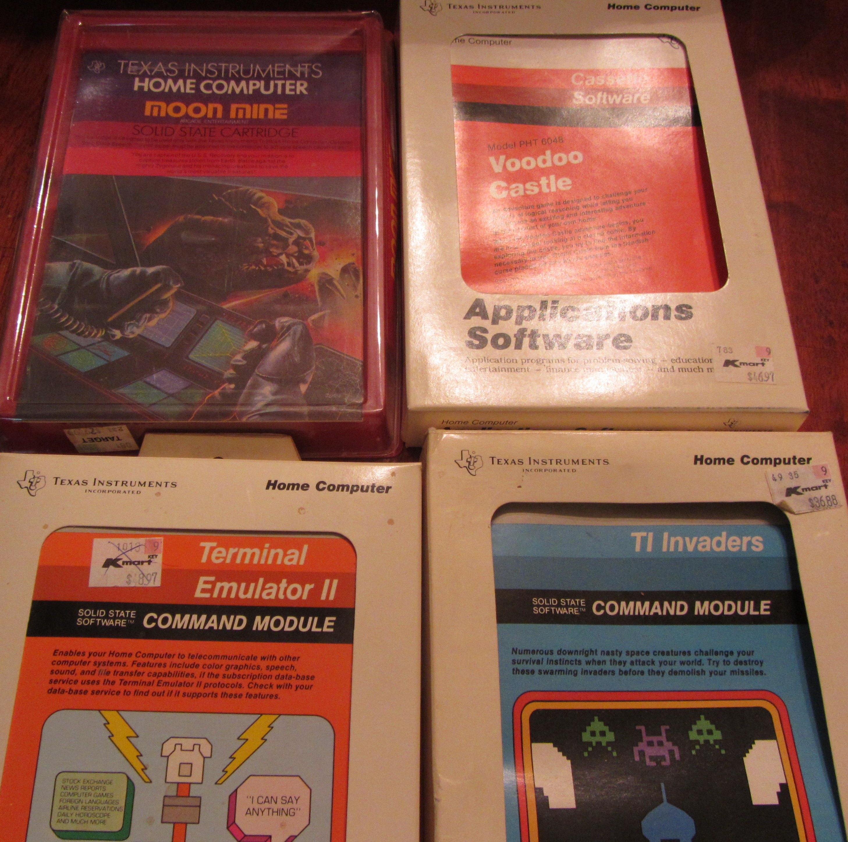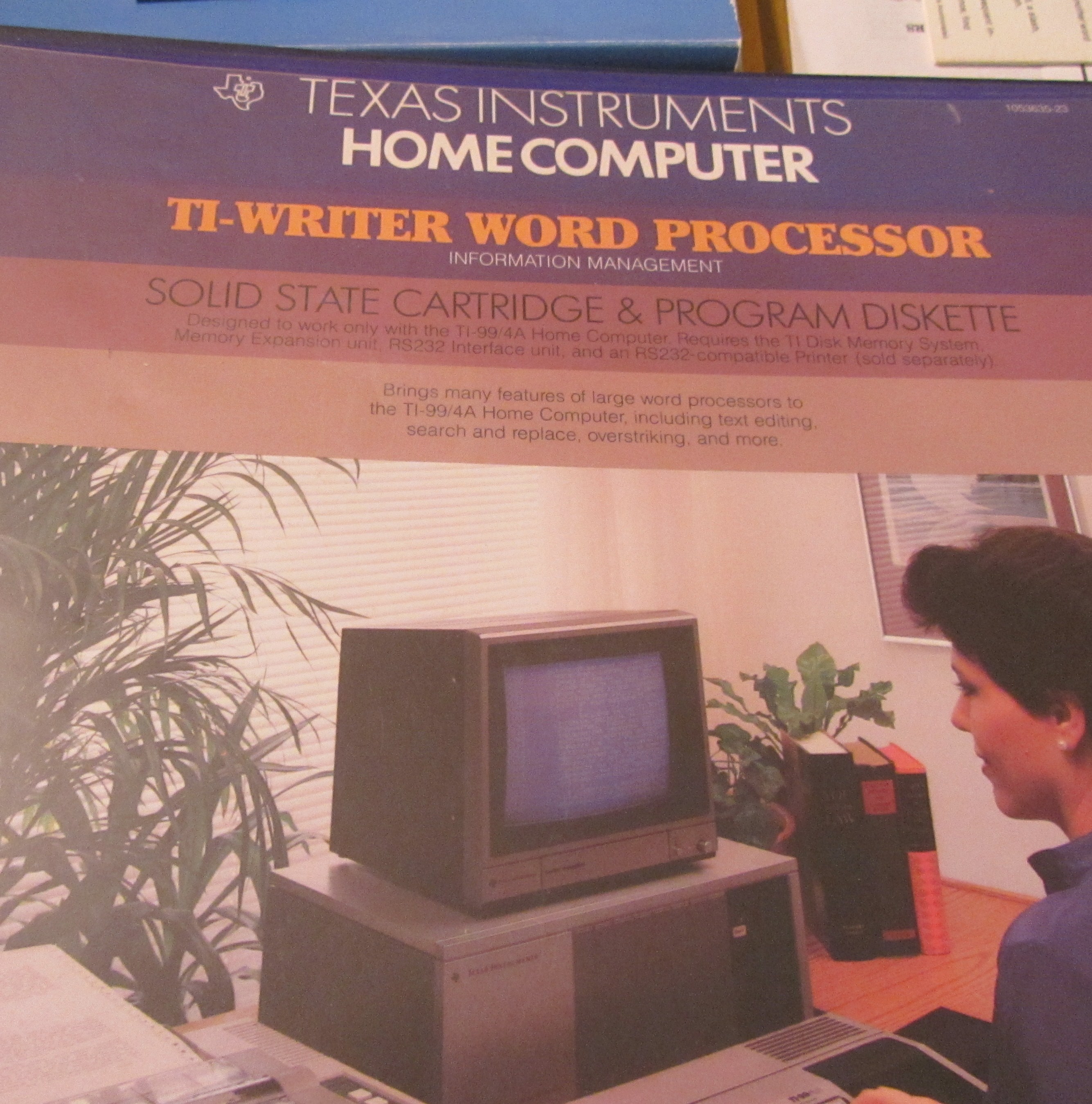 I have a complete TI99/4A computer, TI color monitor, TI99/4 Peripheral Expansion System, Speech Synthesizer, TI Writer Word Processor, Computer Prpogram Data Recorder cassette player, 2 Remote controller/joysticks, 10 Software games. All manuals intact. All games in boxes with instructions. All electronics work.