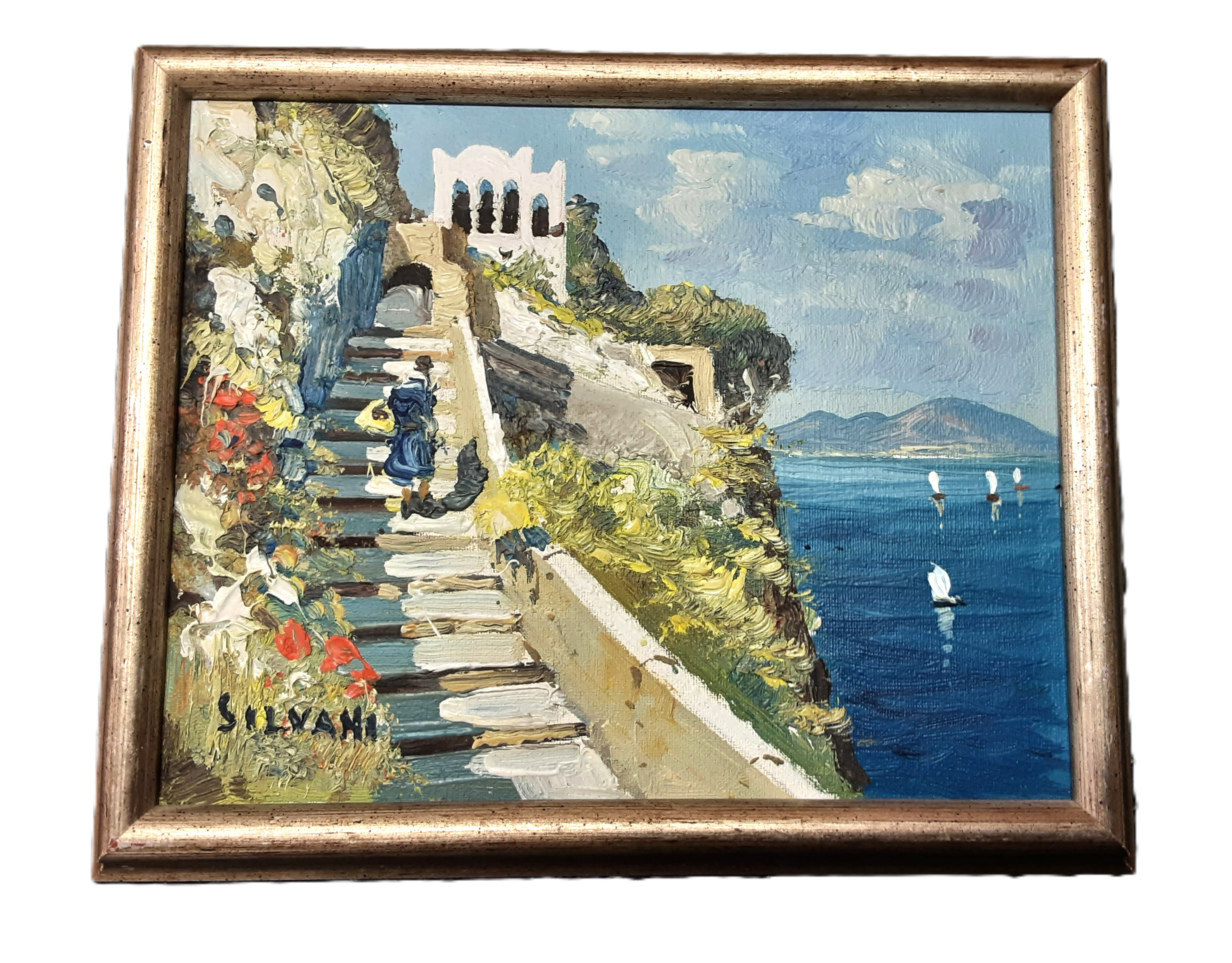 The work is signed Silvani, an Italian painter active during the mid-to-late 20th century known for evocative oil scenes of the Amalfi Coast, Capri, and southern Italy. Silvani’s signature and impasto technique match verified works sold by established auction houses.
