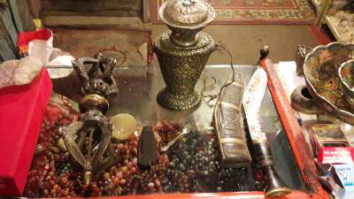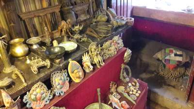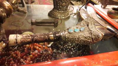 I was very taken with the items in the shop, including old Tibetan silverware, plates and silver walking sticks, spoons, plates, bowls, as well as bronze statues, old lanterns, wood masks, etc. Also a collection of Nepali craftwork, jewelry and precious stones. Including some curiosities such as as Tibetan pocket knife from around 1840, a bronze lantern, wire work and religious artifacts. Also gemstones and Tibetan quarts. Also conch shells and musical instruments, all antique.