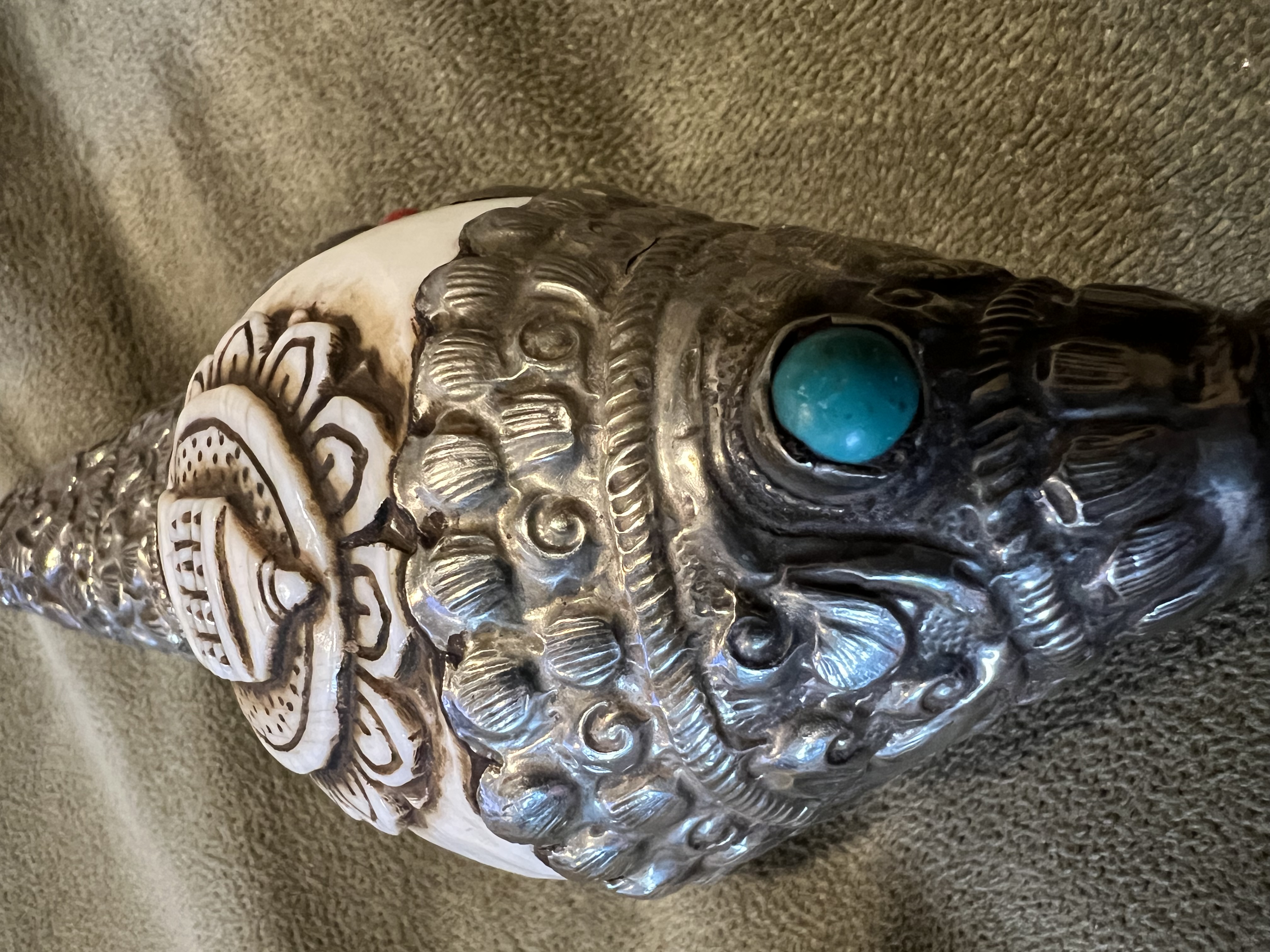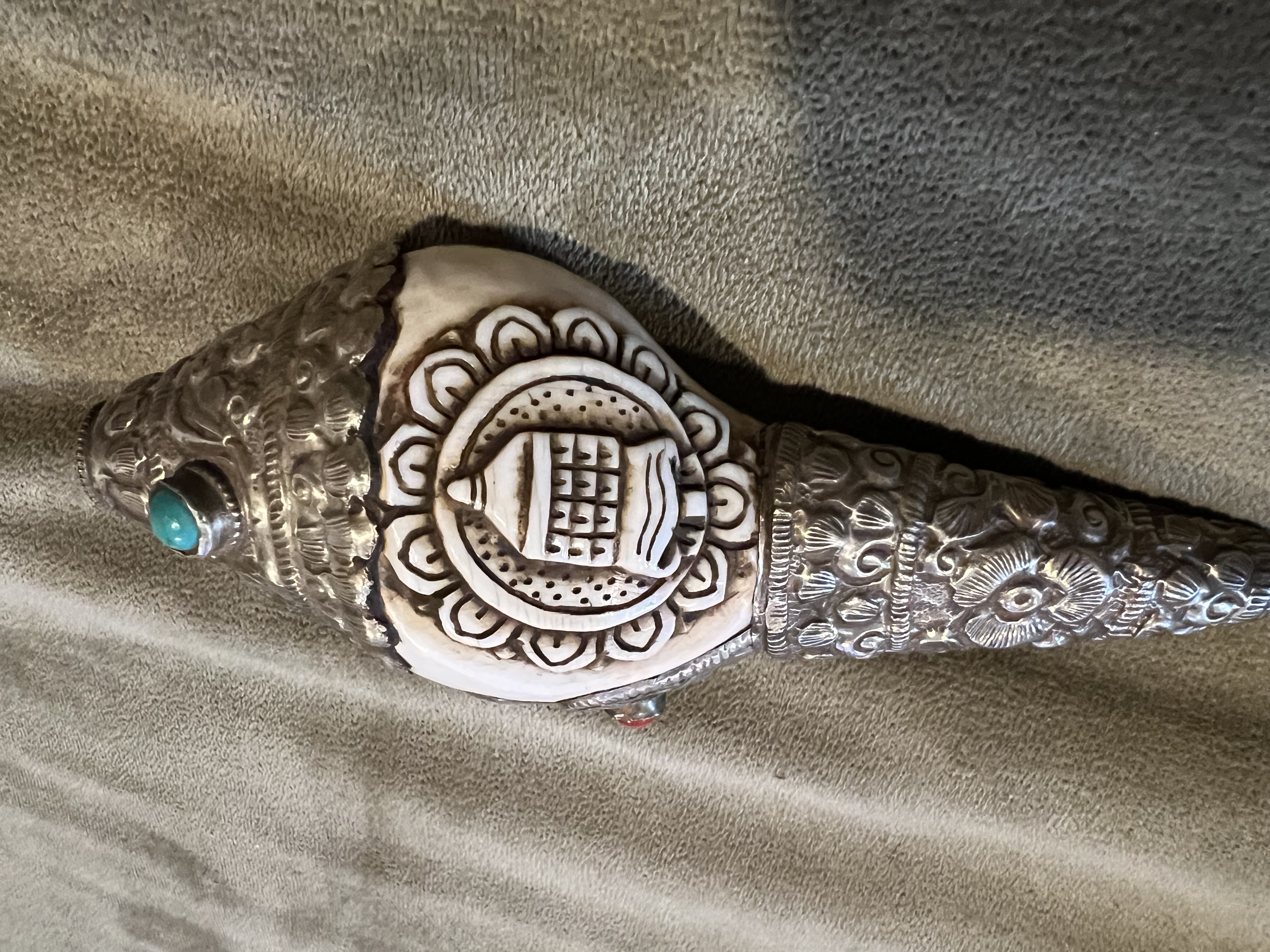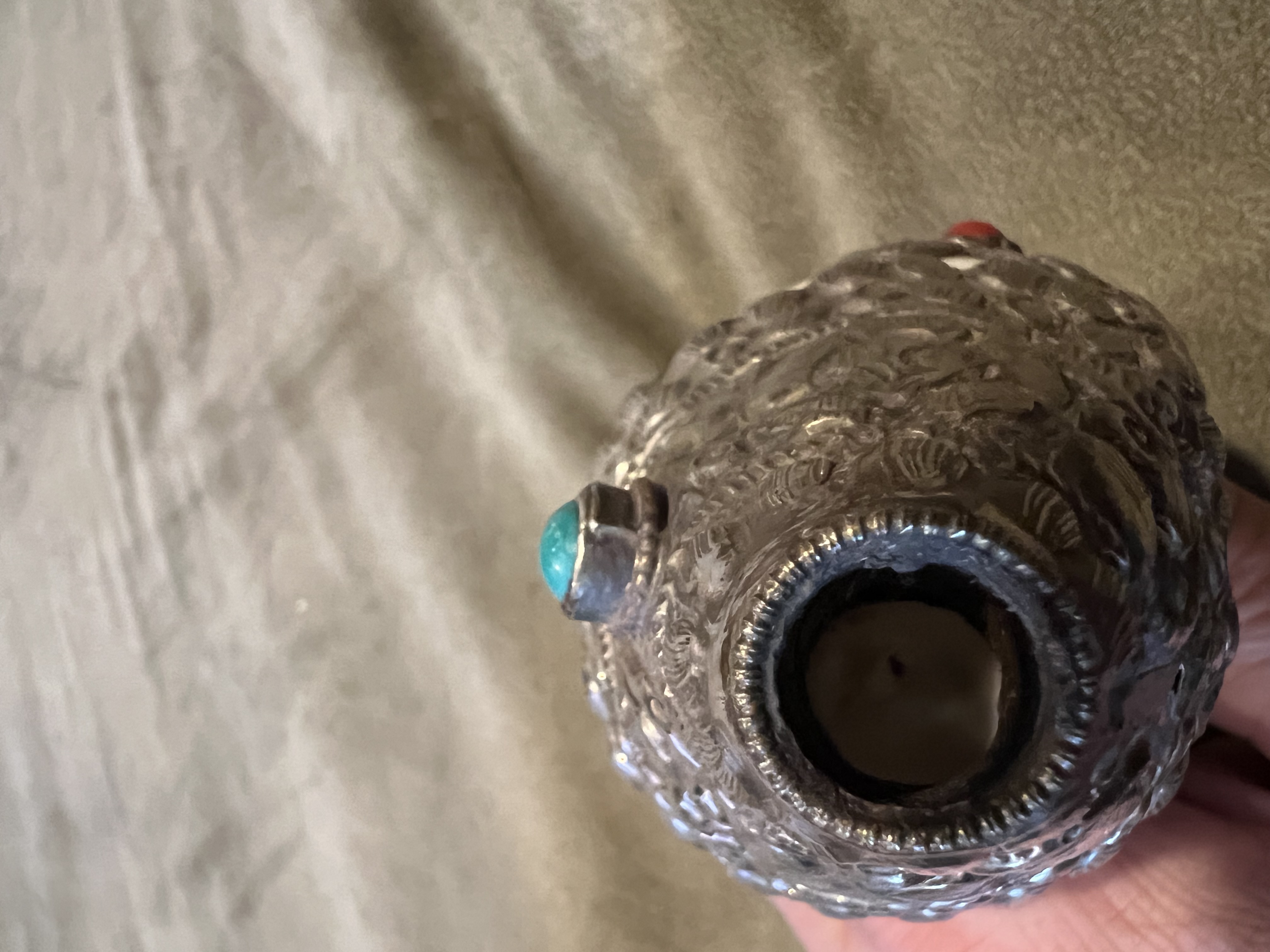 Tibetan Buddhist Dung Car. Made by Traditional Tibetan Artisan. Dating to 20th century. Materials: Silver, Turquoise, Coral. Estimated value: $150 – $300. Condition: Very Good. The market for Tibetan artifacts is moderate, with steady interest among collectors.