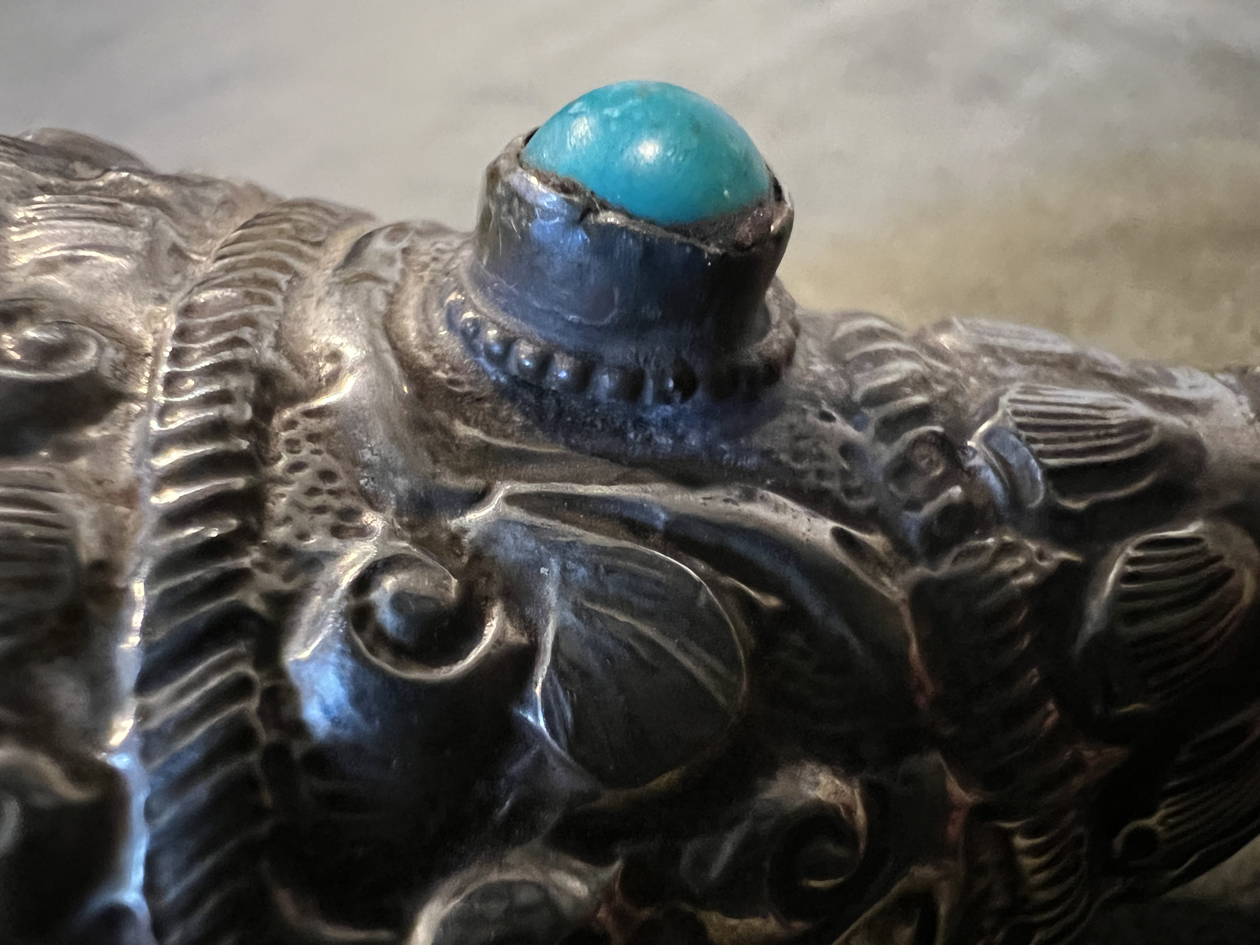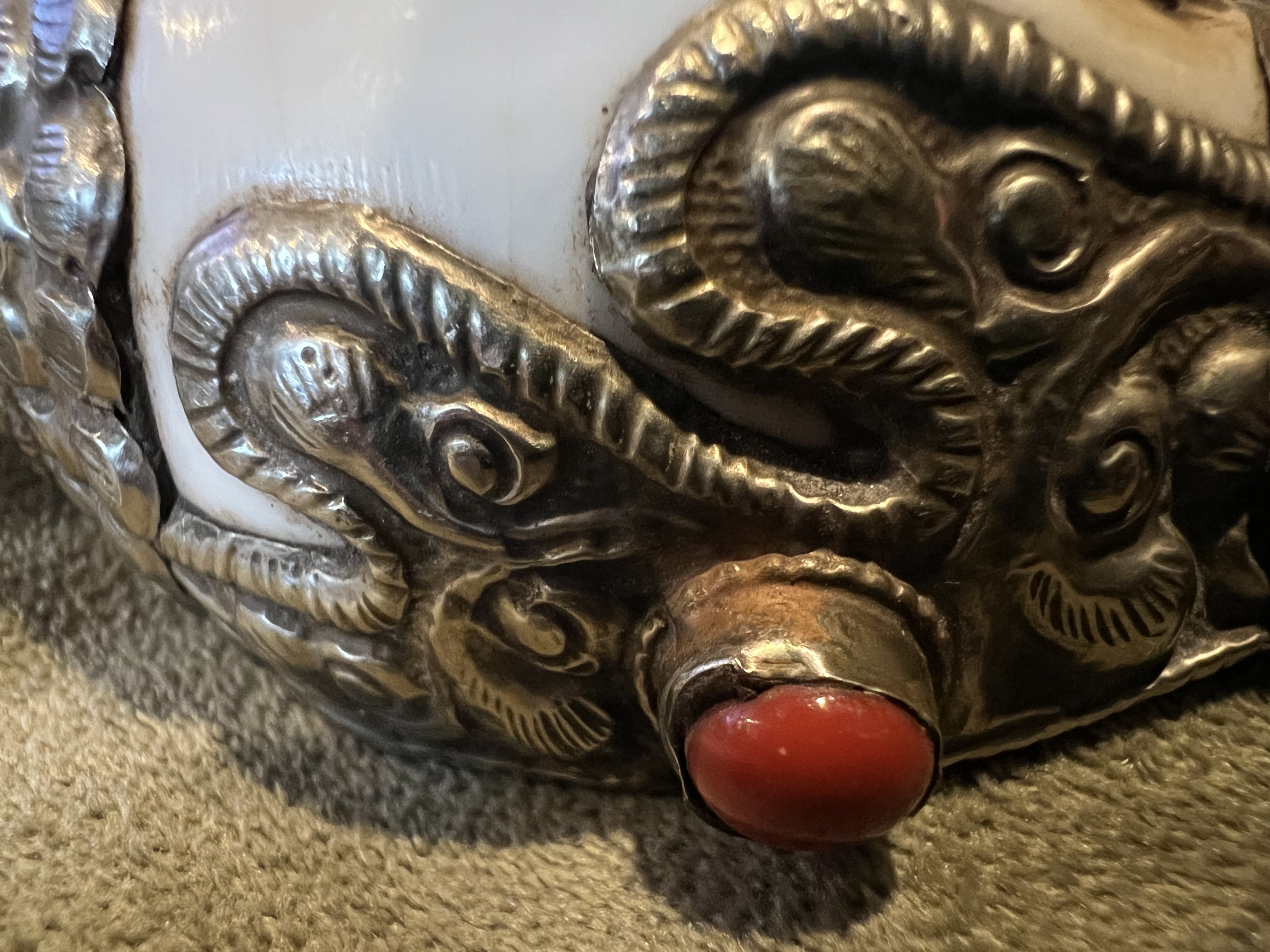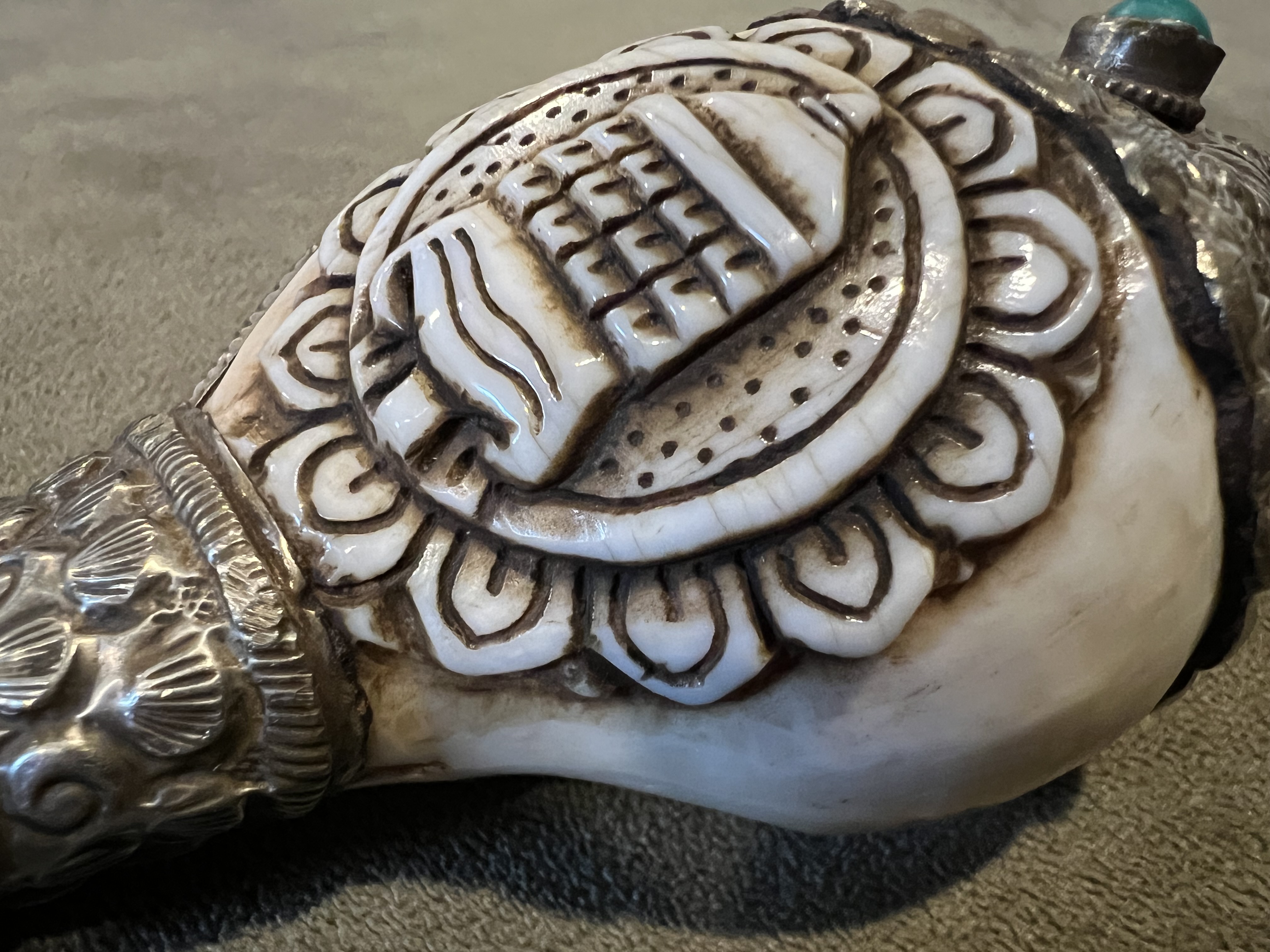 Tibetan Buddhist Dung Car. Made by Traditional Tibetan Artisan. Dating to 20th century. Materials: Silver, Turquoise, Coral. Estimated value: $150 – $300. Condition: Very Good. The market for Tibetan artifacts is moderate, with steady interest among collectors.