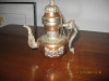 pewter with detailed engraving. 13" tall. only mark is an asian symbol on bottom. elaborately engraved. non- magnetic