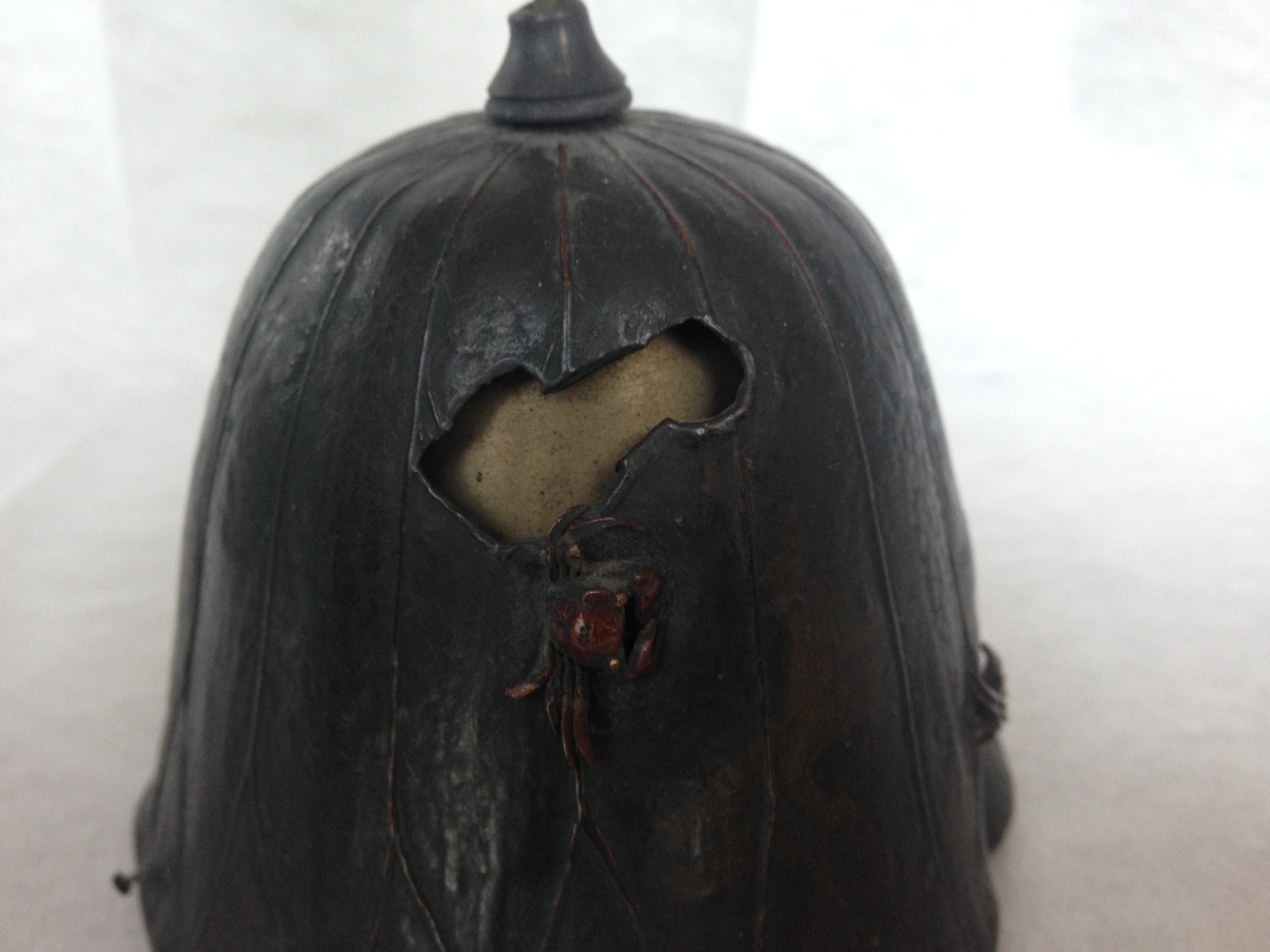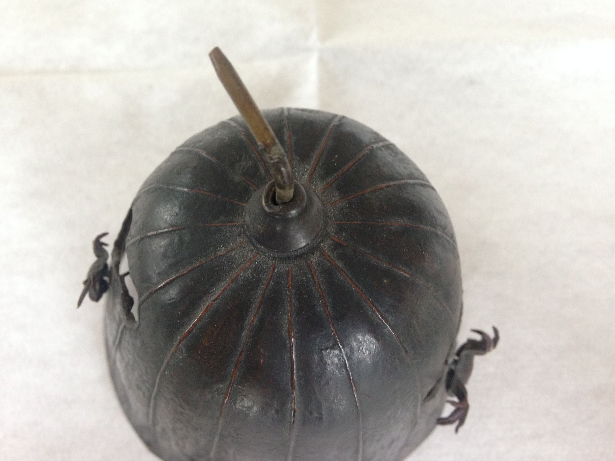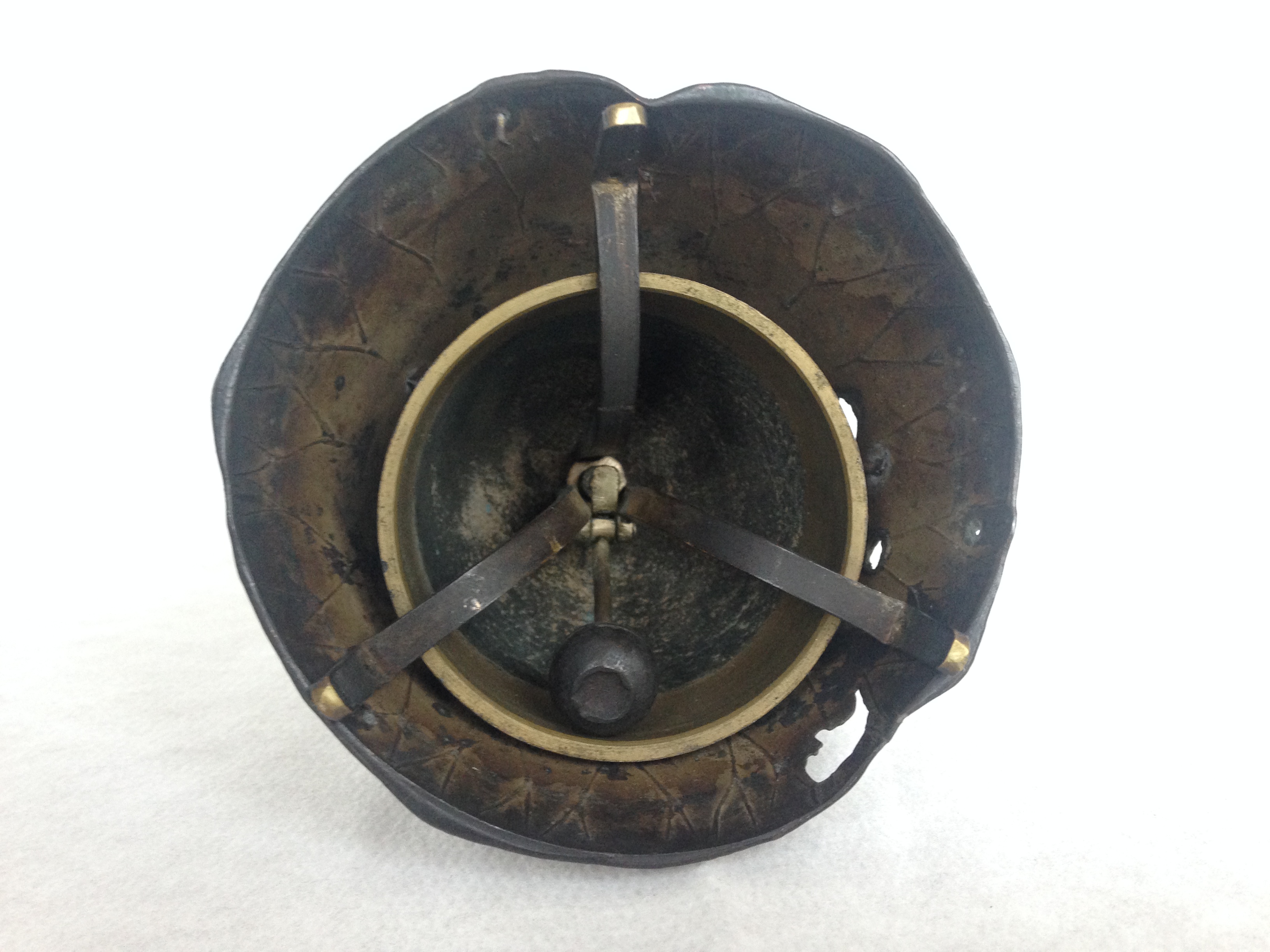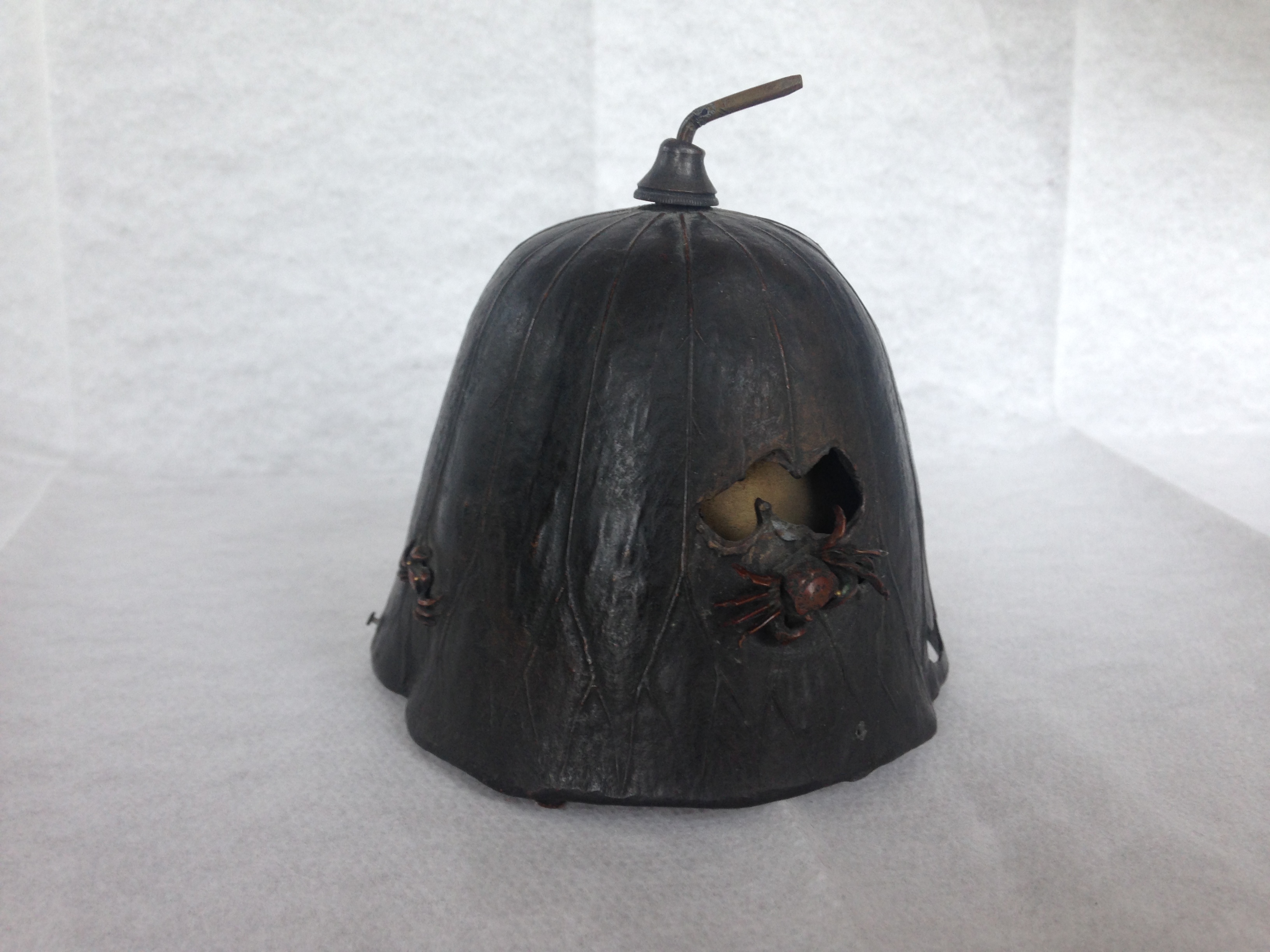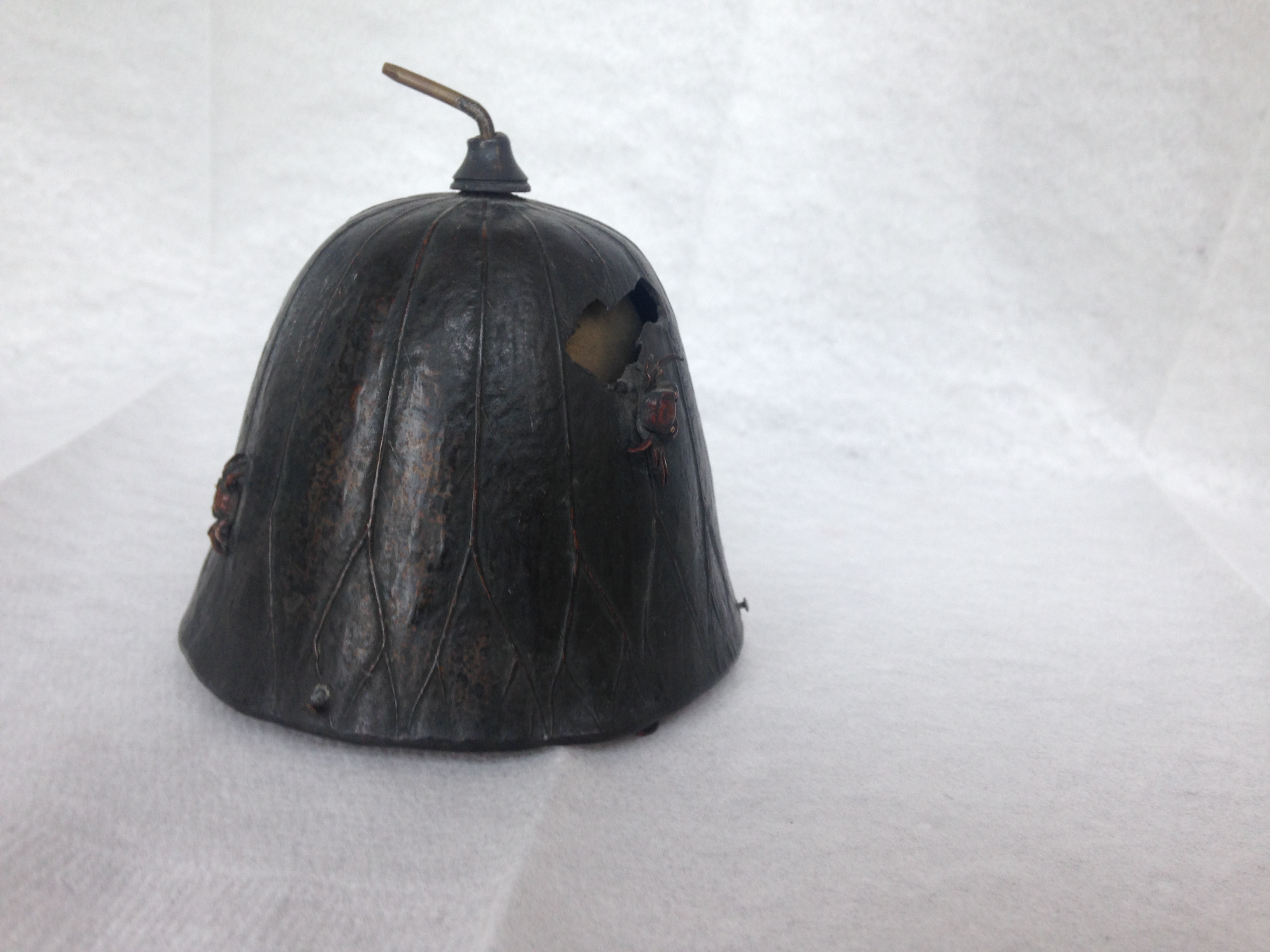 I am attempting to find the value of this piece for a woman in her 80's. Her deceased aunt was the previous owner. She believes it was made by Tiffany. The exterior bell shape has edging and veins reminicent to that of a leaf, with intensionally placed holes that appear to have been 'eaten' by the adjacent crab to each one. There is also a bird that was fixed to the top where one was intended to push for the sounding bell. The bird is present but needs to be re-soldered into place. The metal appears to be brass? The sound is excellent.