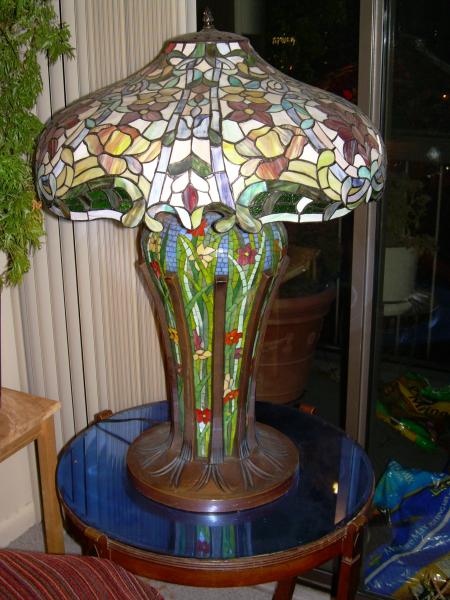 This is a tiffany style lamp with a base that is entirely covered with mosaic glass. I have attached a picture below.