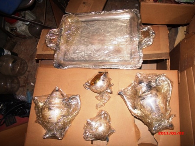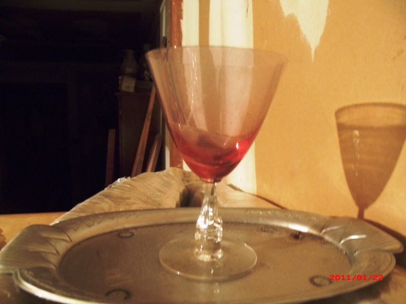 Parfait glasses (6) purple bottom, clear glass near top. Water goblets (6) same color as Parfait,(6) Wine Goblets (6) luncheon plates Purple and I believe a Salad bowl Purple and clear it starts out narrow at the bottom then come out into a flower top. WM Rogers Eagle serving set with tray in the original box