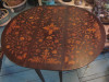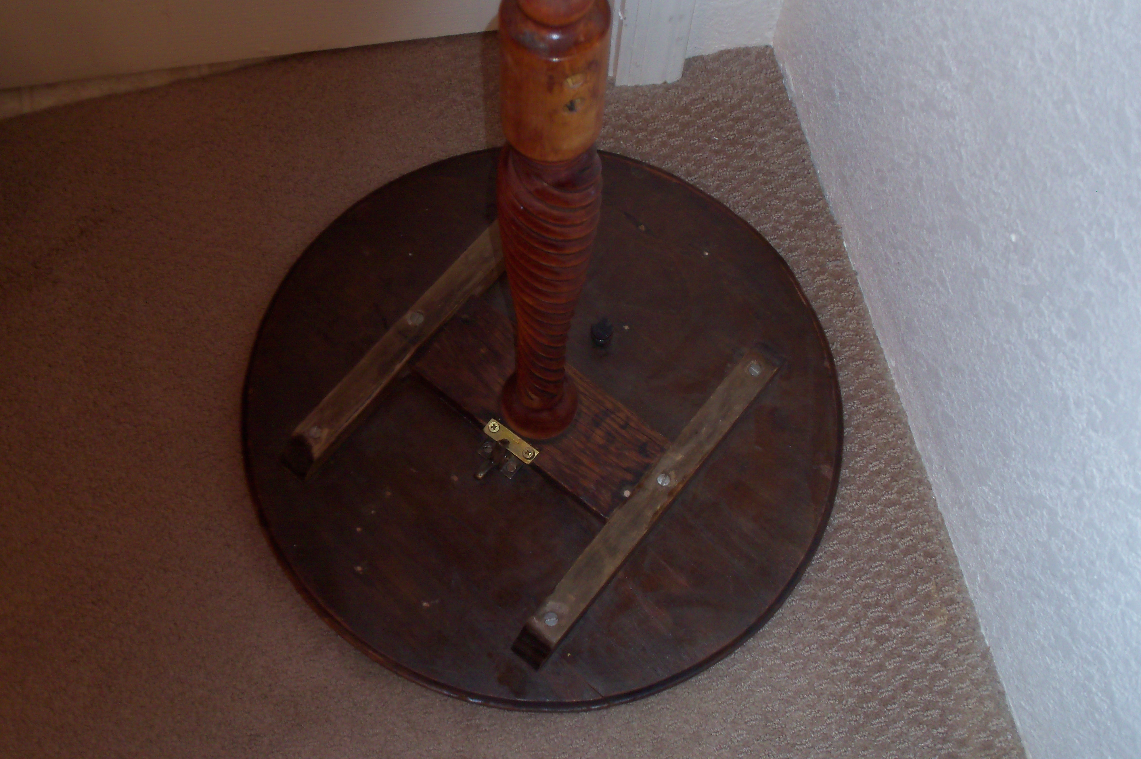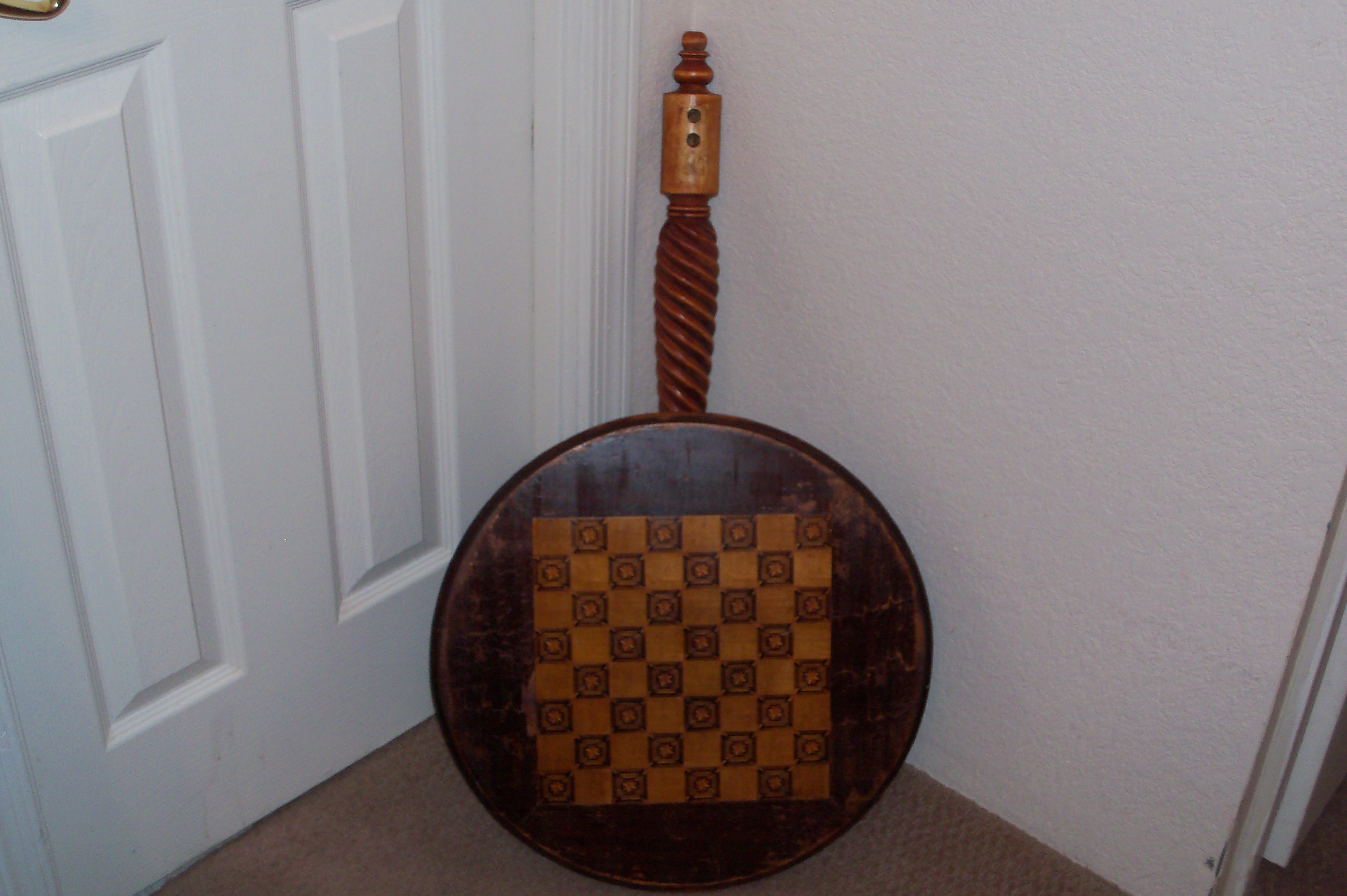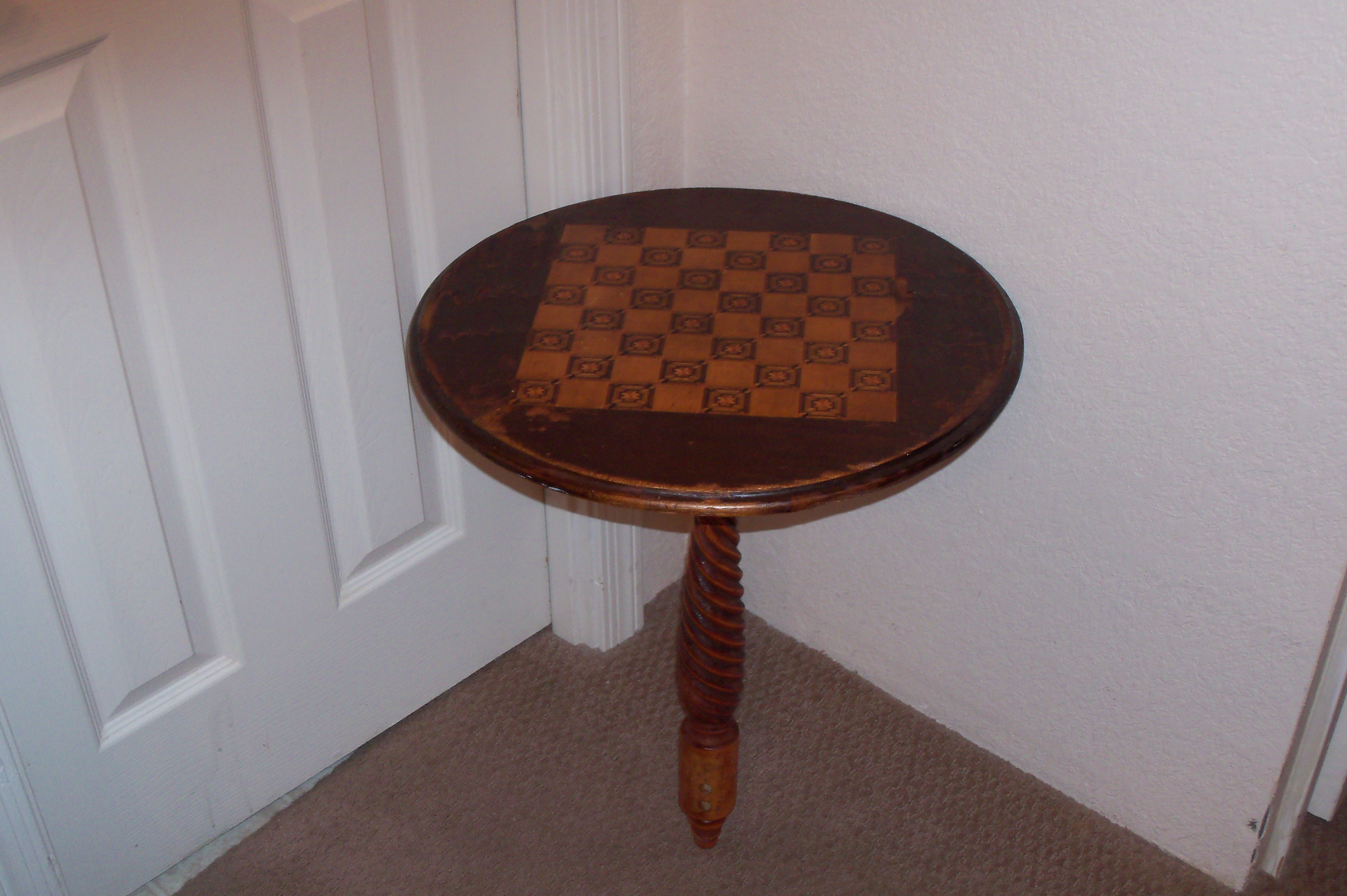 18" Round top with very detailed checkerboard pattern done in inlaid wood. Top tilts for storage against wall when not using.T hree original feet missing. Wood made from a hardwood.
