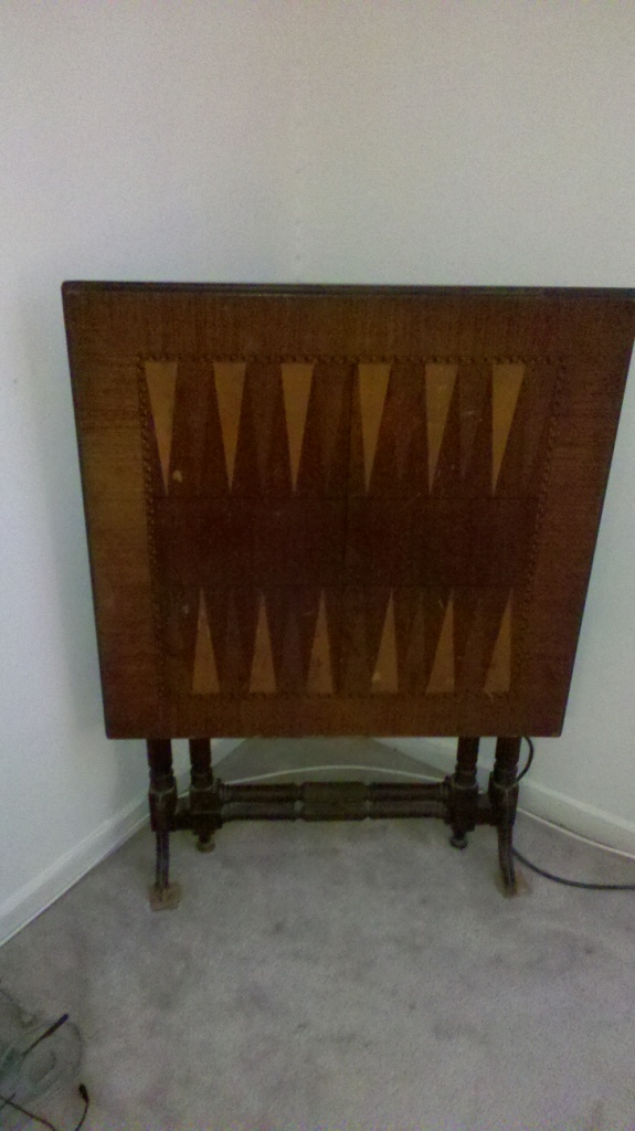 This is a tilt-top wood backgammon table that belonged to my grandmother. She was originally from Boston, Mass and relocated to Baltimore, MD in the early 1950's. I have not been able to locate any information after months of searching on the internet. Any help with information on the origin, value and age of the piece would be greatly appreciated! Thank you so much!!!!