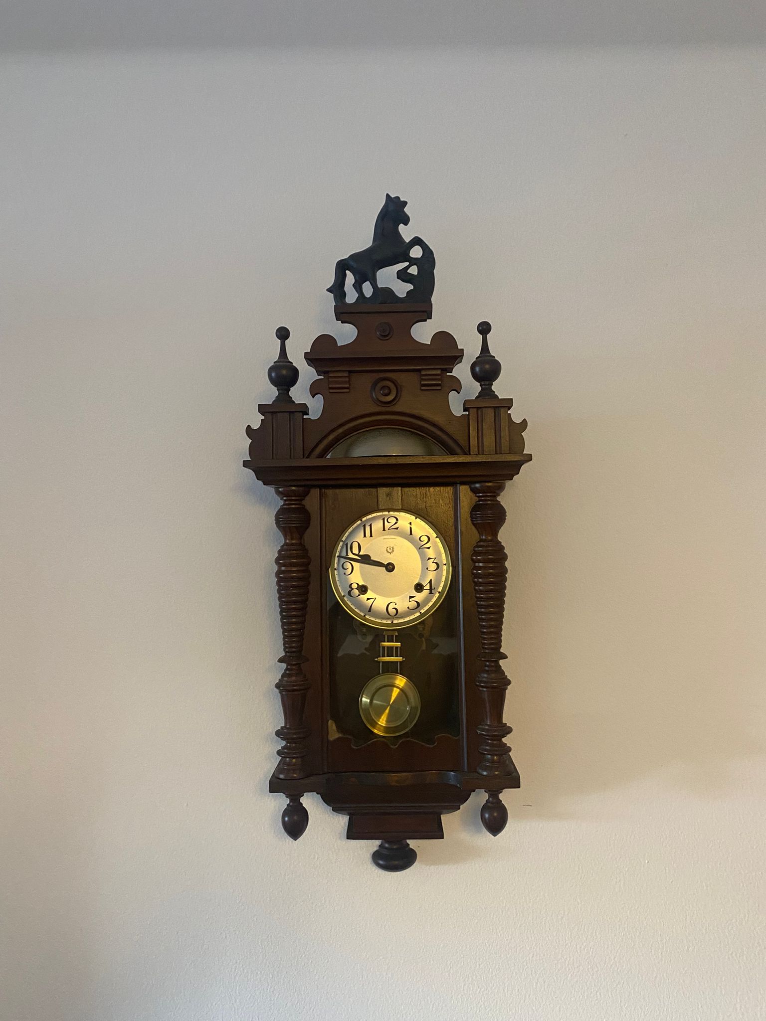 Physical Description: This is a vintage wall clock made of dark wood, featuring a decorative top with a horse figure. The clock face is circular with black numerals and a brass-colored center. The clock has a pendulum visible through a glass panel. The overall dimensions are approximately 30 inches in height and 12 inches in width. The clock is marked with a label on the back indicating it was made in Portugal.