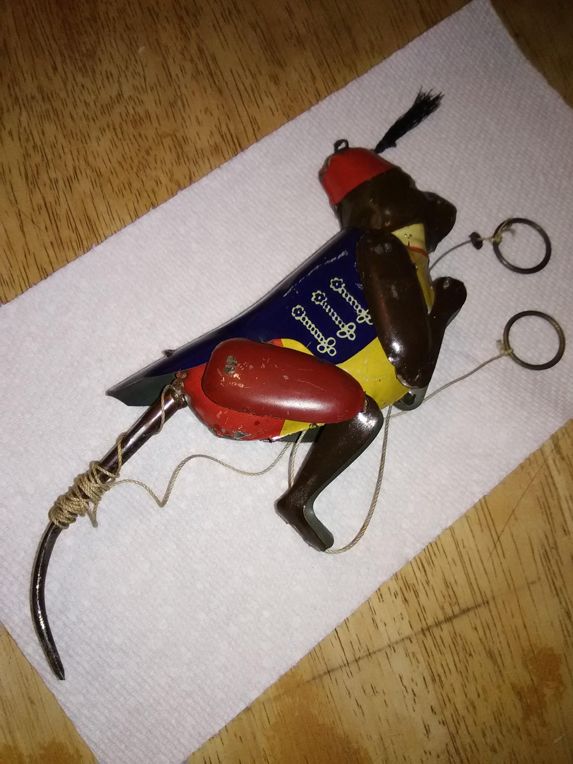 This came from the attic of a home built in 1901. All I was told is that it has all the original parts, including the tassel in his fez. It is in good condition and works (i.e. climbs).