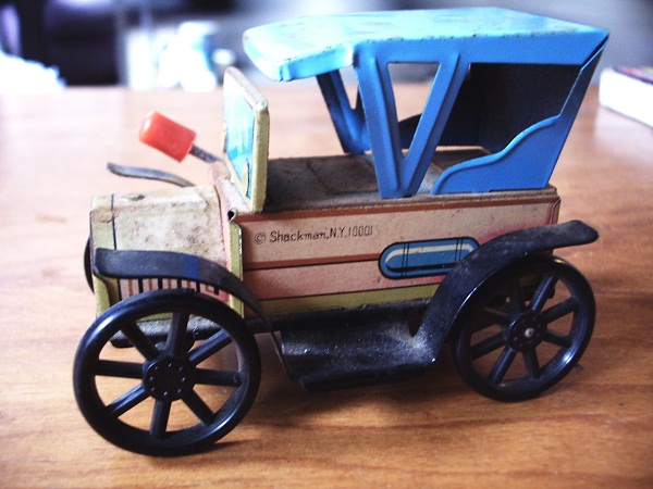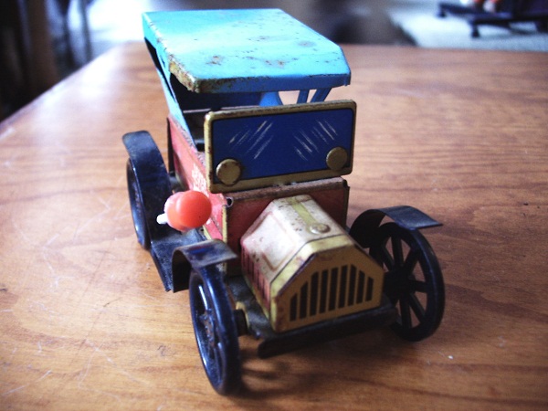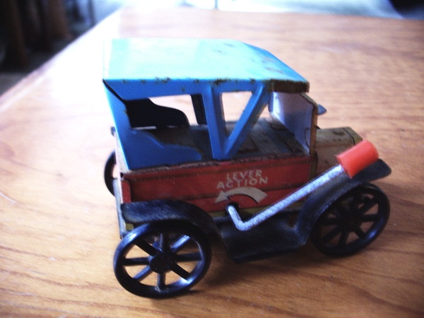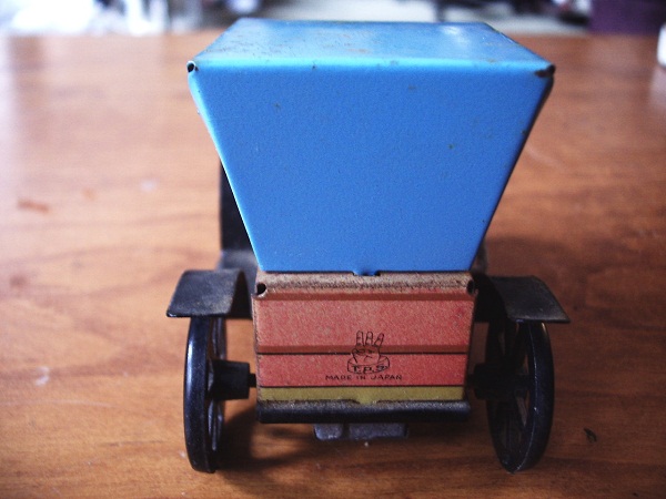 This tin truck is about 4" long and 3" tall. It has a lever on one side that, when pulled back, winds the rear wheels and it is self-propelled. This feature works perfectly.