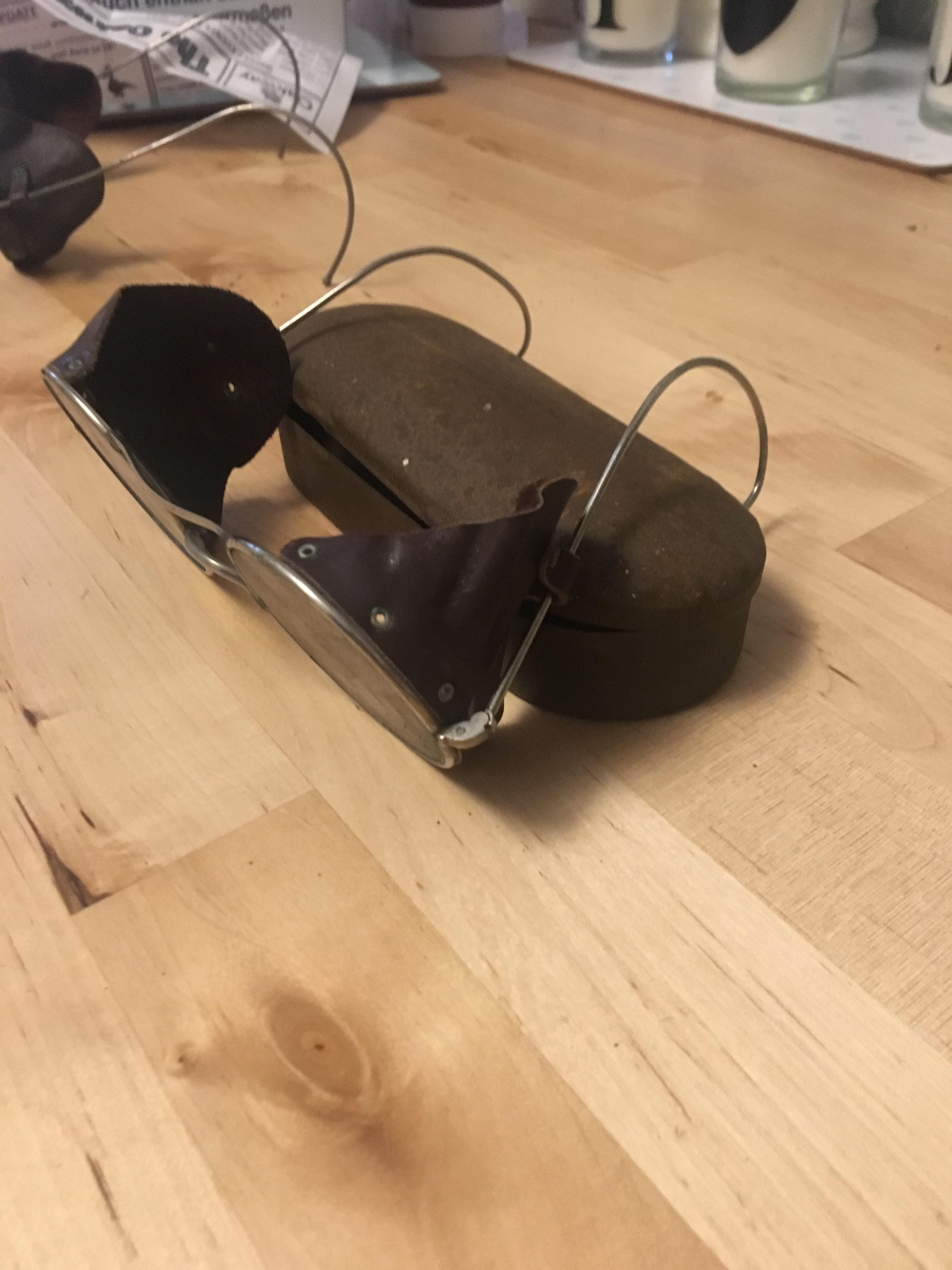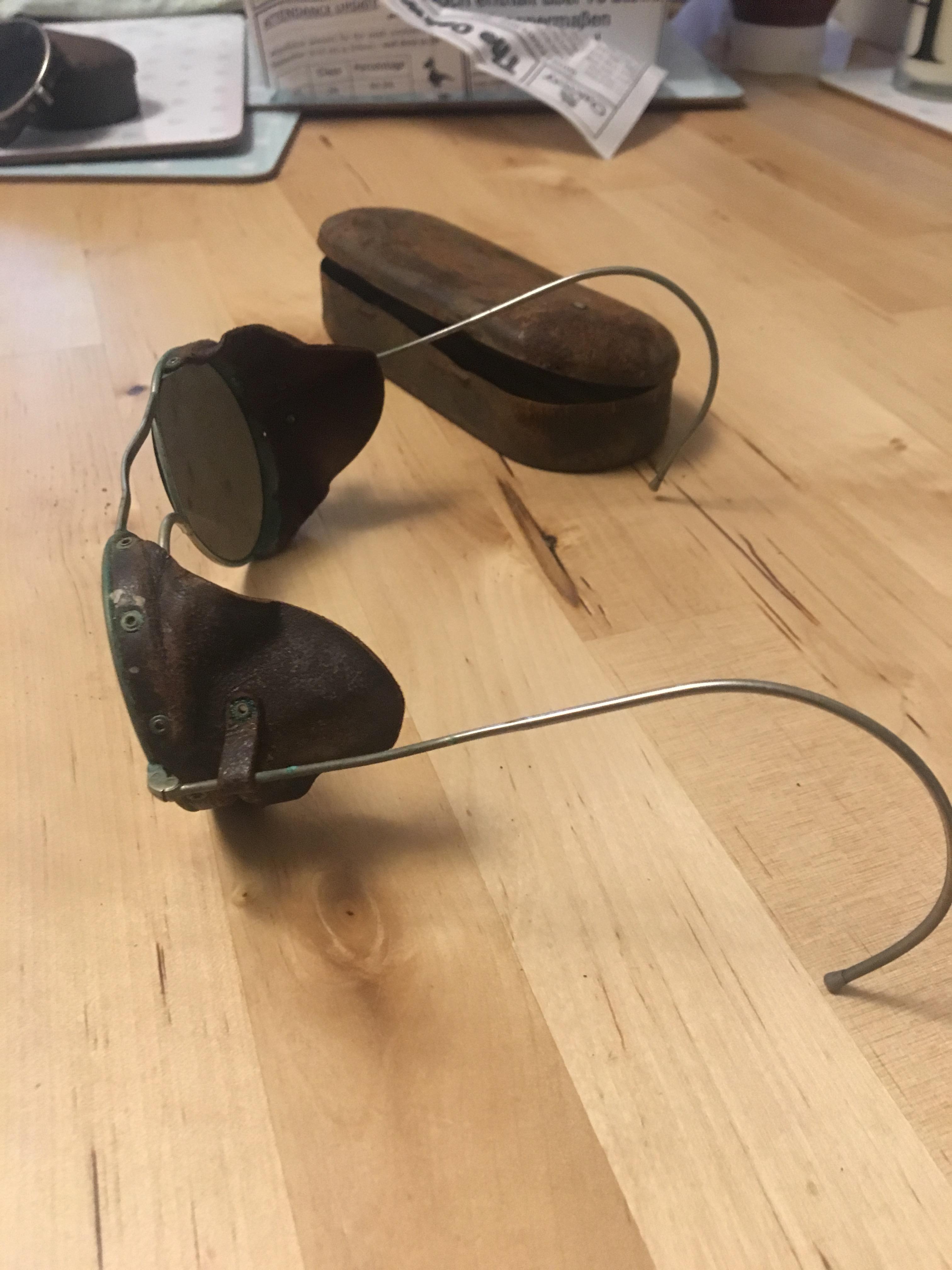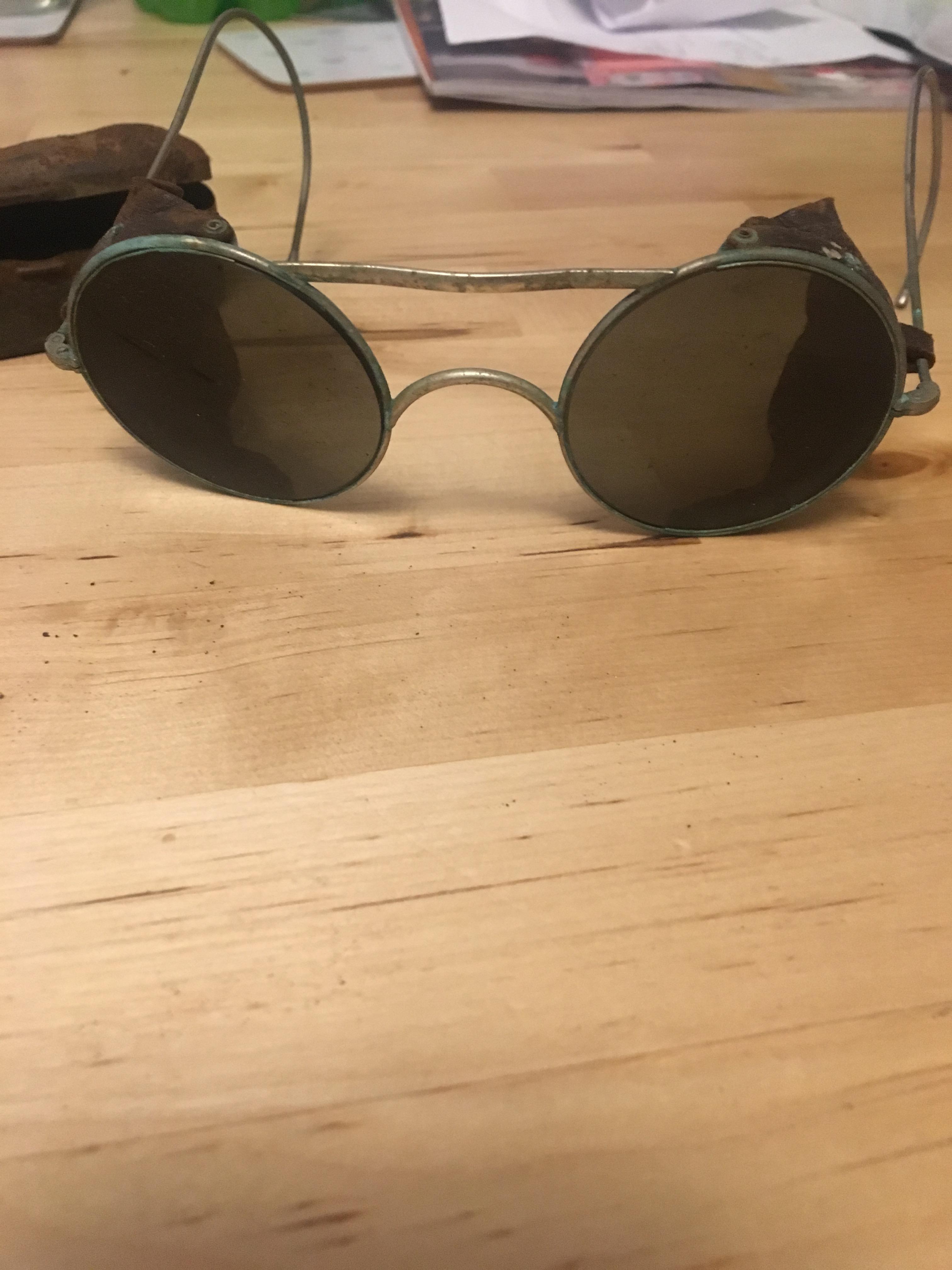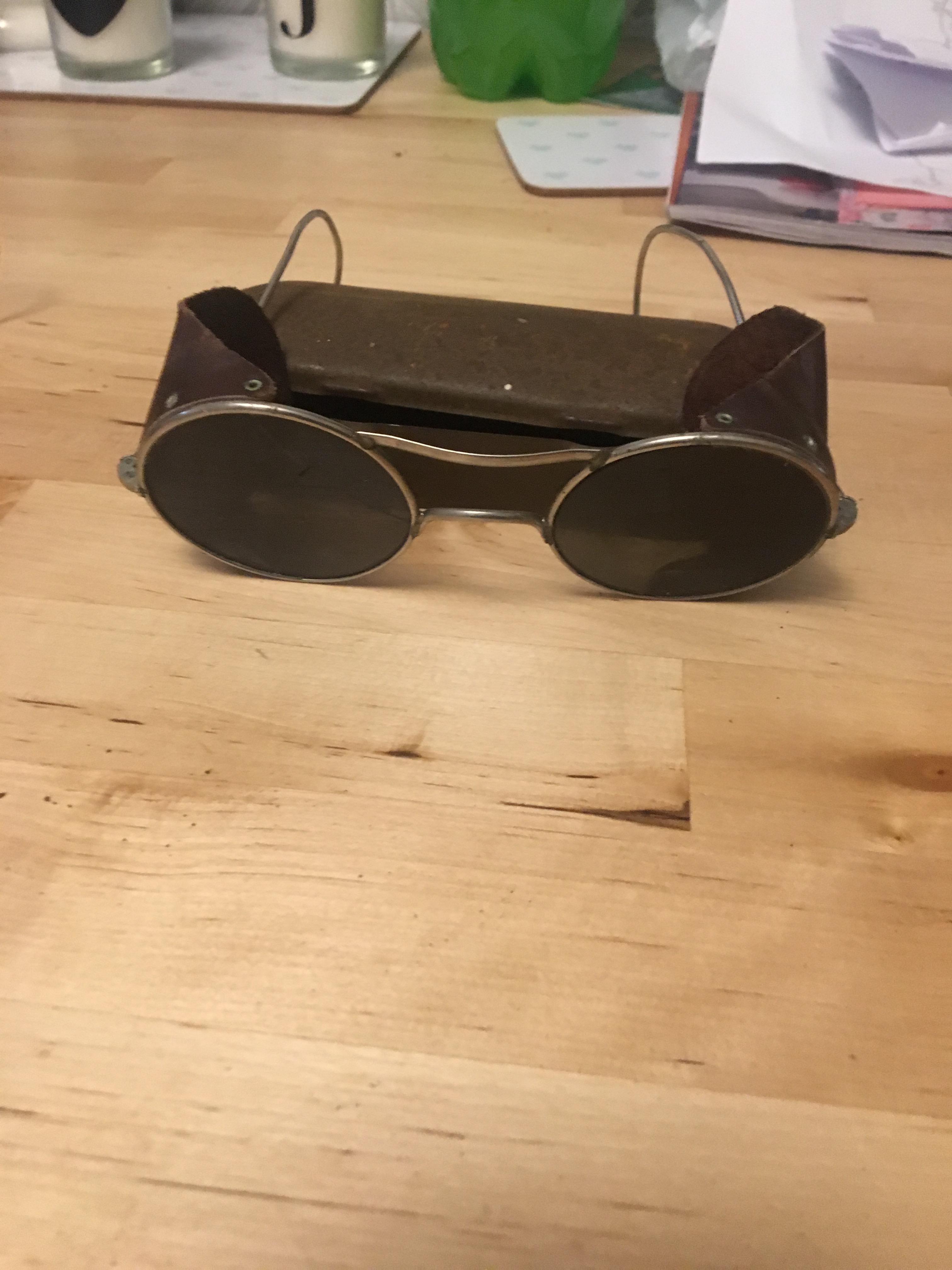 I was wondering if you could give me some information and even a valuation on some tinted spectacles/sunglasses that I discovered at the weekend while helping my Nan go through my late Grandpa's shed. I don't know anything about them really so would love to know if you can help? There is 2 pairs complete with metal cases. The cases are quite rusty and one pair has a crack in the lense. I have attached some photos. Any info you can give would be appreciated.