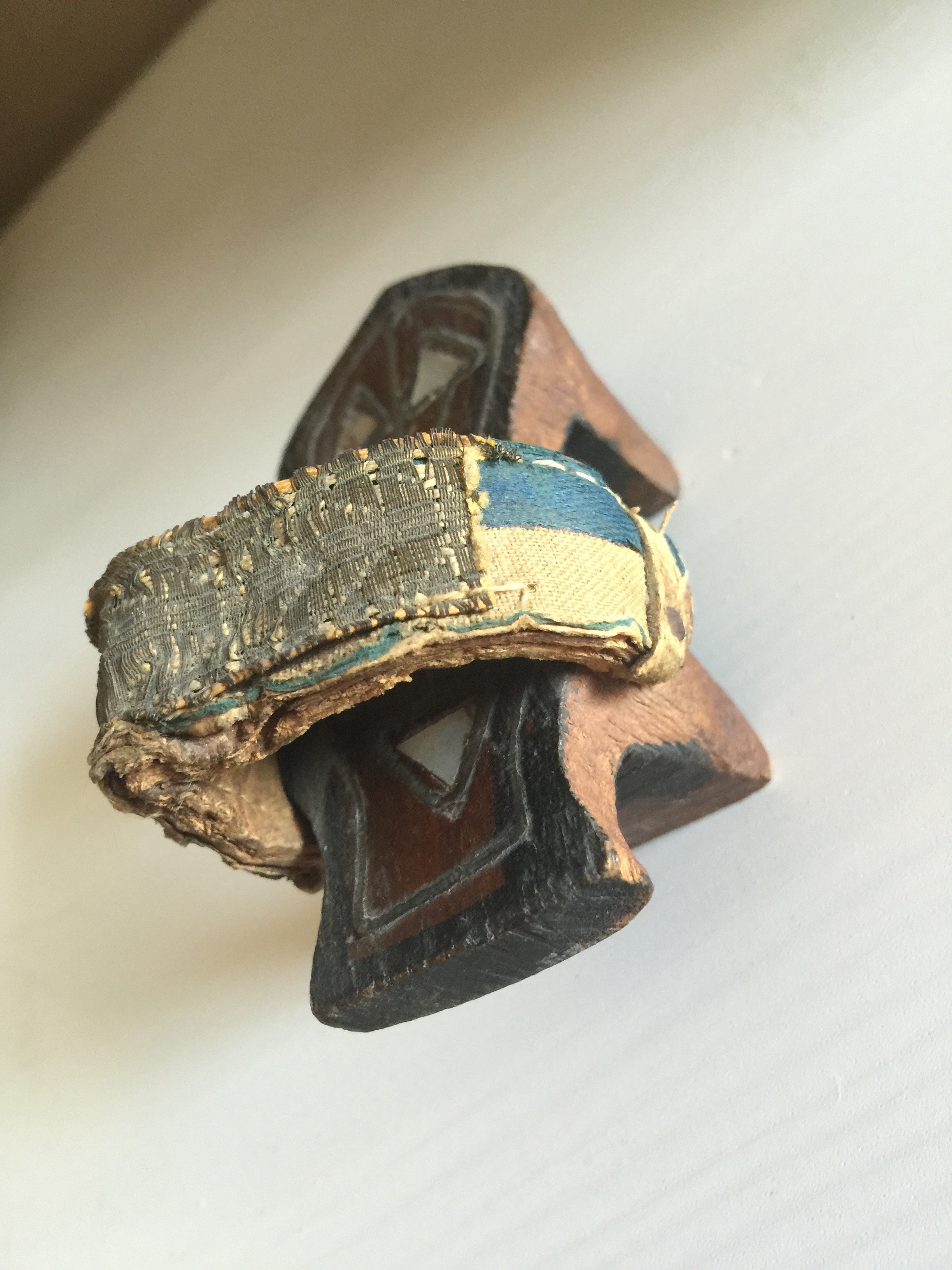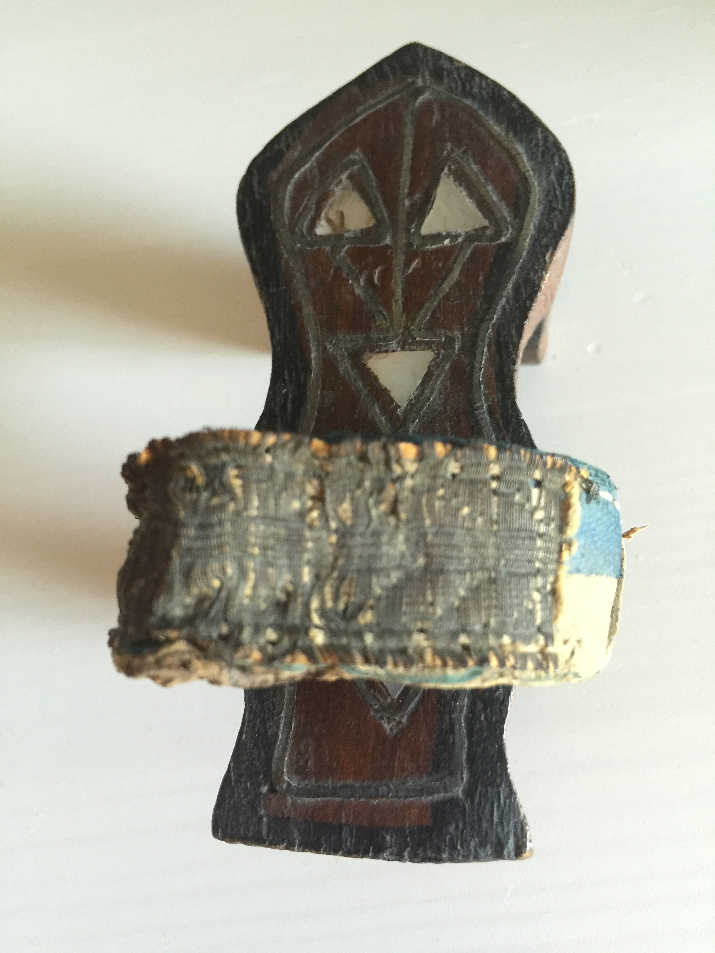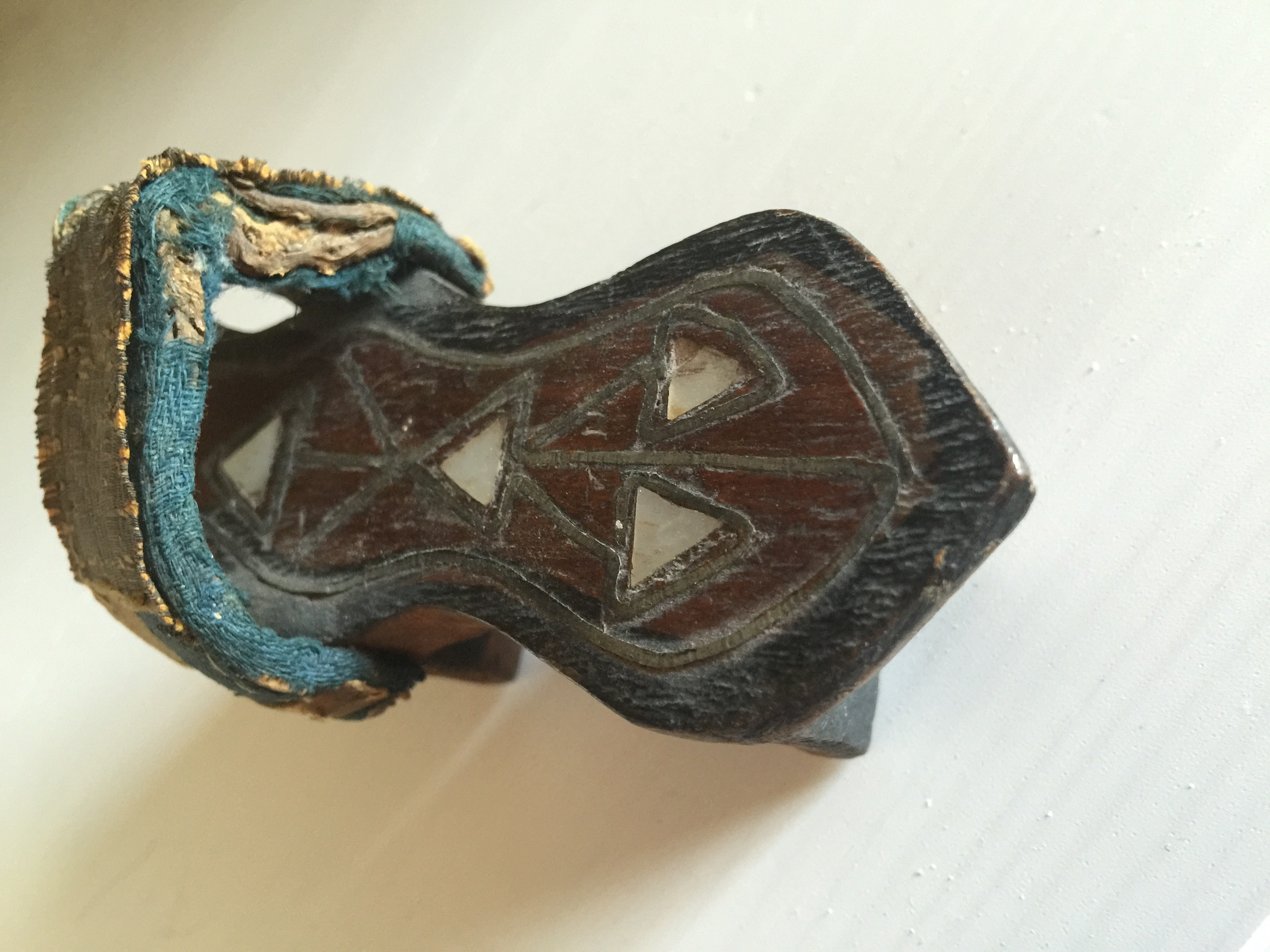 This Precious little shoe belonged to my grandmother and was purchased at the 1933 Chicago World's Fair but I suspect it might be much older. I only have one. It measures 1 1/2" wide x 3" high x 3 3/4" long. The base is solid wood and I'm uncertain what the strap is made of. It has inlays of what might be mother of pearl or maybe bone?