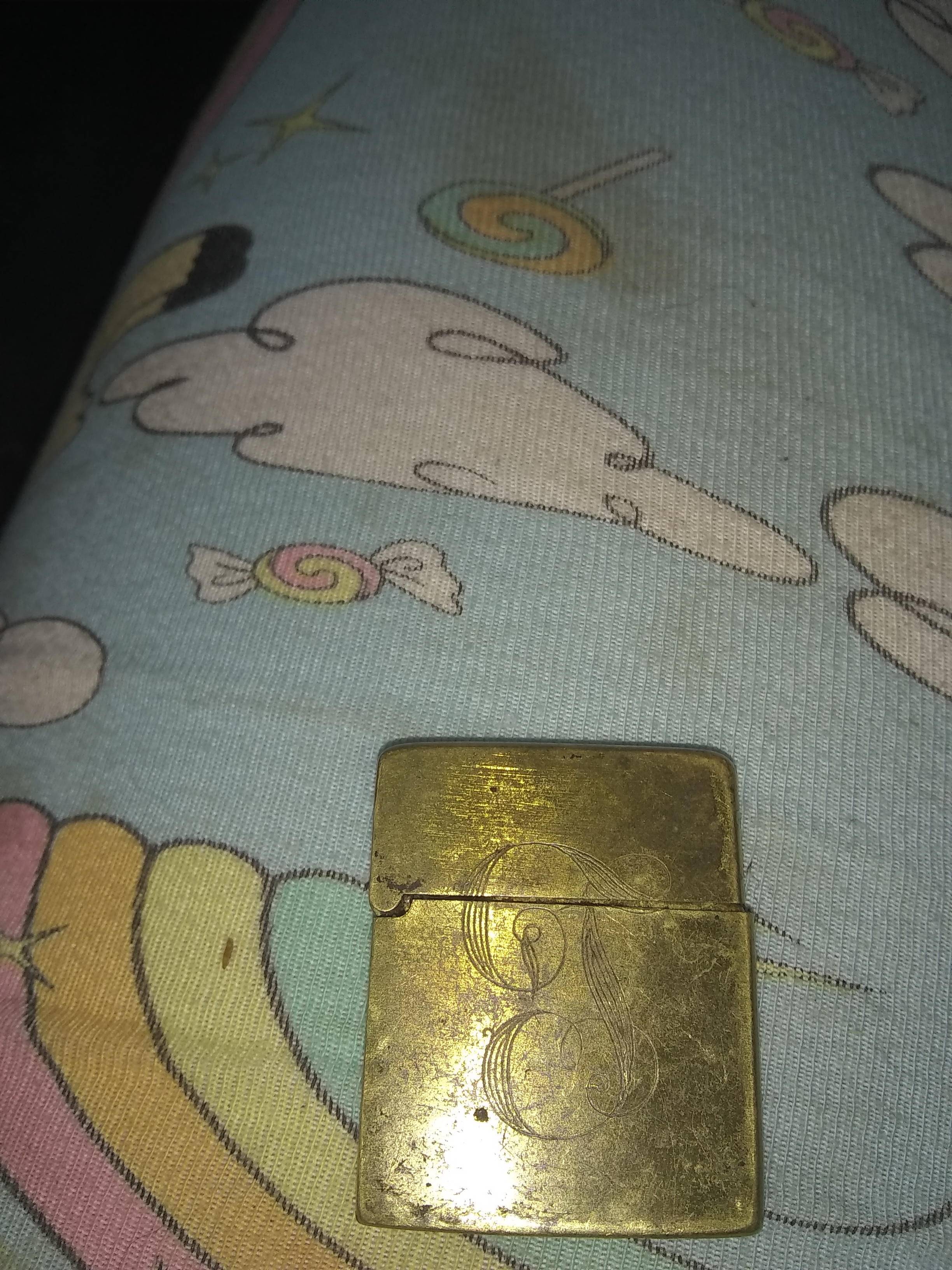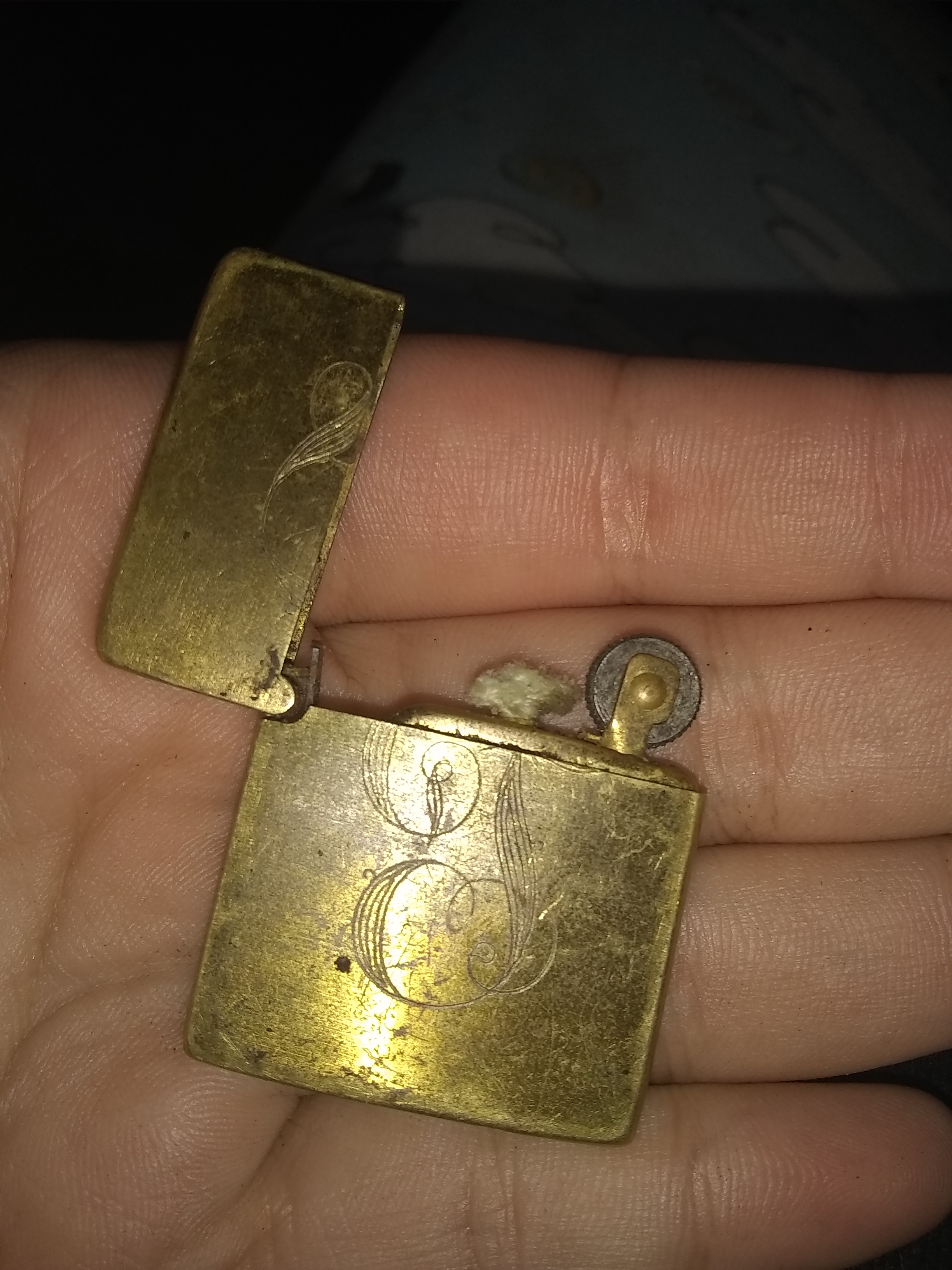 Tiny zippo like lighter, has a "J" carved in it in Calligraphy font on the bottom it says PACTON and Japan, possibly made of brass or copper.