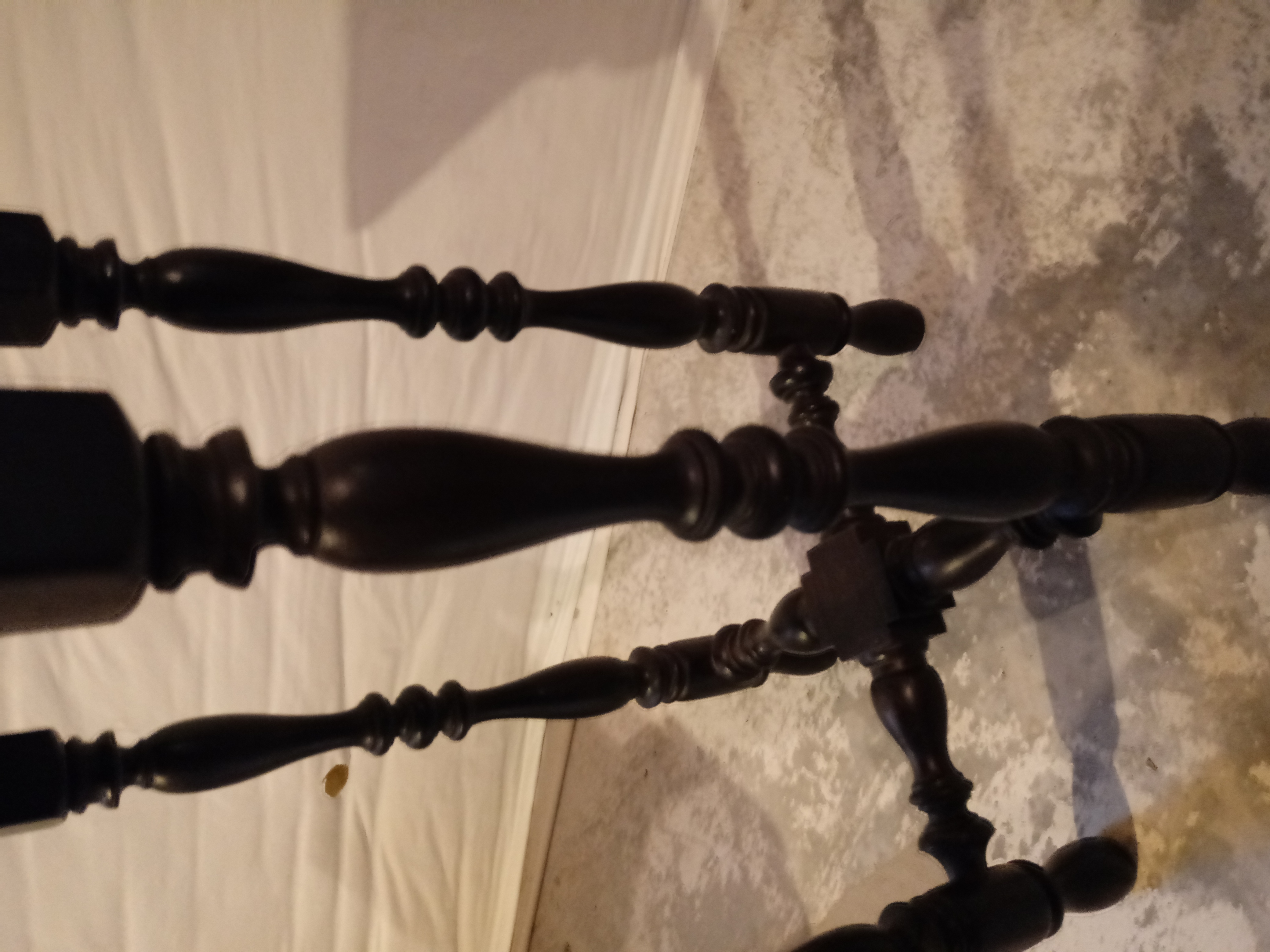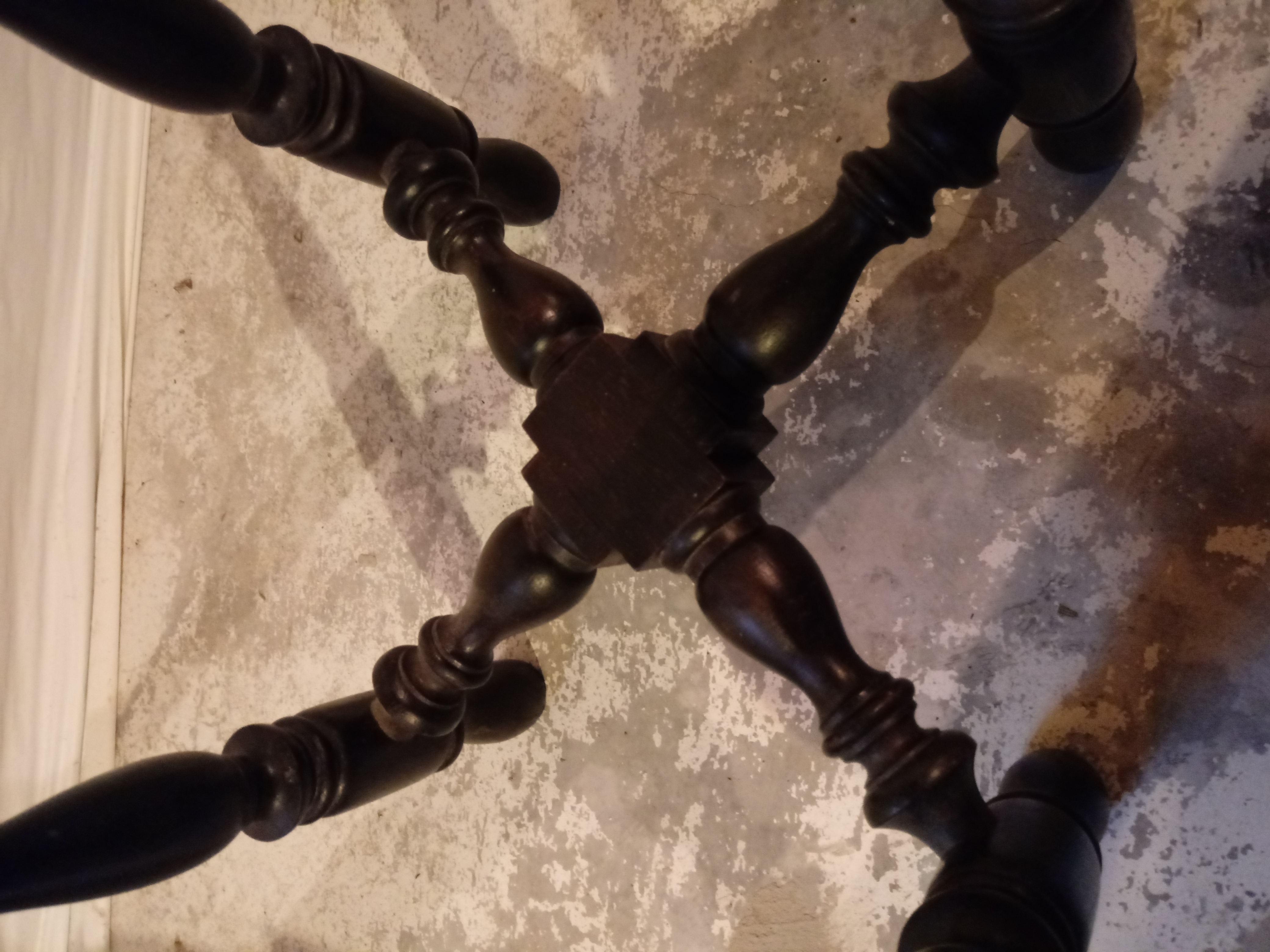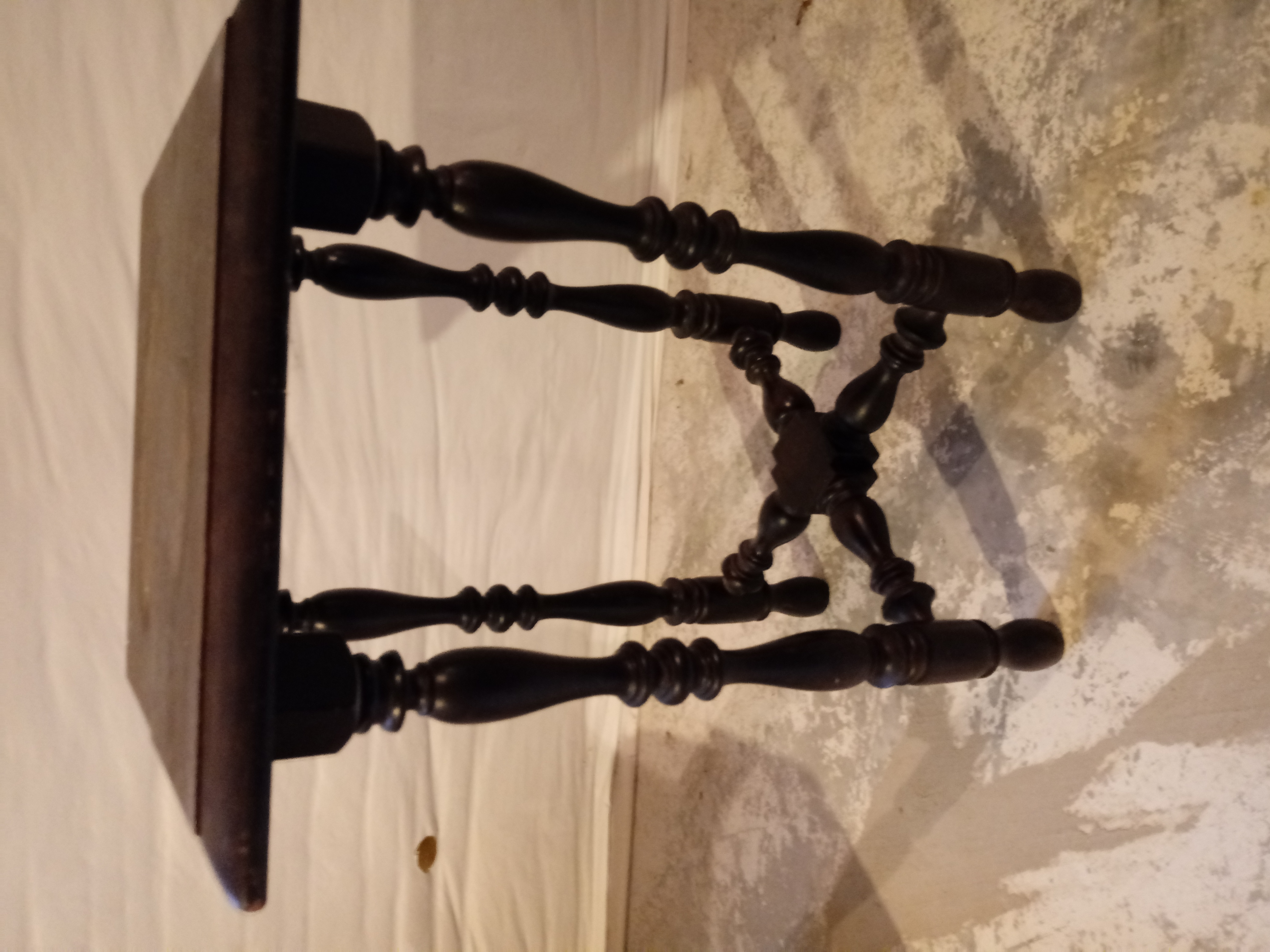 The table has 4 legs and is about 1 foot square. It stands about 2 feet high. At the bottom of the legs there is a decorative stability (?) piece, attaching all legs together. That piece and the legs are turned. It is very simple but very pretty.