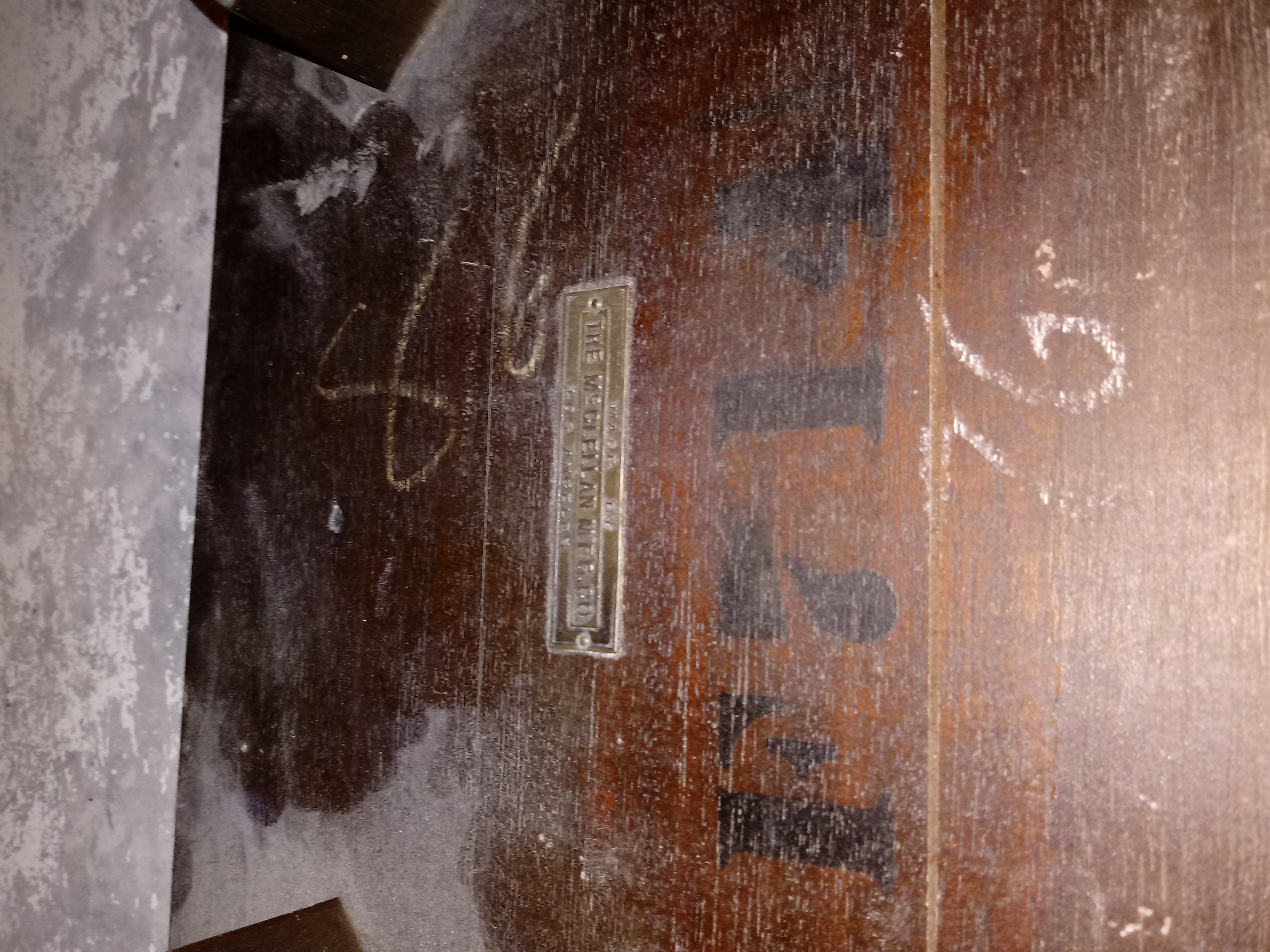 This is a tiny little table with a metal label that reads "Made by The McClellan MFG Co Los Angeles". It has a black ink stamp reading "F714".