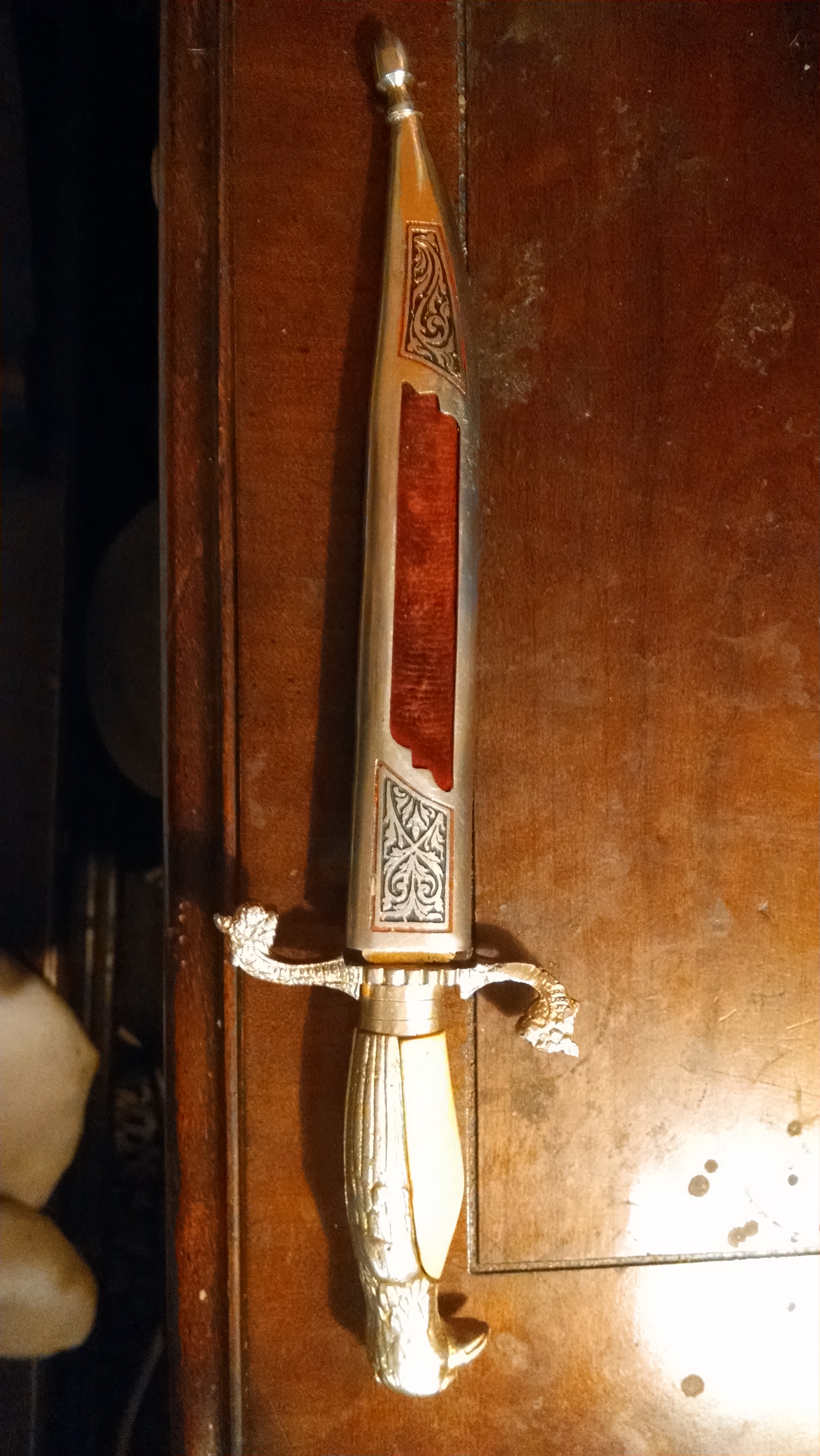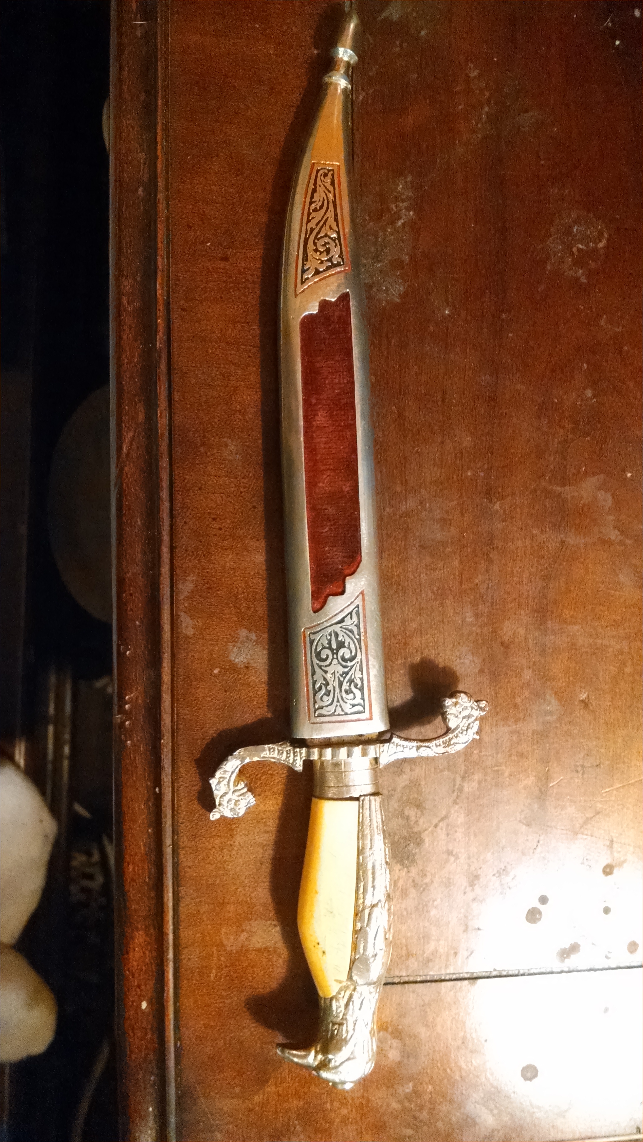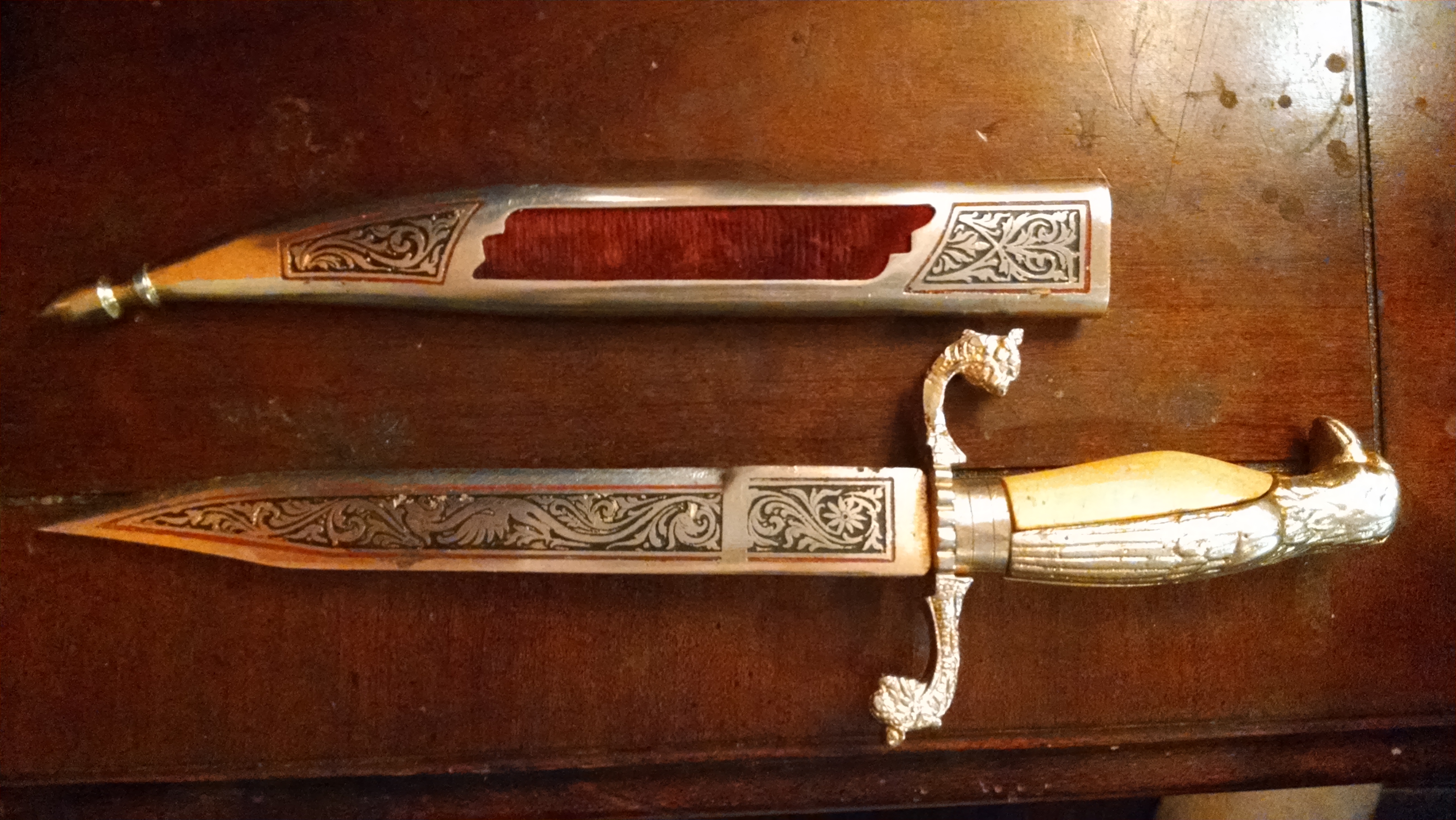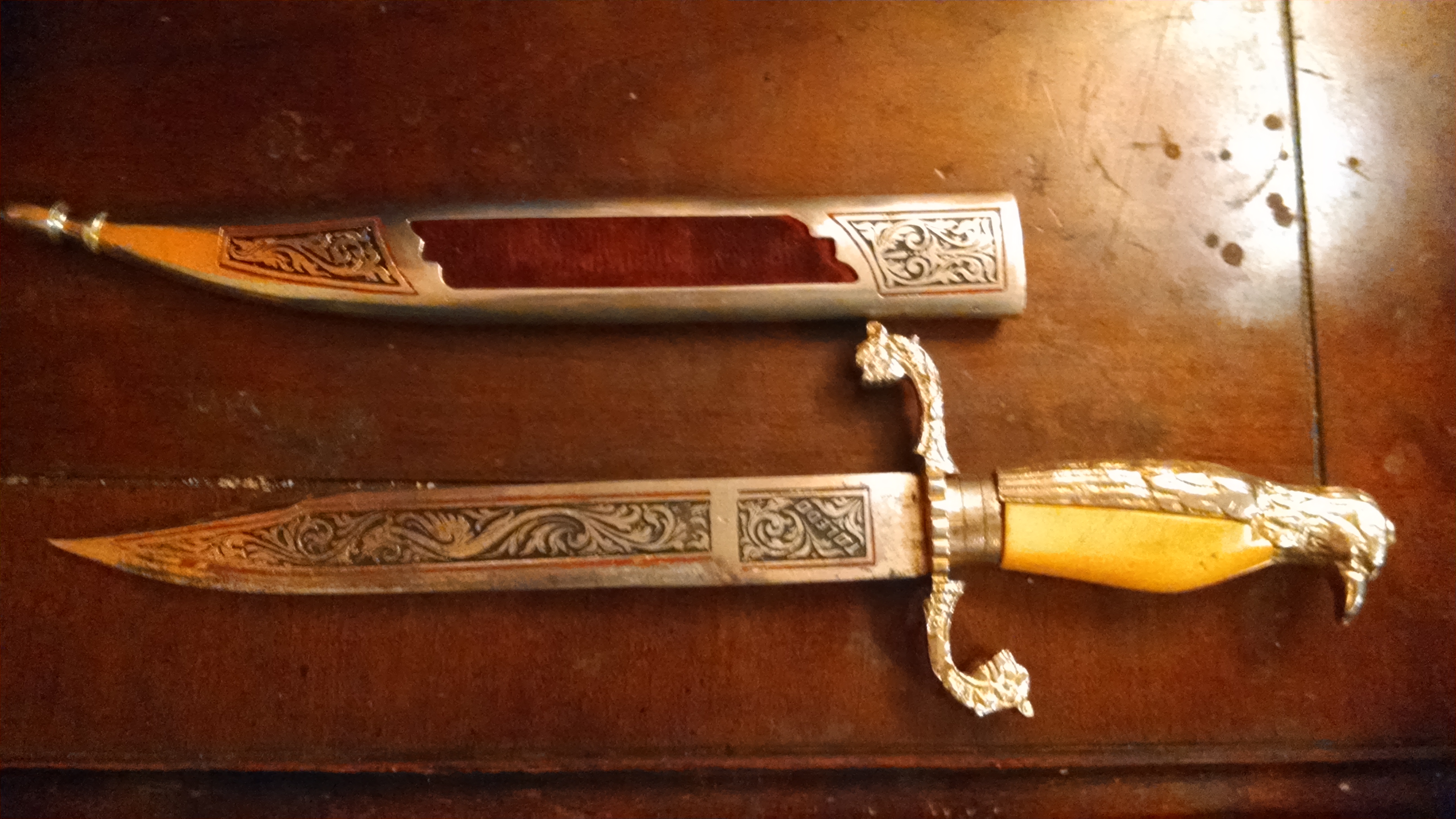 Gold Eagle head with gold feathers and a yellow belly for handle.. Looks like dragon heads at the bottom of handle.. Black engraving with red outline on both dagger and sleeve. Red velvet cut-outs on both side of sleeve. The only writing is on the dagger toward the top by the handle that reads " Toledo"... And is only on one side of the dagger.