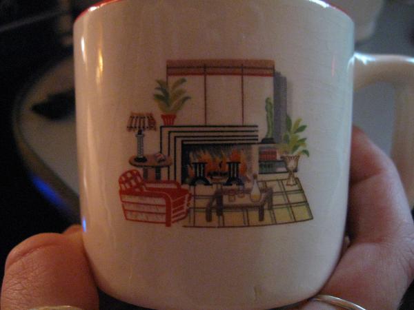This is a set of 5 Tom and Jerry Cups. There were 6 cups and 1 bowl but the bowl and one of the cups were destroyed while shipping them. They are an off-white/cream color and have a scene of a living room painted on one side and the words "tom and jerry" painted on the other side. The lettering is in cursive as opposed to the old english lettering I have seen on most of these sets. There is a red line painted around the rim and a red stripe on the handle.