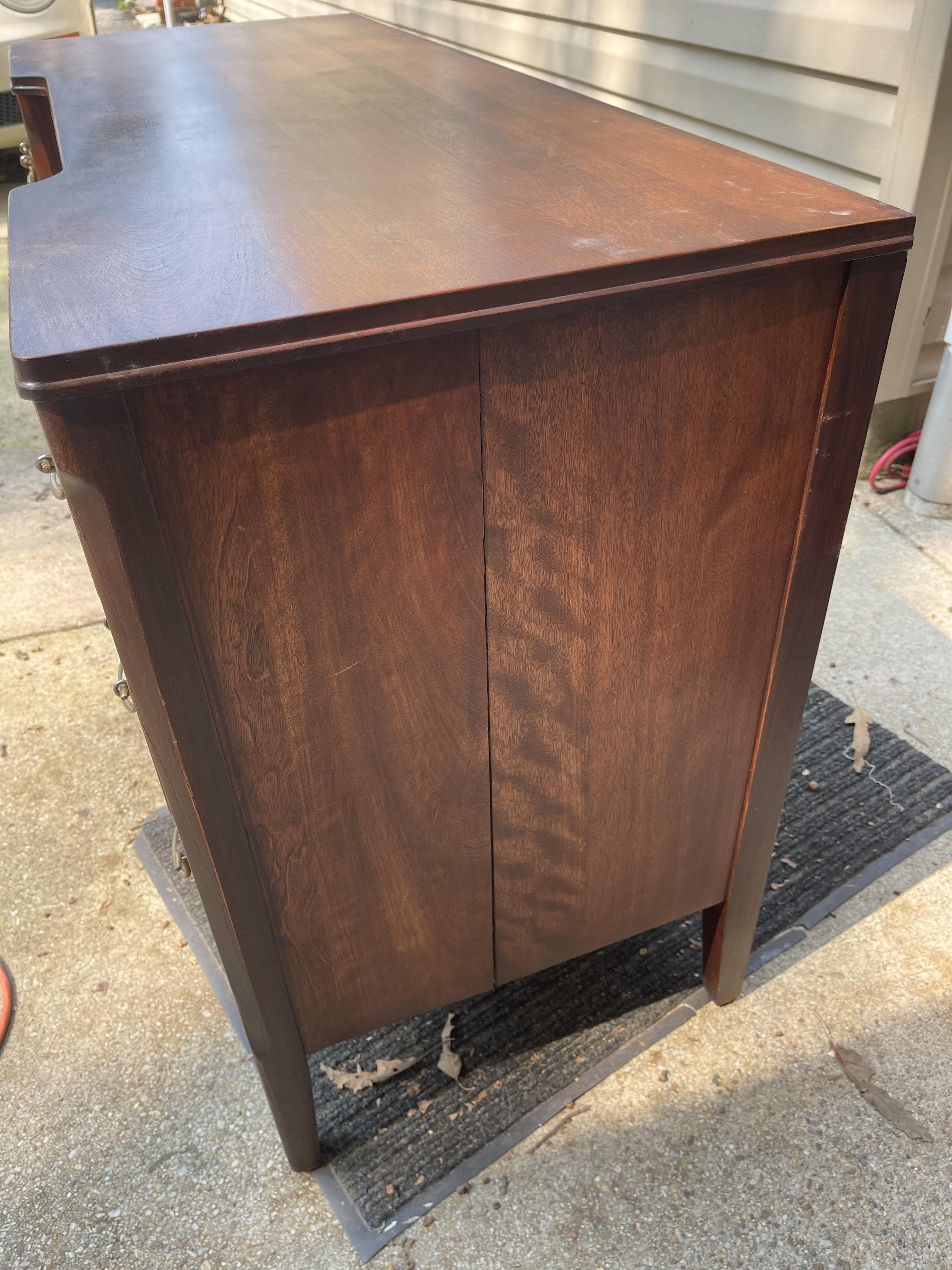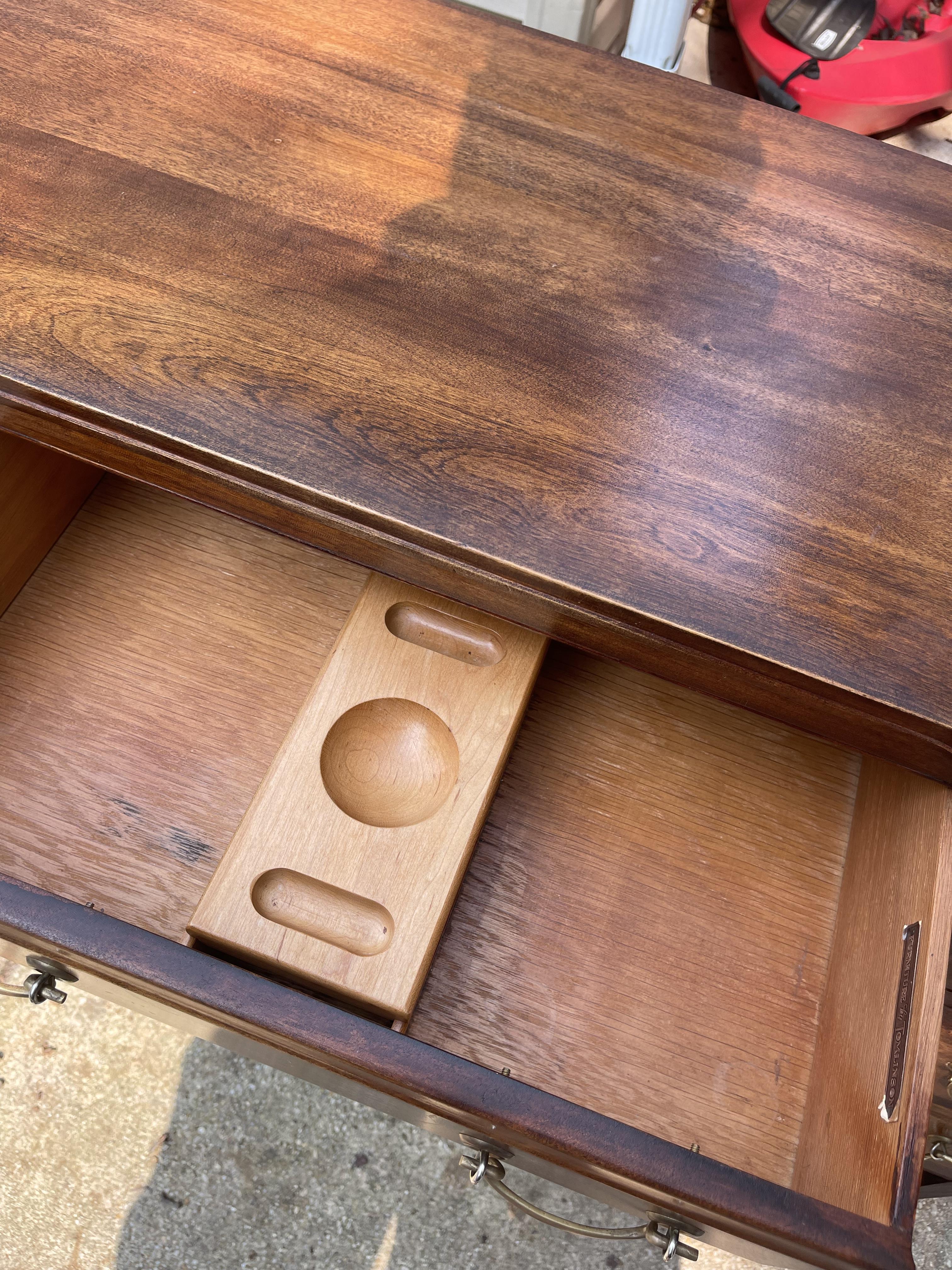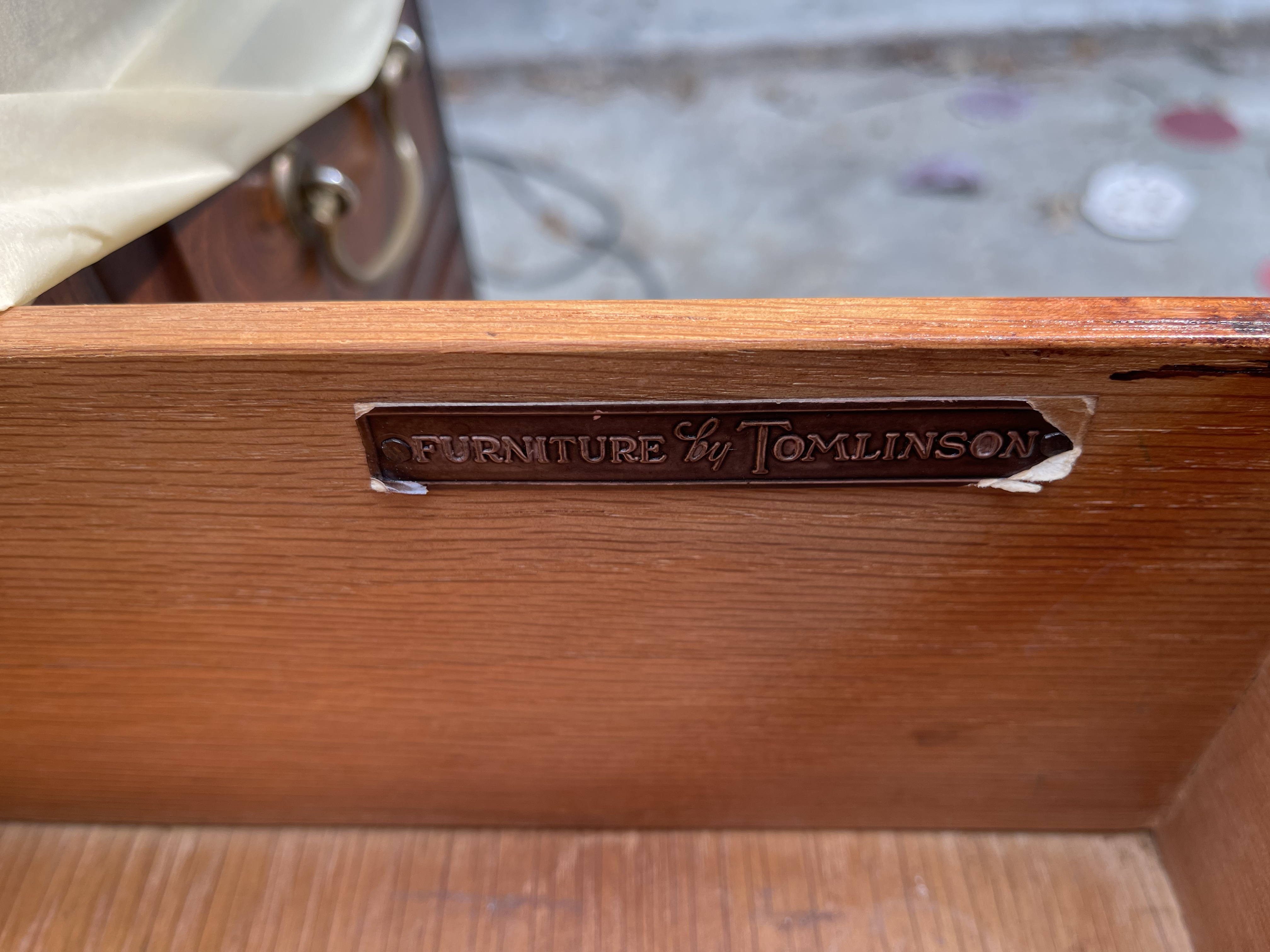 Very little known except that the piece looks very high end and that it has the marking “Furniture by Tomlinson” on the inside of the middle drawer.