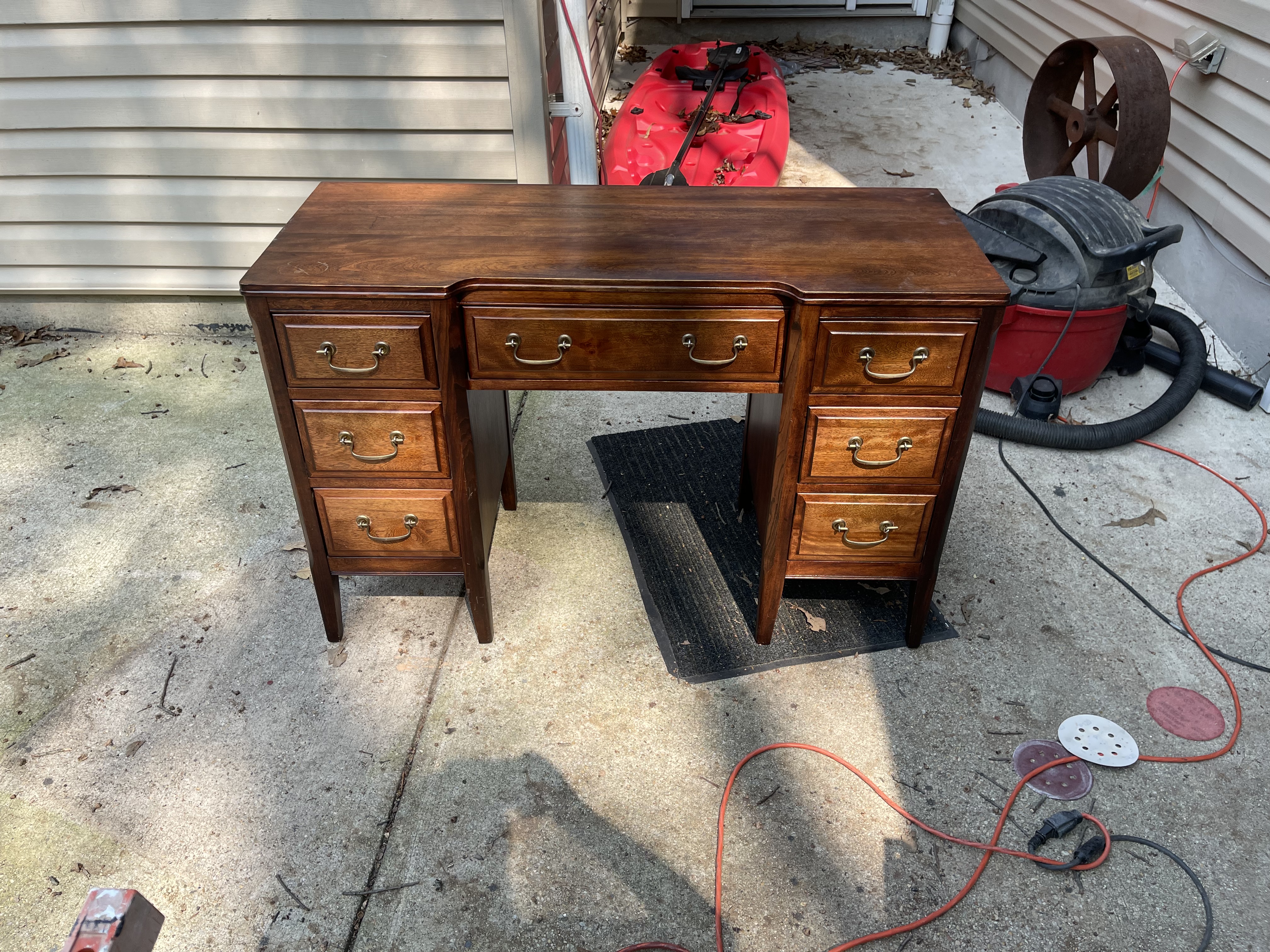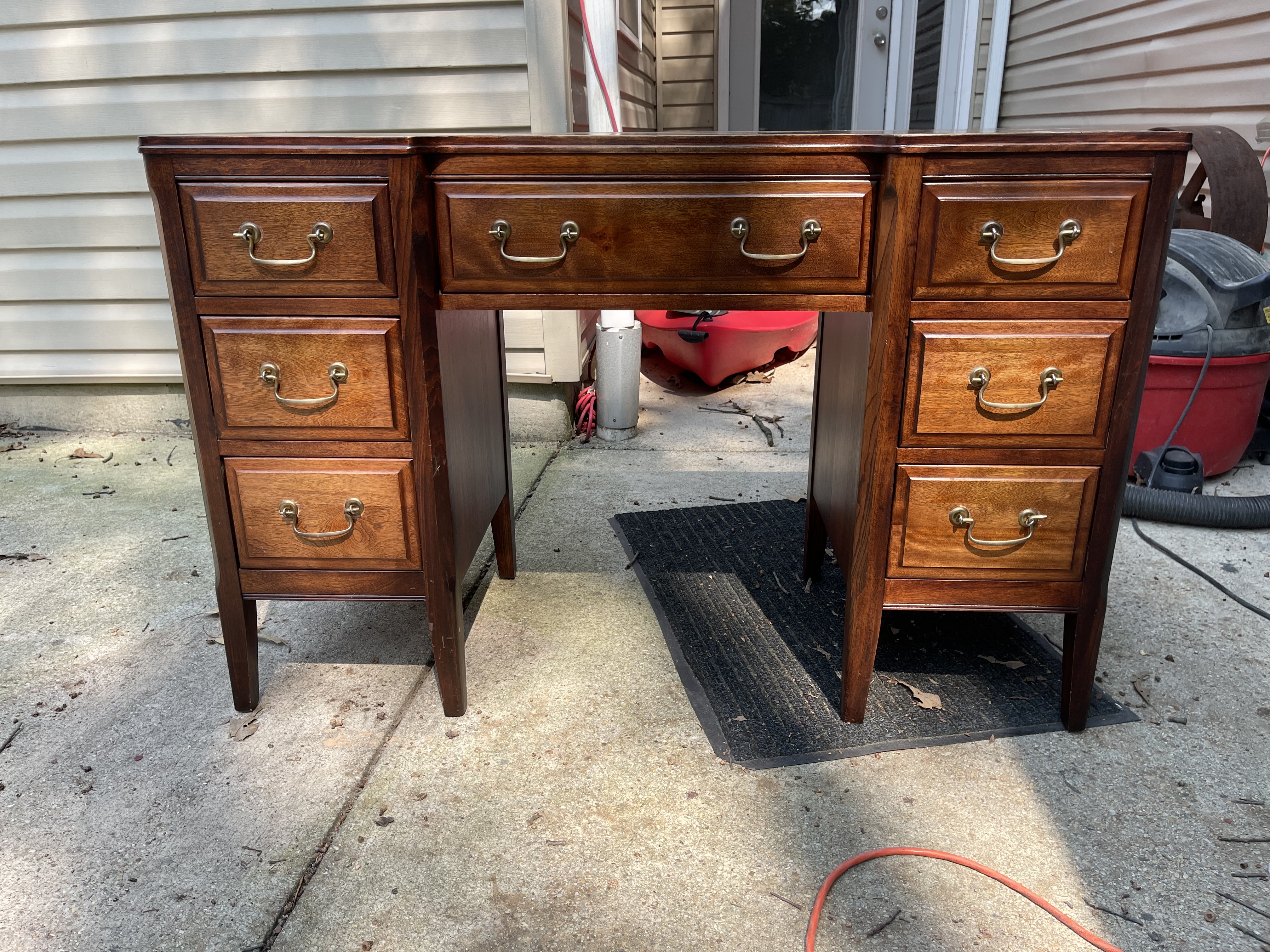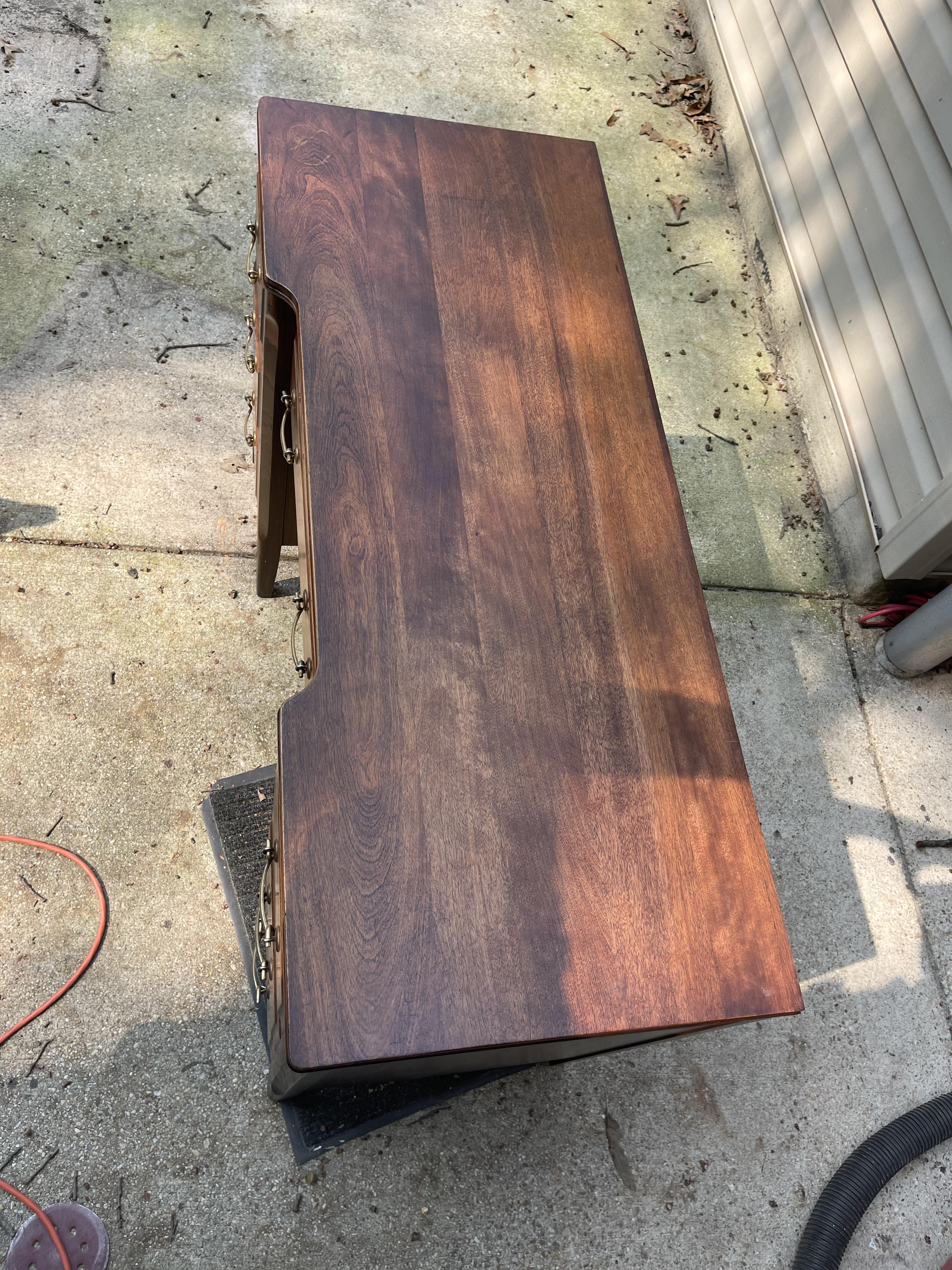 Very little known except that the piece looks very high end and that it has the marking “Furniture by Tomlinson” on the inside of the middle drawer.