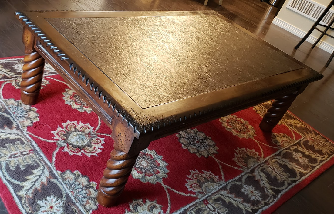 Physical Description: This coffee table features a beautifully tooled leather top, intricately designed with floral patterns. The base is constructed from solid wood, likely mahogany or a similar hardwood, and showcases a rich, dark finish. The table has a traditional square shape with a robust frame and turned legs that add to its visual appeal. The dimensions are not specified, but it appears to be a standard coffee table size, typically around 48" x 24" x 18". The edges of the table are adorned with a decorative carved border, enhancing its craftsmanship.