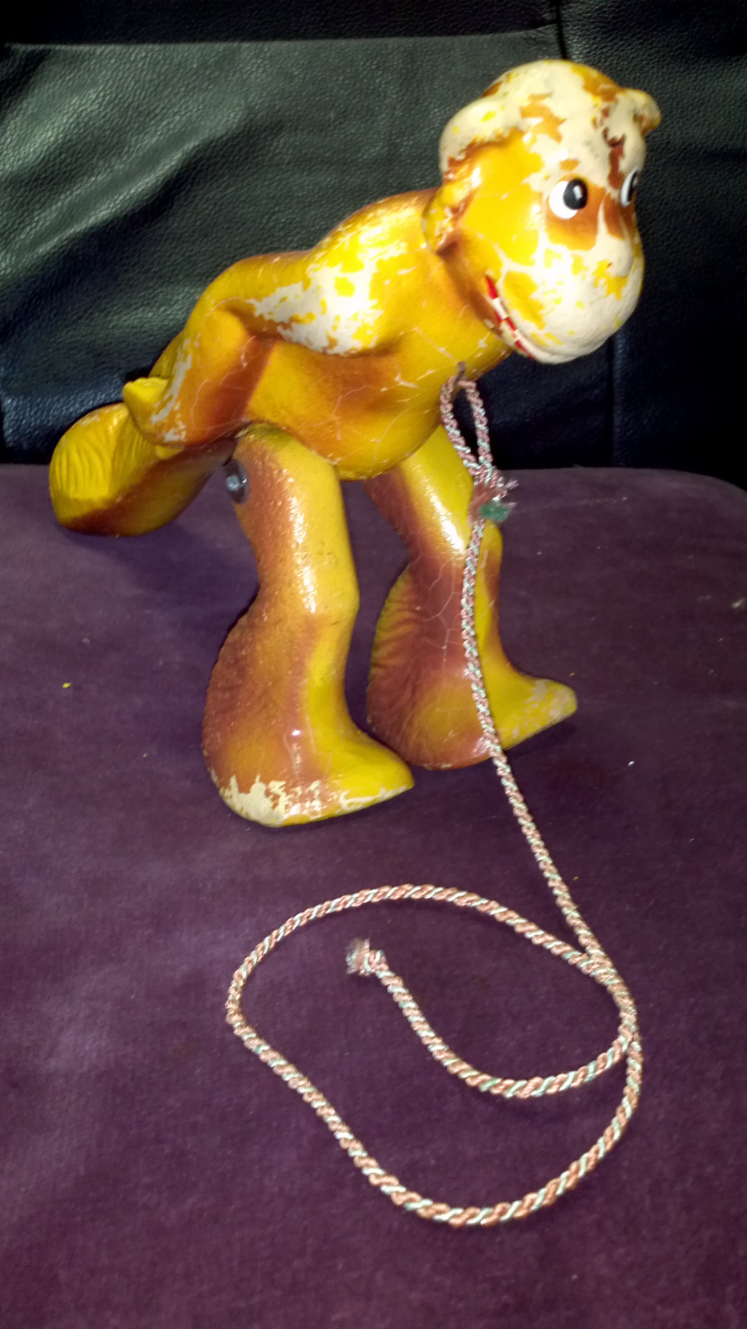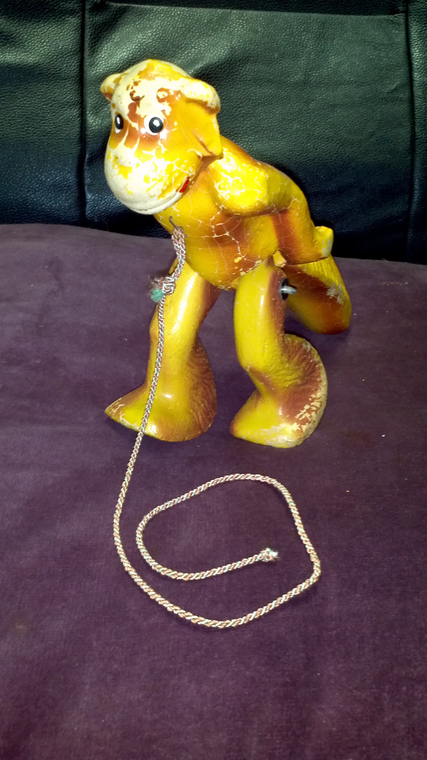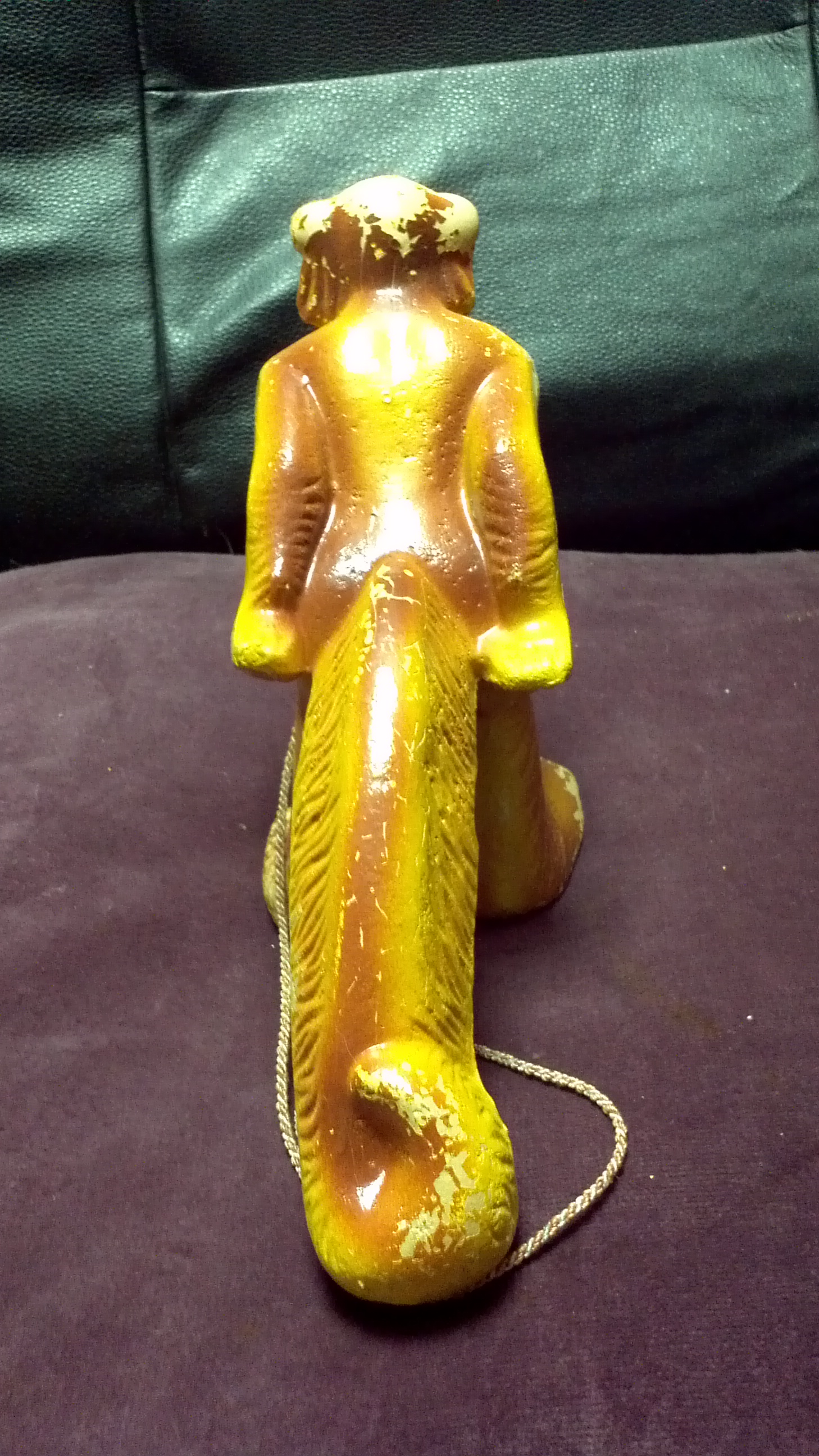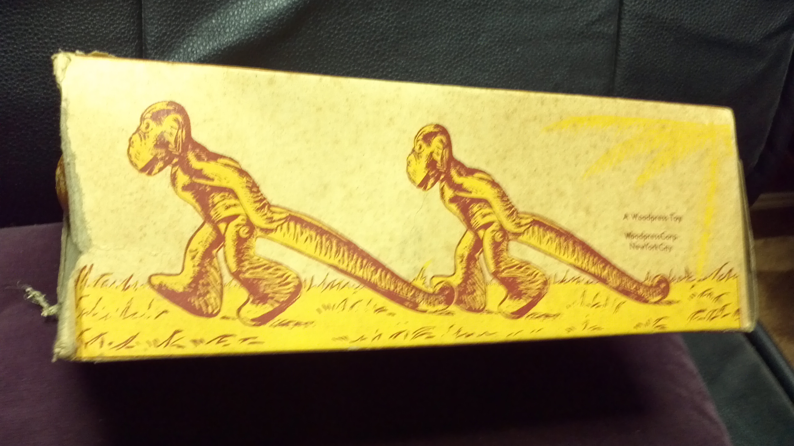 My deceased Mother was the owner of this unusual pull toy. The toy does come with the original box and you will see it says "Toots the Walking Monkey" - A Woodpress toy, The Woodpress Toy Corp, New York City. It is in fairly good condition.