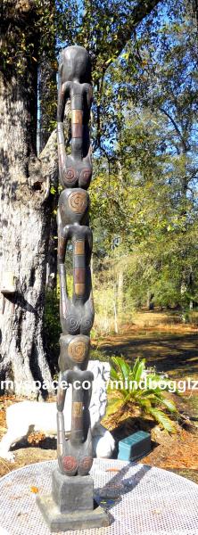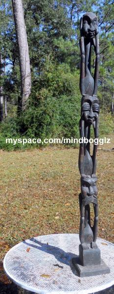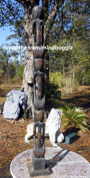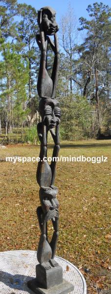 75"X6" without botom base. Totem#2- large, unusual, hand carved, painted, wood, "hear no evil, see no evil, speak no evil", wise monkeys totem with some definite age to it. If anyone can help us ID or value it, please help. Needs a good cleaning, but I don't want to remove any patina or paint. Contact us at www.myspace.com/mindbogglz
