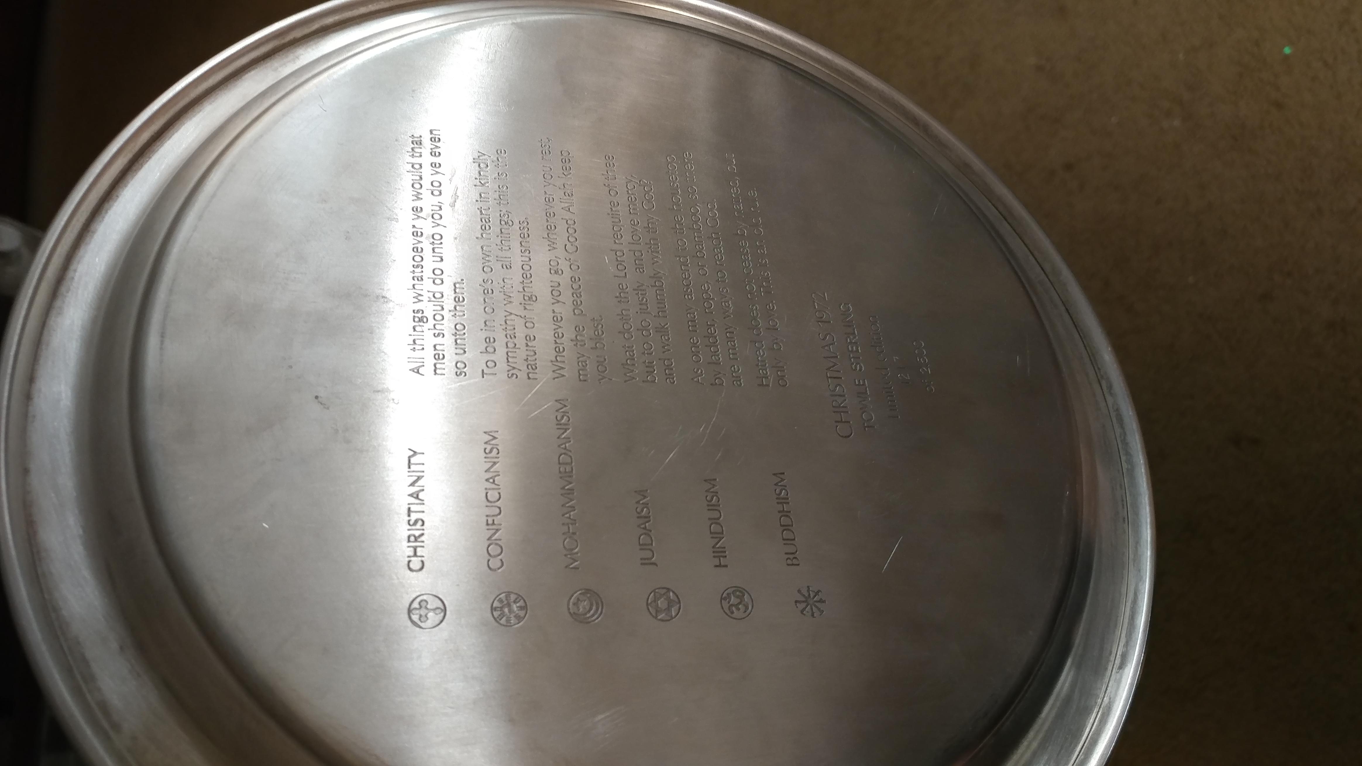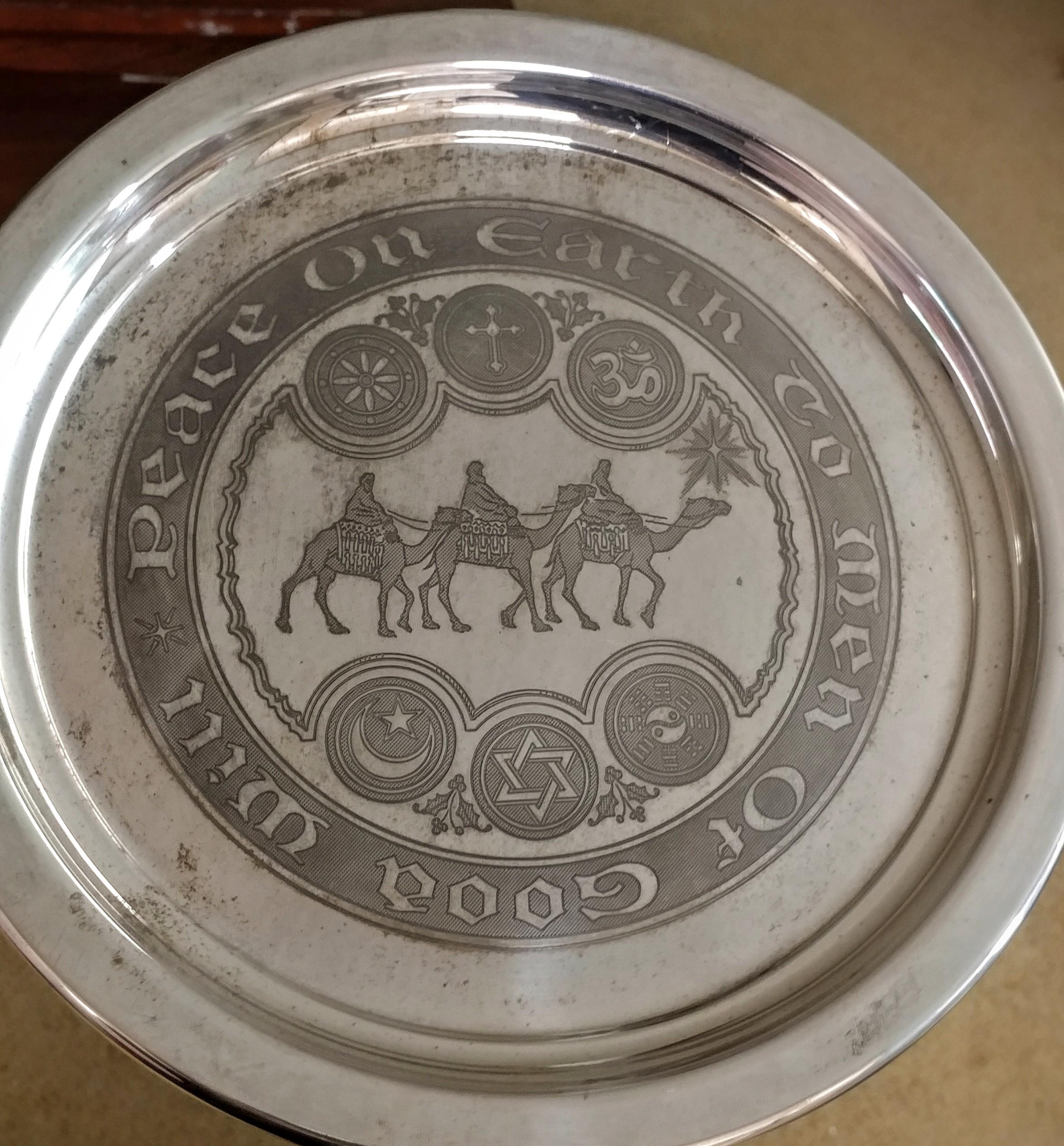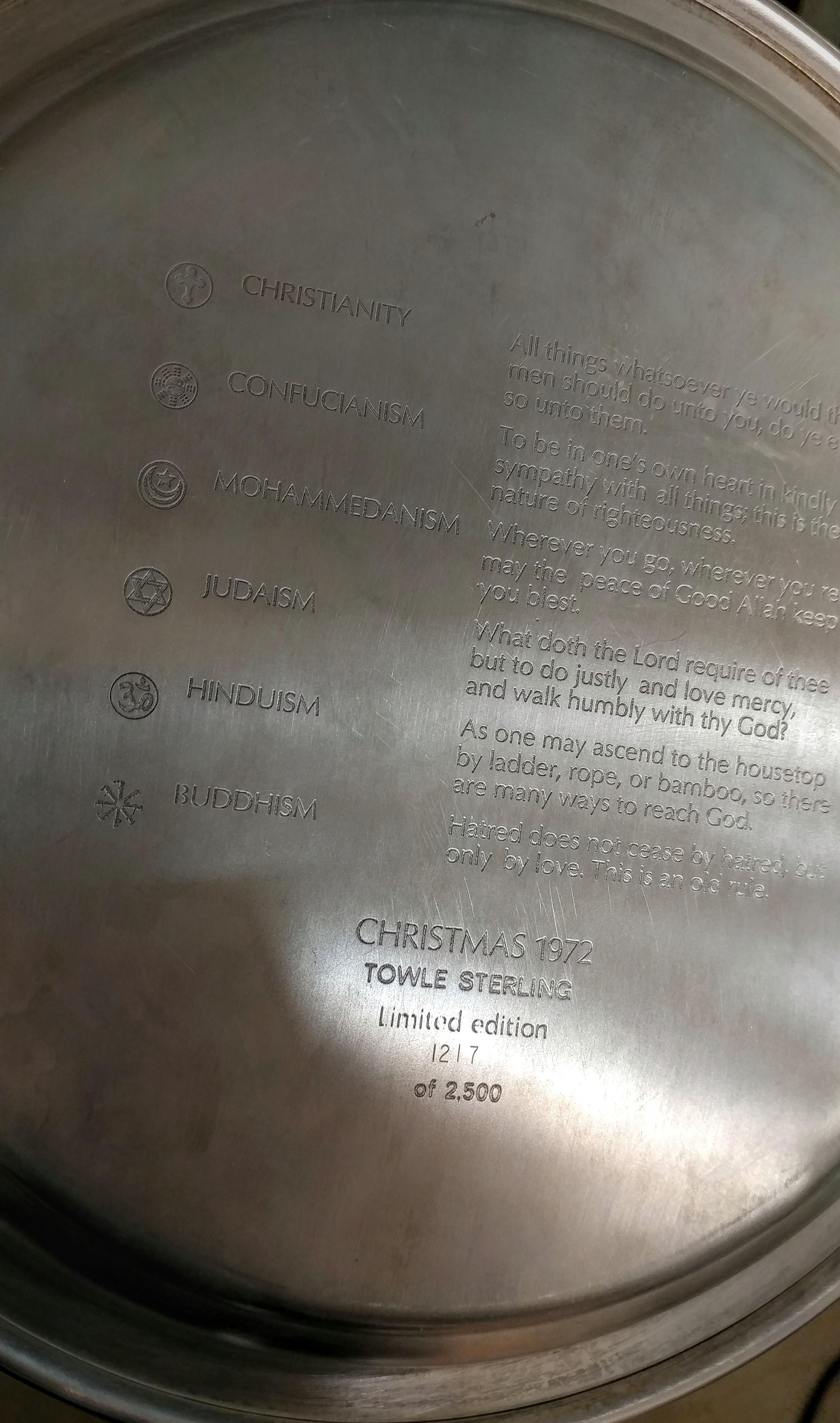 Limited edition (# 1217 of 2500) Towle Sterling Christmas Plate year 1972 "Peace on Earth to Men of Goodwill" 6 religions represented on the front with a definitive statement on each one on the back. There is some tarnish and no box.