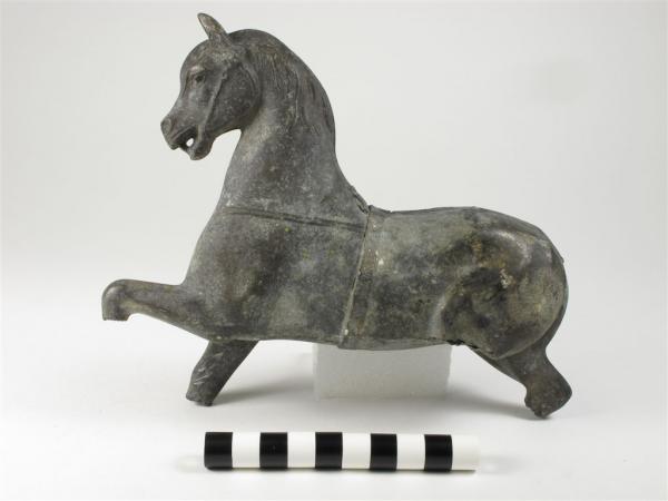 This (broken) toy horse was found at a historic site (USA) in the 1920s. The original researcher believed it dated to the 1840s. I'm hoping to find more accurate information as to when this may have been manufactured. What would really wonderful would be to see an image of what a "complete" specimen of this toy would have looked like (i.e., would it have been a pull toy? hitched to a wagon?). The toy has a ring in its mouth, a small hole near the right ear, and another small hole under the spot where the tail would have been. There is what appears to be a "sprue" scar on the back. Obviously the only value for this horse would be historic, not monetary, so any contextual/historical information would be welcomed. Thank you.