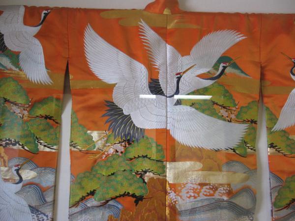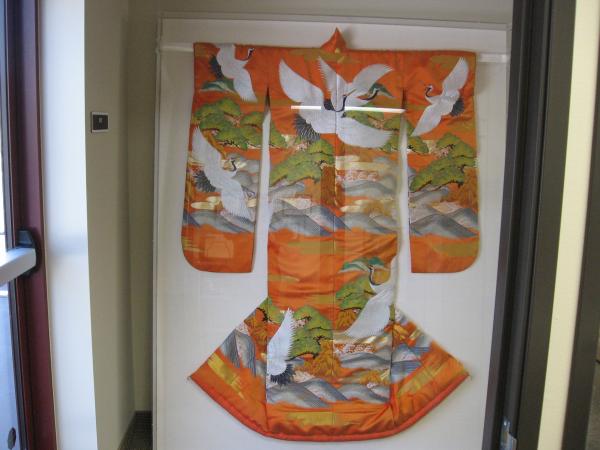 I am with a non-profit in Palm Desert, California, USA. We had a kimono donated and I am hoping that you can either provide me with information or direct me to a resource. From the research I have been able to complete on-line, it appears to be used in Japanese classical dance for the Kabuki theatre. The outer fabric is silk-satin. The base color is orange. The design is embroidered cranes in flight over stylized pine trees (perhaps uchikake). There are also mountains and clouds.