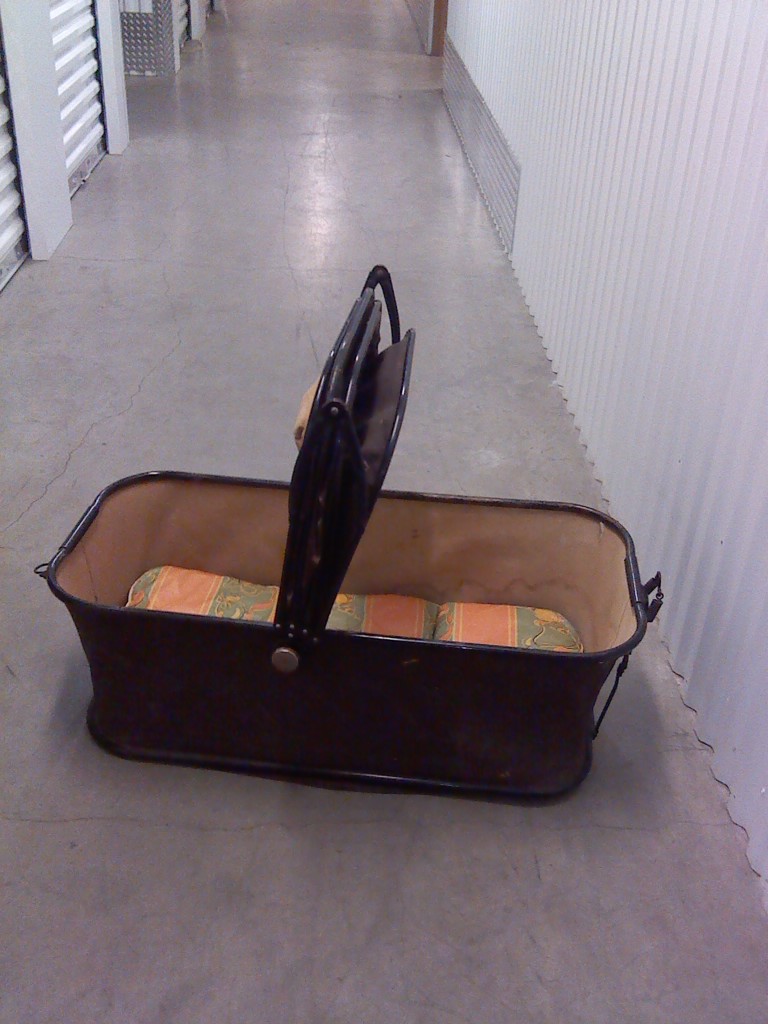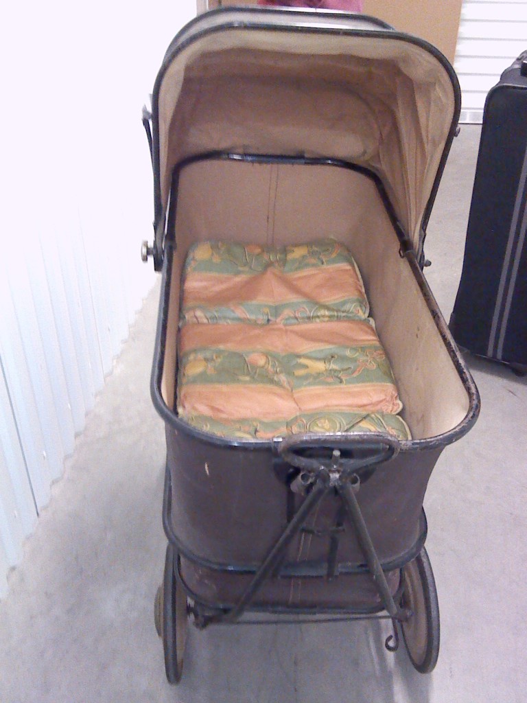 1929 Trav-l-eez carriage made by Mahr-Bufton Company in Minnesota. Extra long carriage with cloth covered cushion, dark brown canvas with black frame, canvas has three small holes and is a bit worn due to age. Very sturdy carriage that roll, swing,basket is removable and frame is collapsible for traveling and storing.