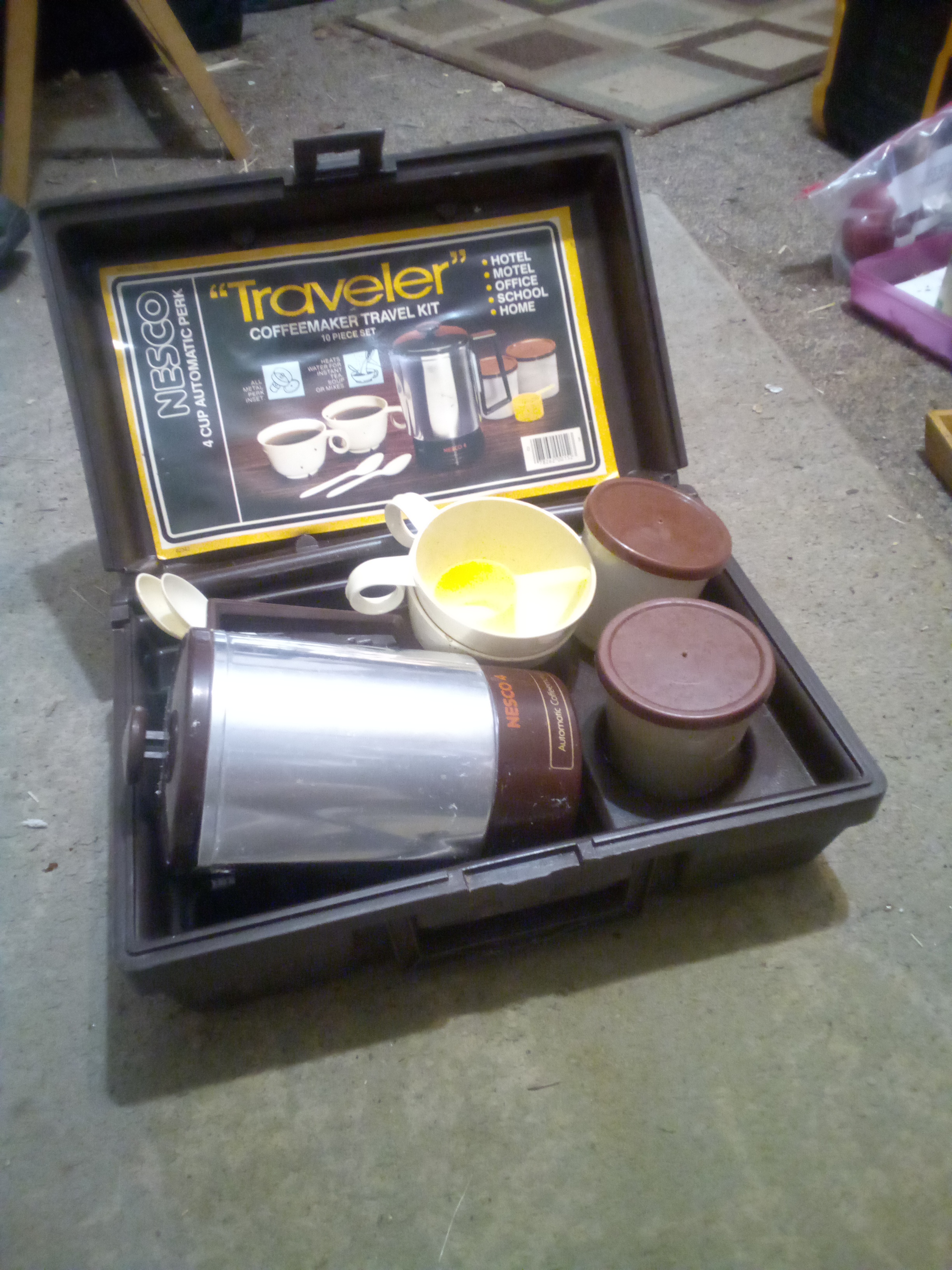 Description Nesco-Teaveler coffee maker travel kit. Brand New. The cord is still bound. There is sugar and coffee. Separate plastic containers.