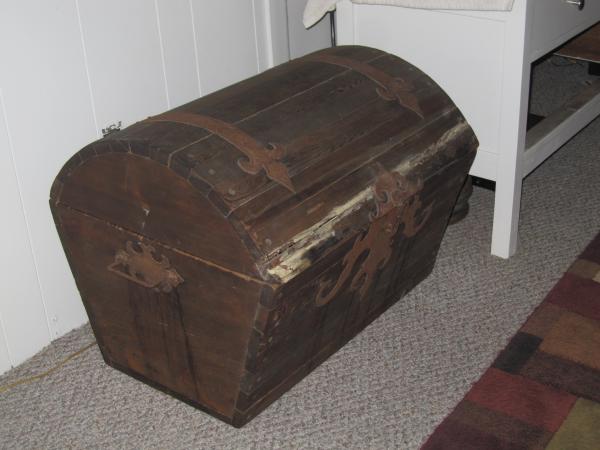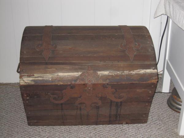 Dome chest inward slanted bottom.metal work over the top and front with a clasp. With wooden pegs instead of nails