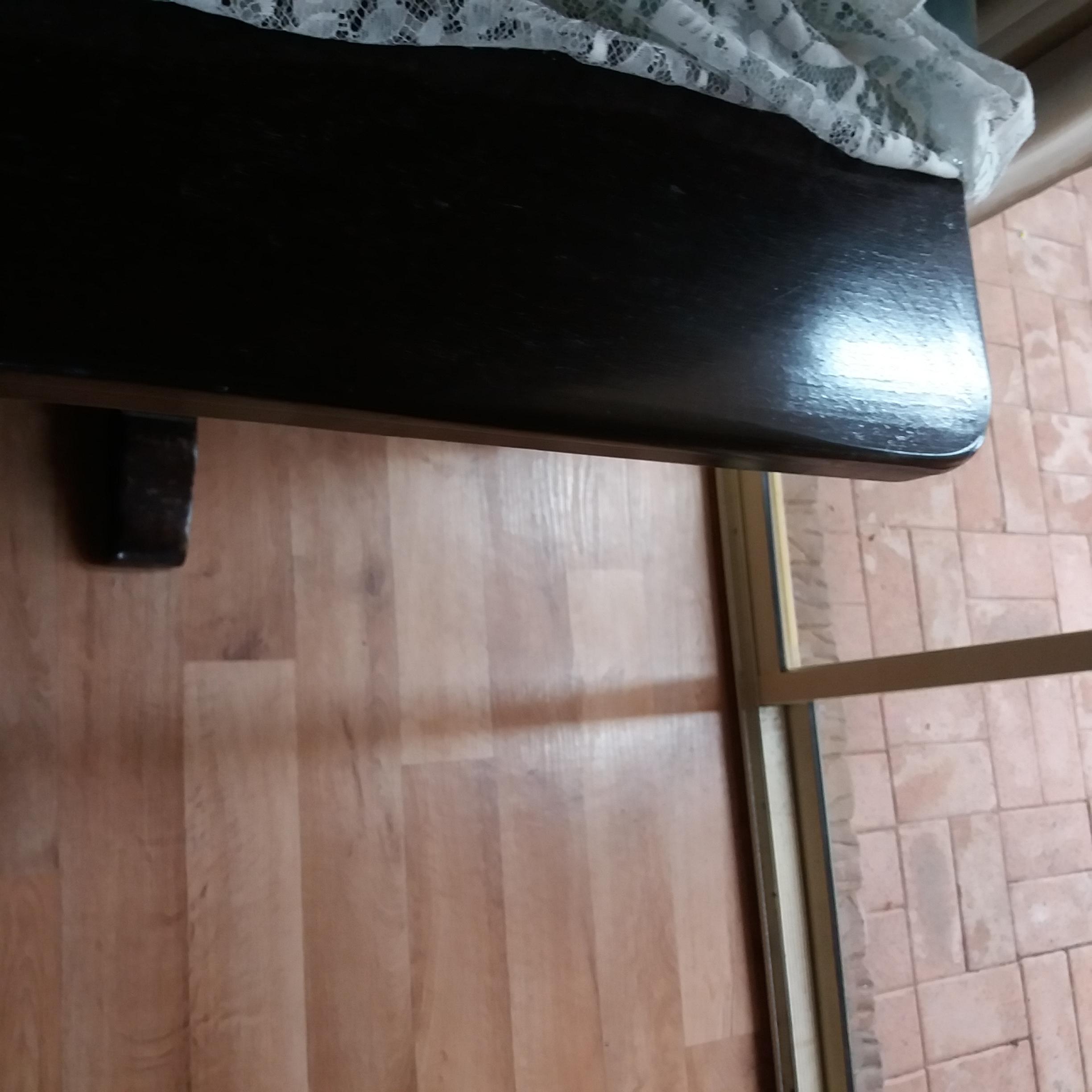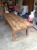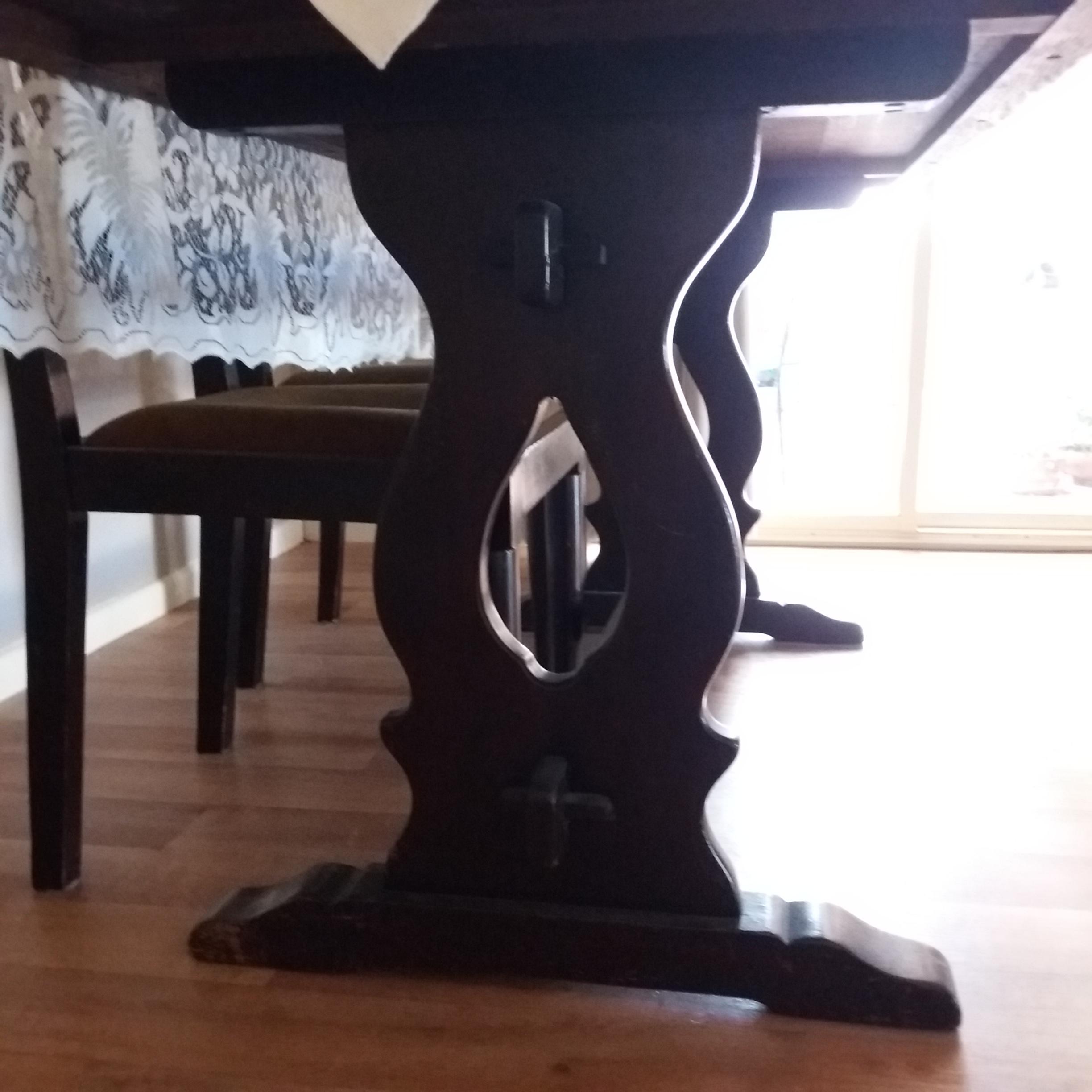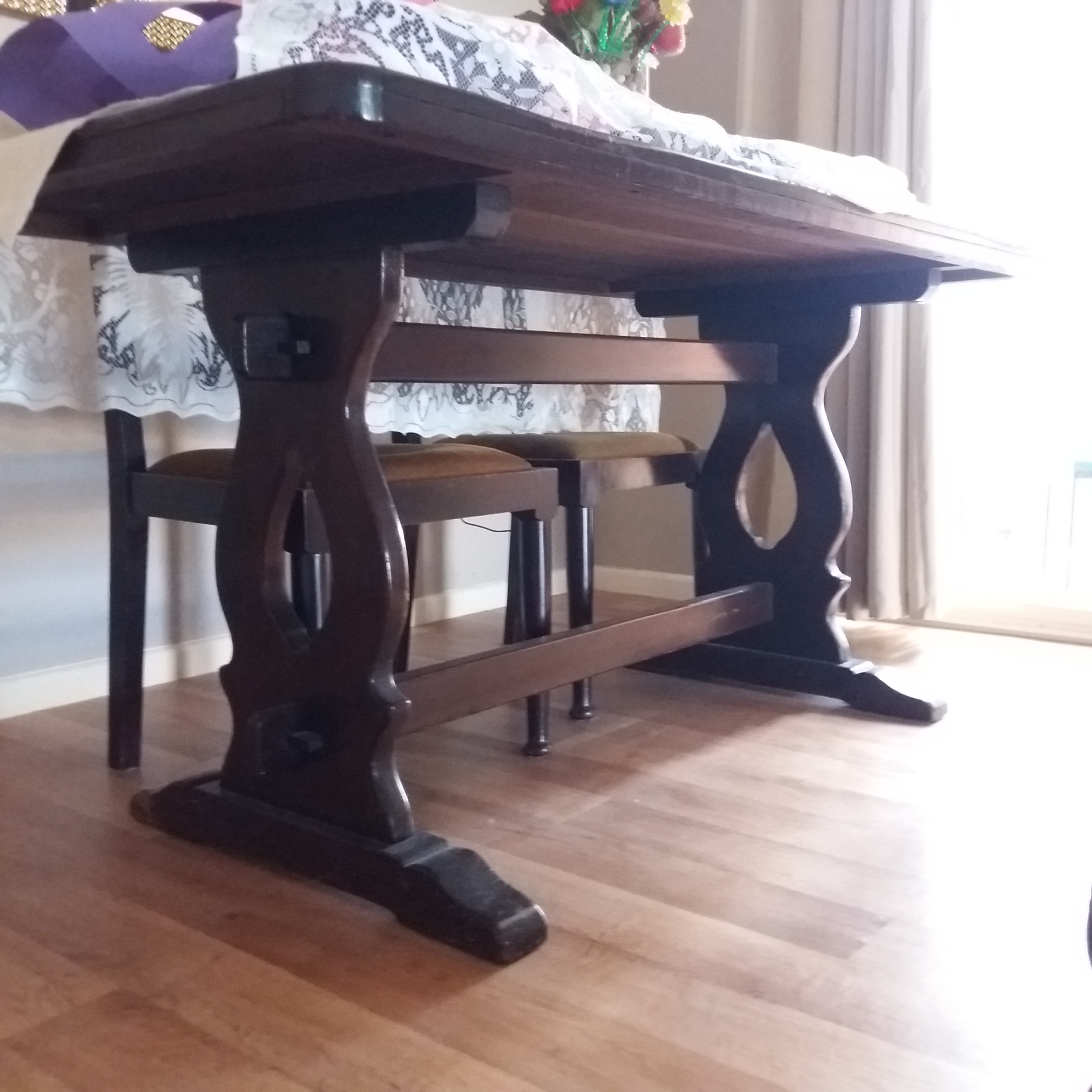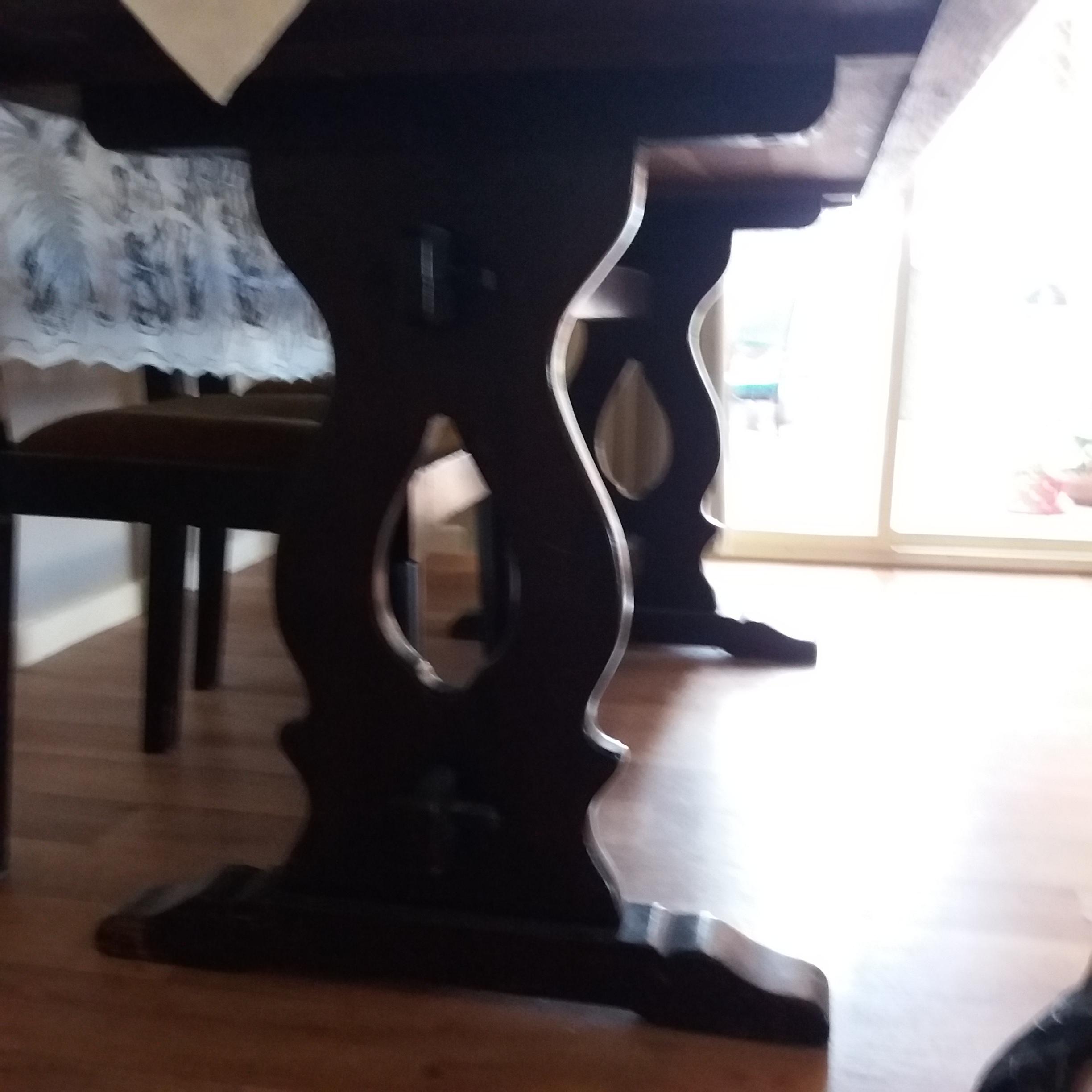 I have a trestle table and 4 chairs. The table top is not one piece and appears to be made from a hard wood and looks like oak. It is easier to see in the photos. The table top edges are bevelled in a wave type pattern. It looks similar to an Ethan Allen design I saw on ebay. Dimensions are: 62" Long by 30" Wide by 30" High