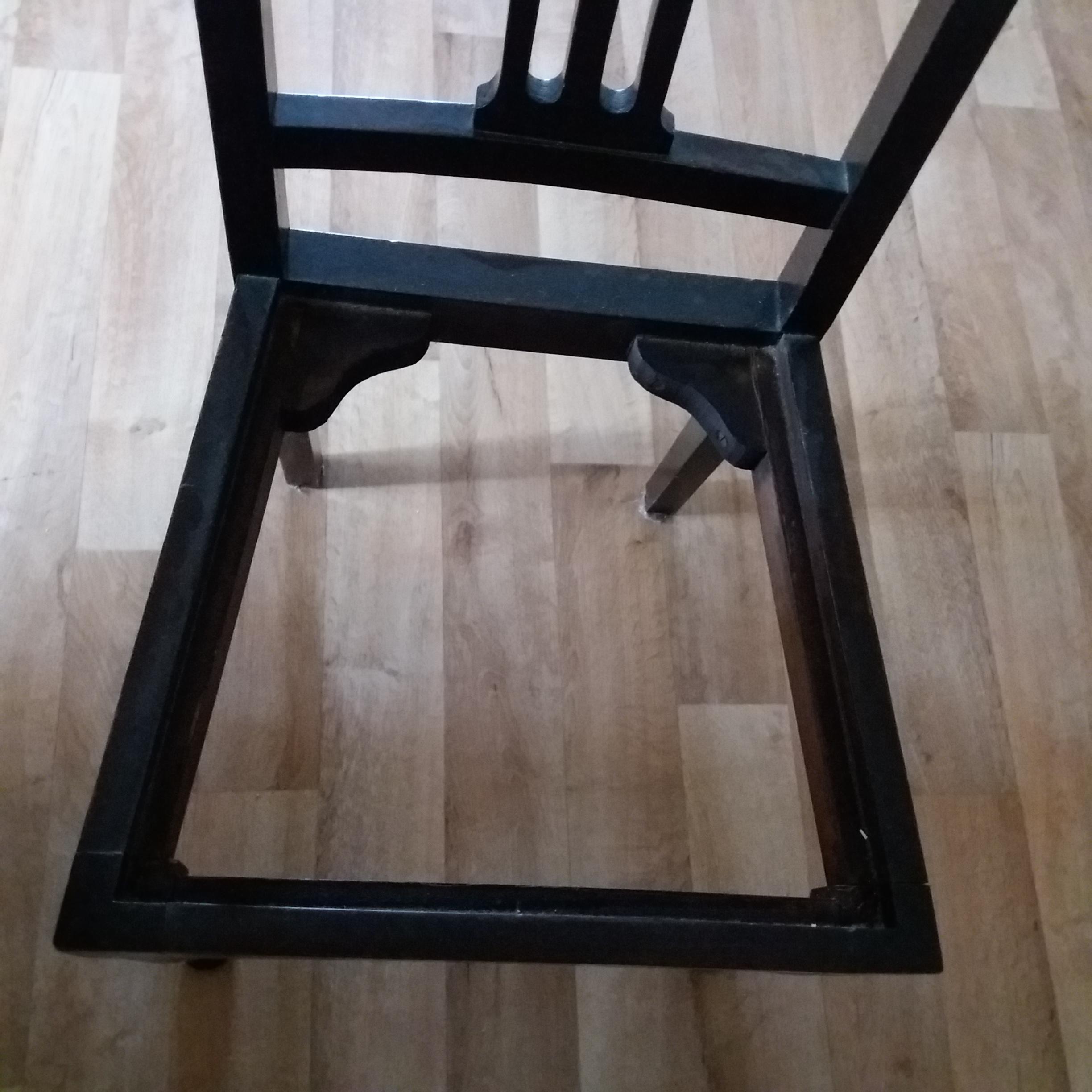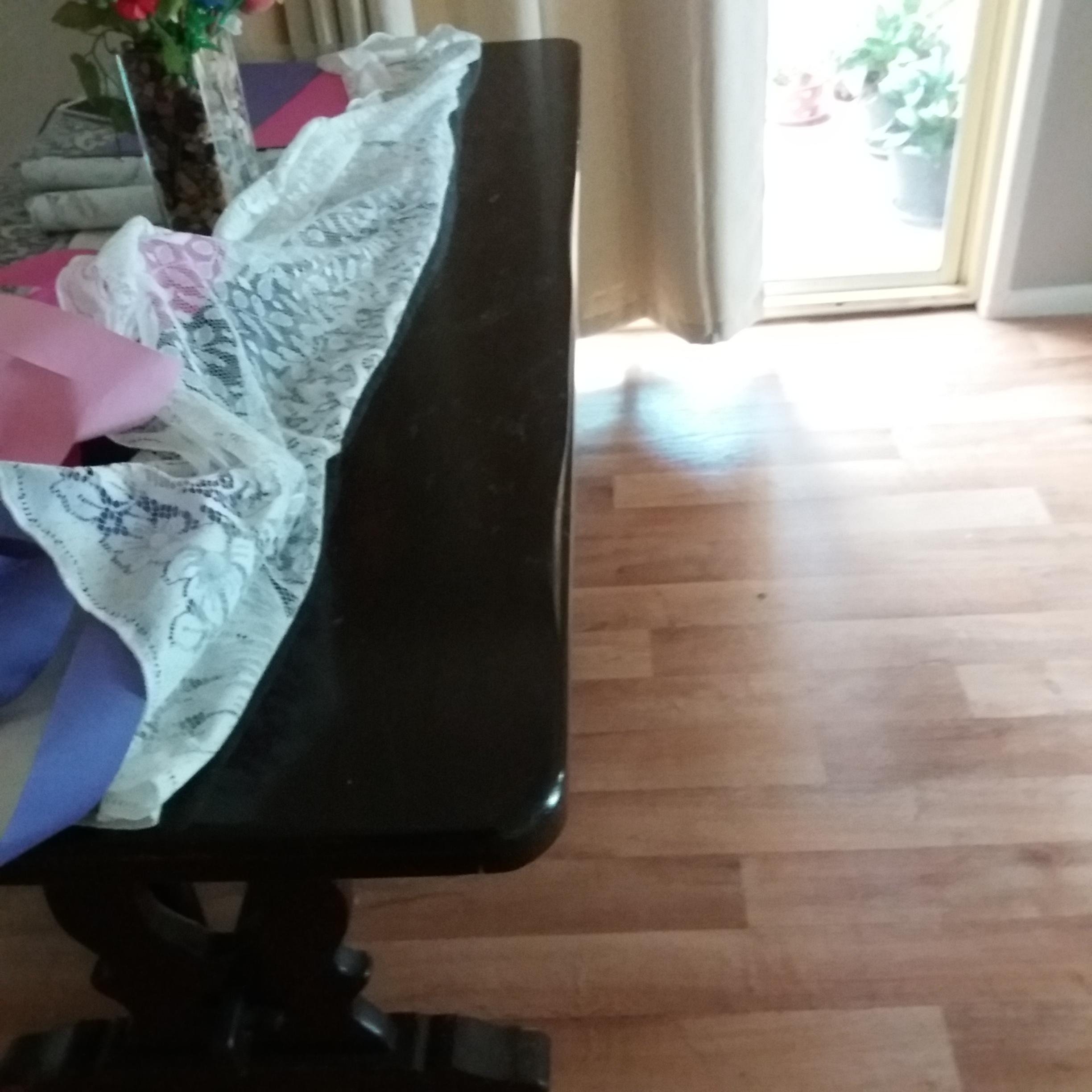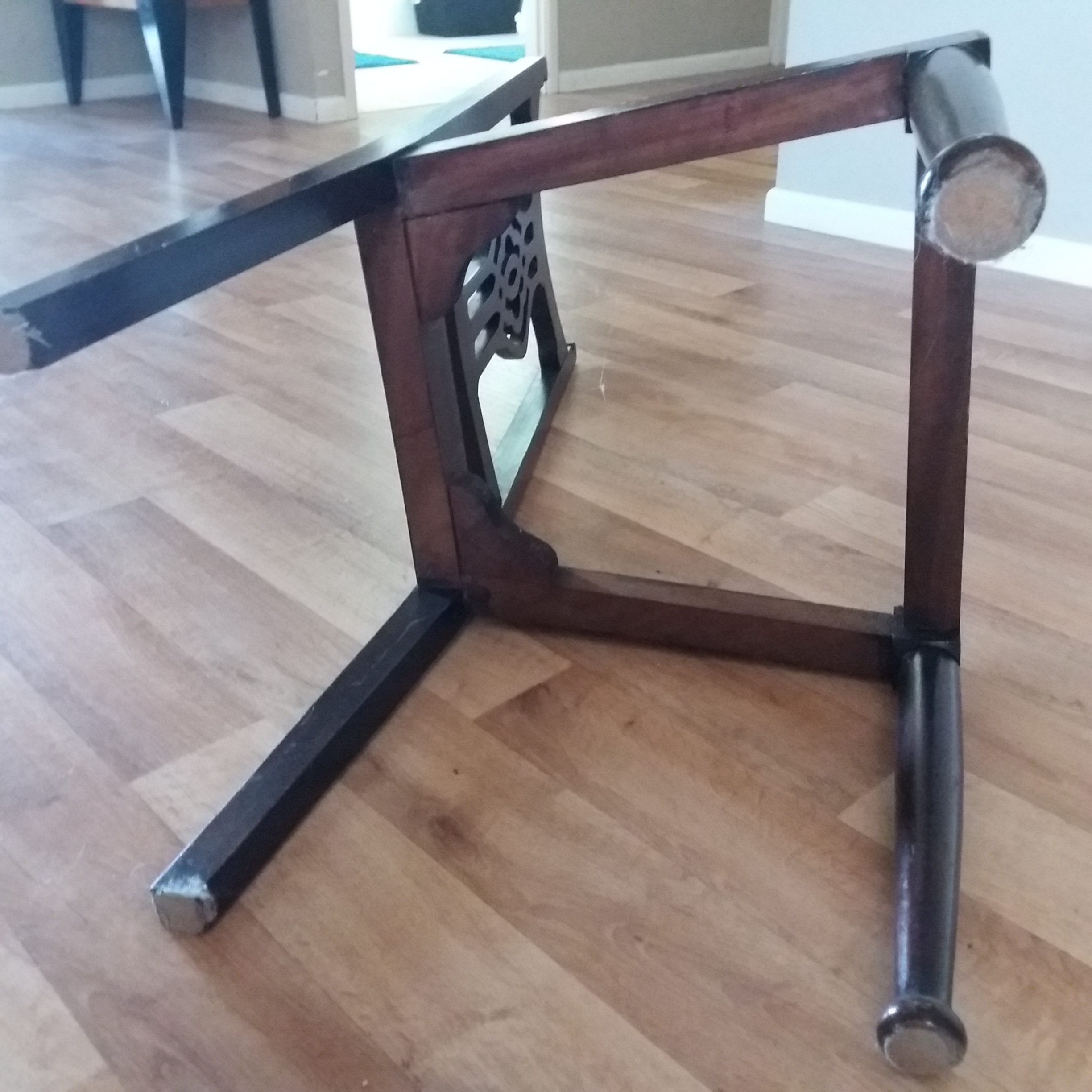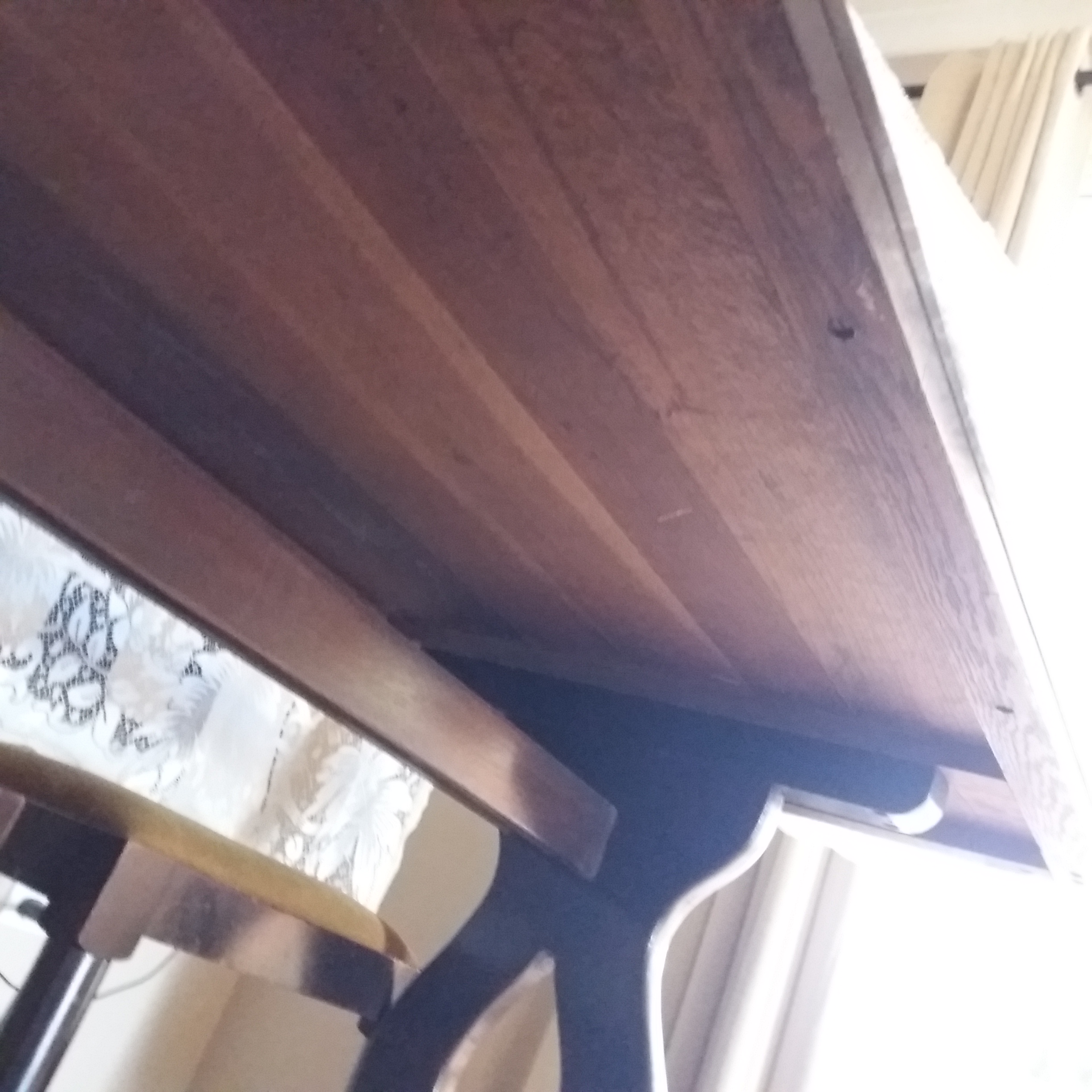 I have a trestle table and 4 chairs. The table top is not one piece and appears to be made from a hard wood and looks like oak. It is easier to see in the photos. The table top edges are bevelled in a wave type pattern. It looks similar to an Ethan Allen design I saw on ebay. Dimensions are: 62" Long by 30" Wide by 30" High
