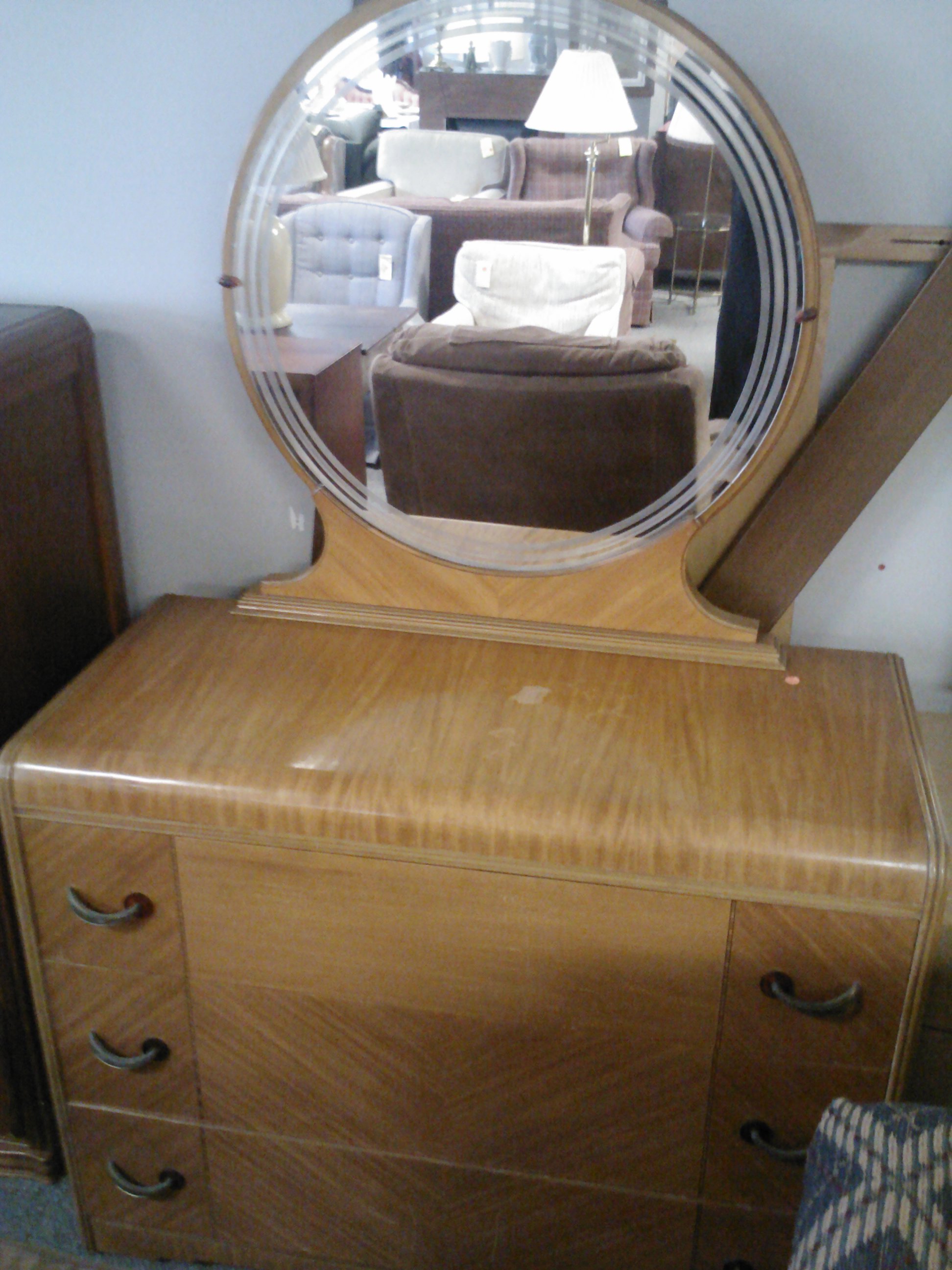 beautiful round mirror with etched detailing around the rim. constructed from blonde maple wood. classic art deco waterfall style. two drawers have chevron patterned wood. handles are brass and bakelite (bakelite mirror holders as well). date stamp on back of mirror reads "7-nurre 1-39". Top drawer is sectioned into 3 compartments. wheels on bottom. manufacturers tag on back (no writting visible). dovetail joints. curved wood trim on sides. beautiful piece.
