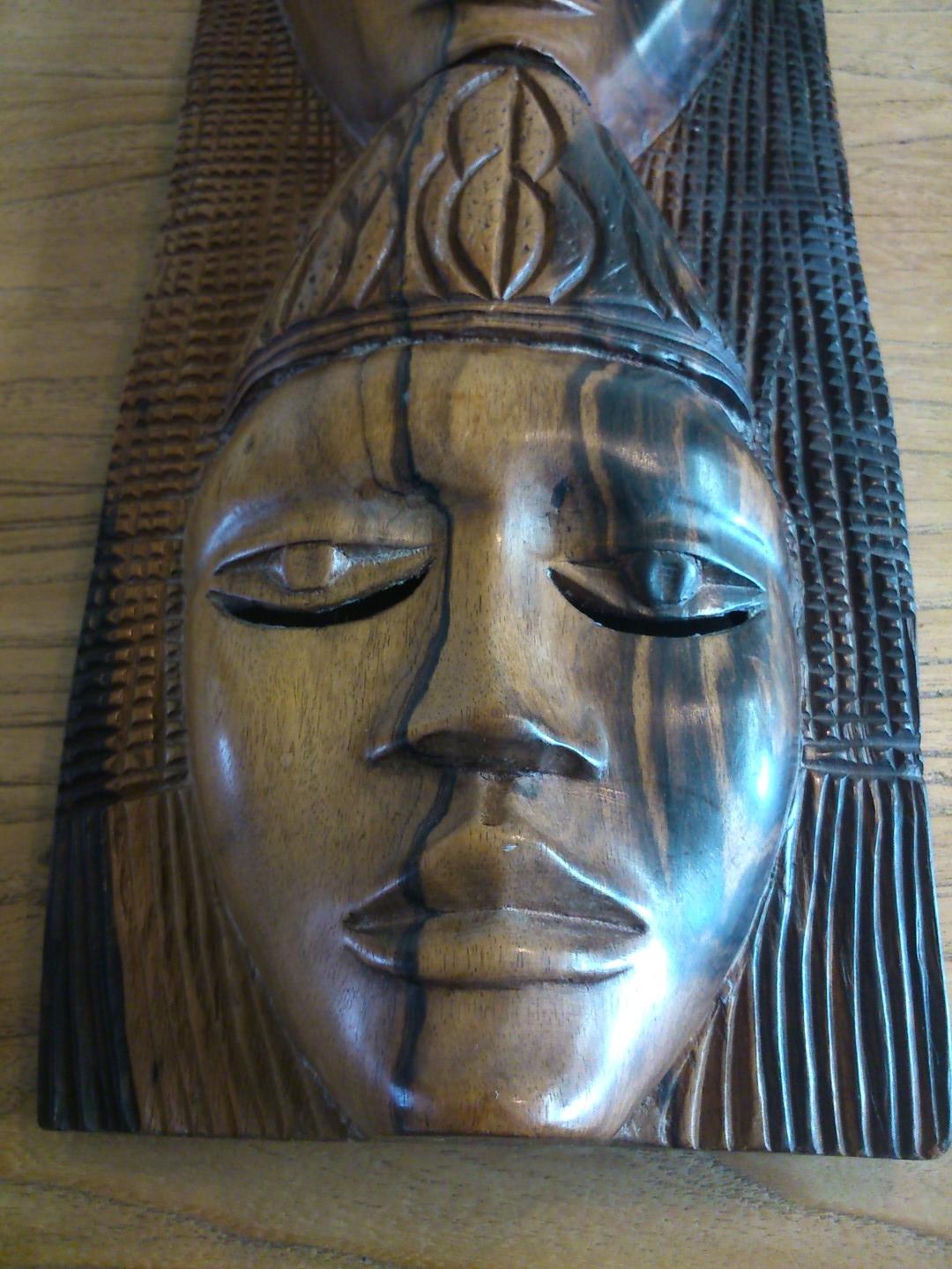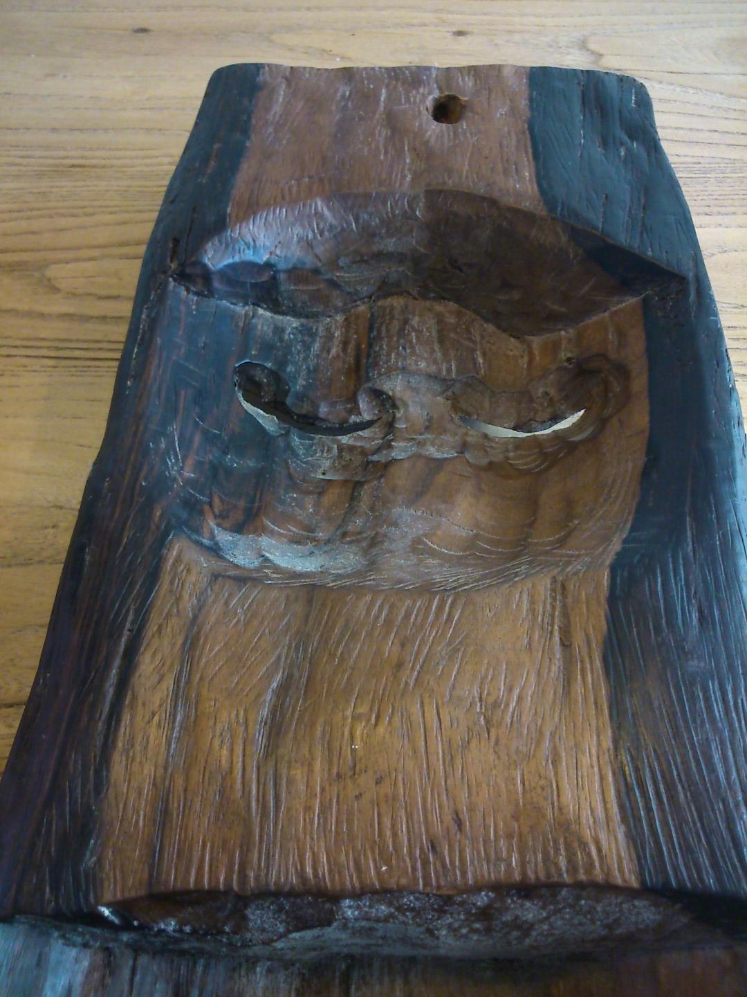 Nice color changes on the mask. Bought it at an estate sale. The person that made this sought out a perfect piece of wood. At the back you can see that it has been carved manually.