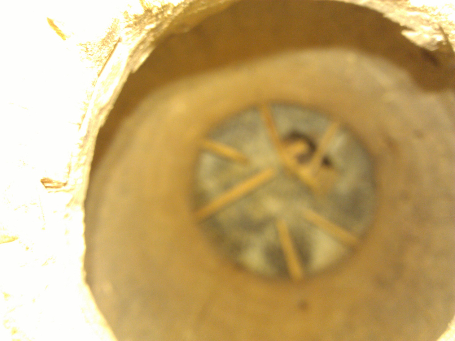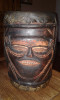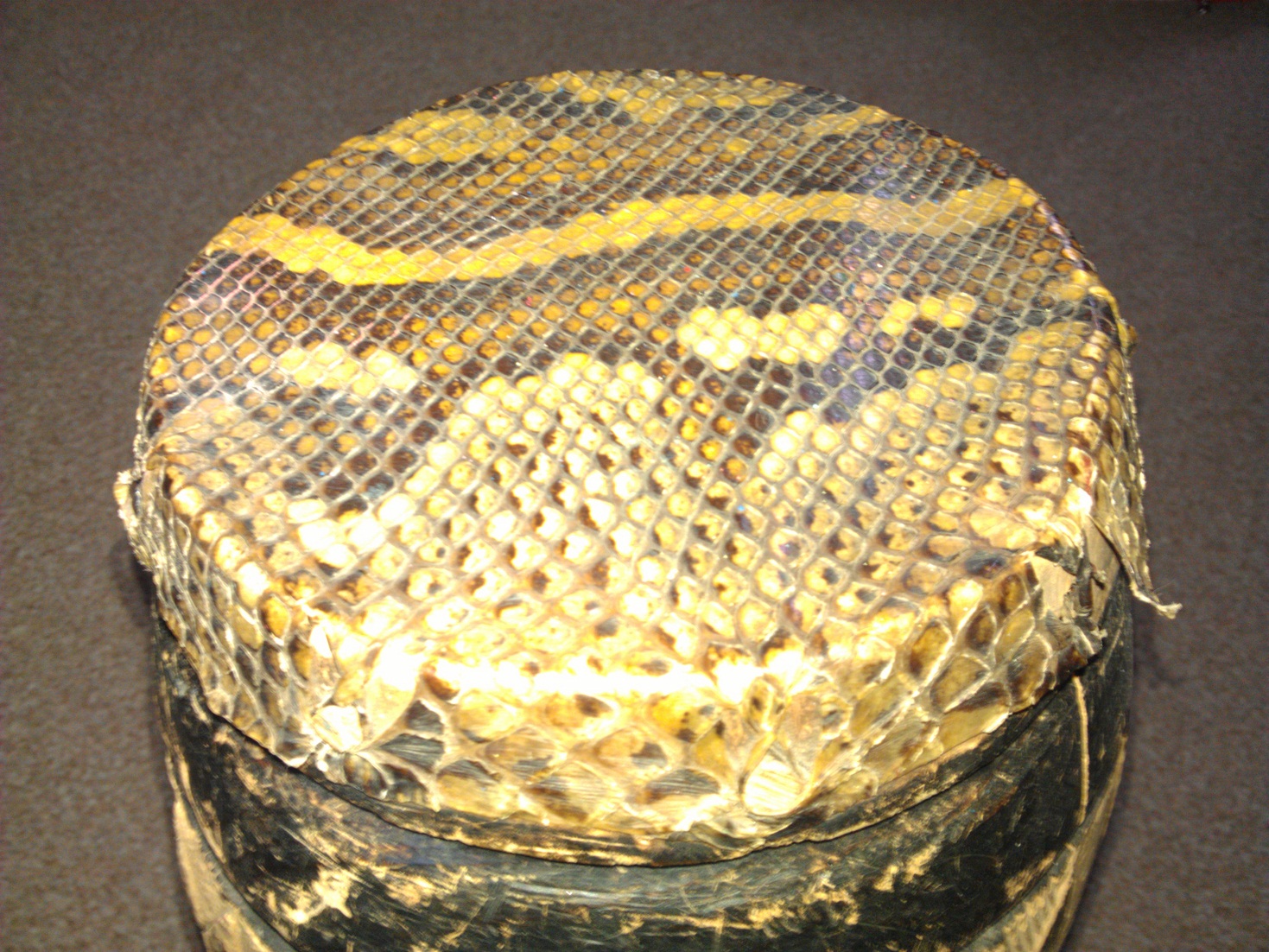 This is a snakeskin drum with carved indented face. There are 2 holes which look work around as though was used as a drum round someones neck. The inside has long wooden spikes pushed in to hold the snakeskin tight. The bottom of the drum looks to have suffered water damage at some point and it has caused some of the bottom to have been lost.