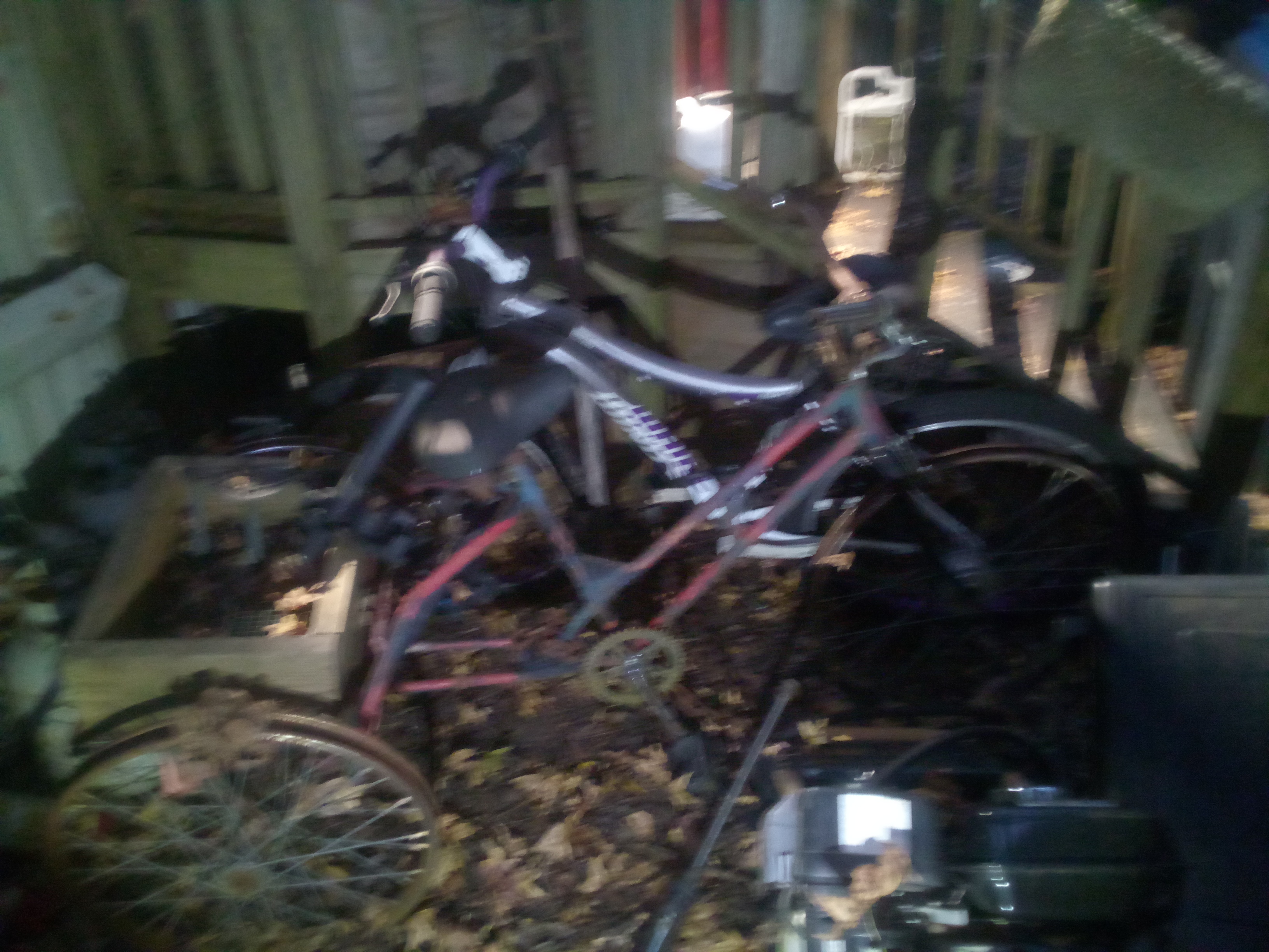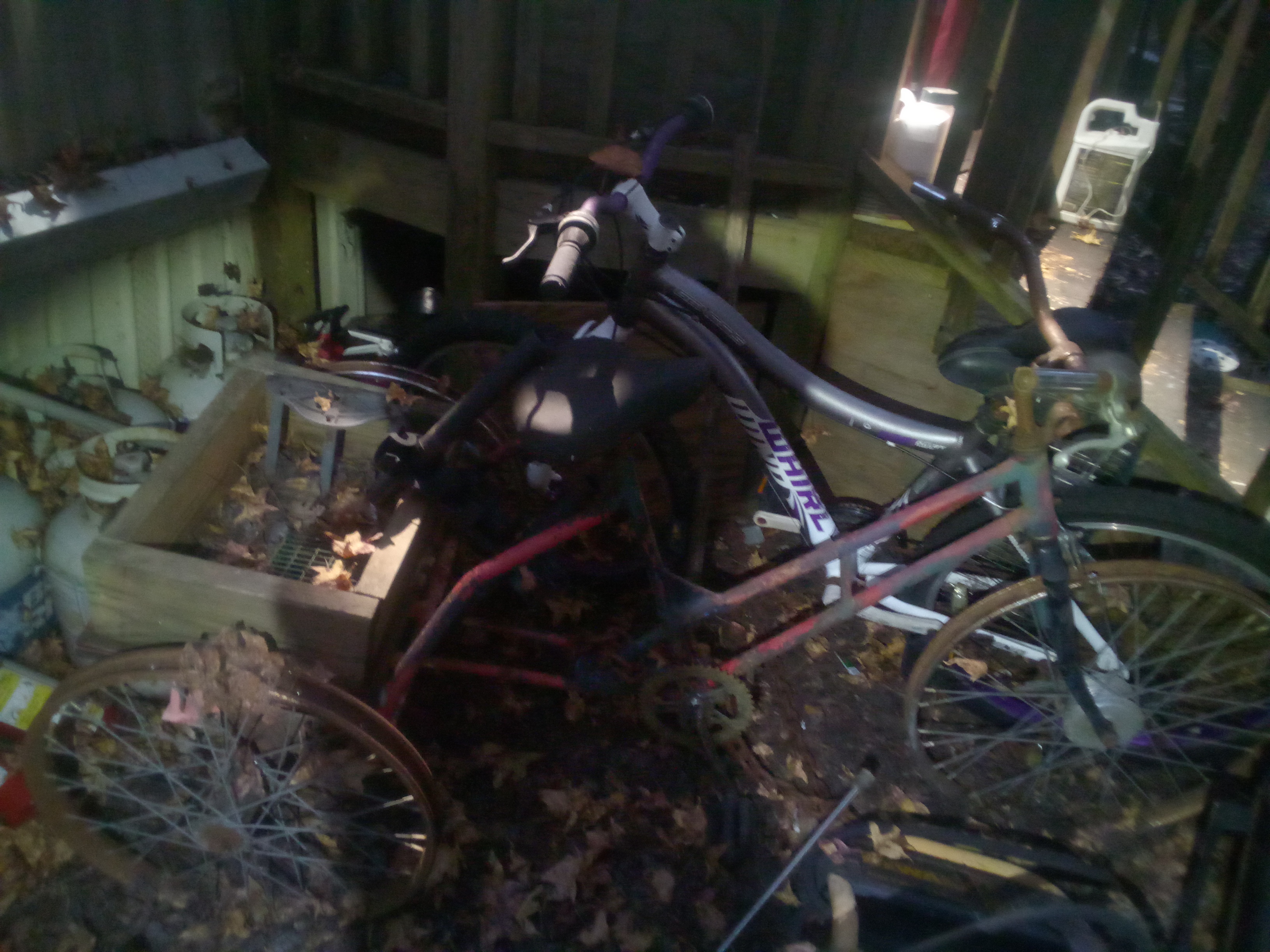 Condition Assessment: The tricycle is in fair condition, showing significant signs of wear. The frame has rust, and the wheels are likely compromised due to exposure to the elements. There is visible debris (leaves and dirt) indicating it has been stored outside. The overall structural integrity may be affected, and restoration would be necessary for functional use.