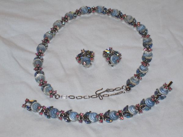 includes a necklace, bracelet, and earclips. The setting is heavily plated silver-toned rhodium. All are in excellent vintage condition, with no finish wear, and no missing or damaged stones.