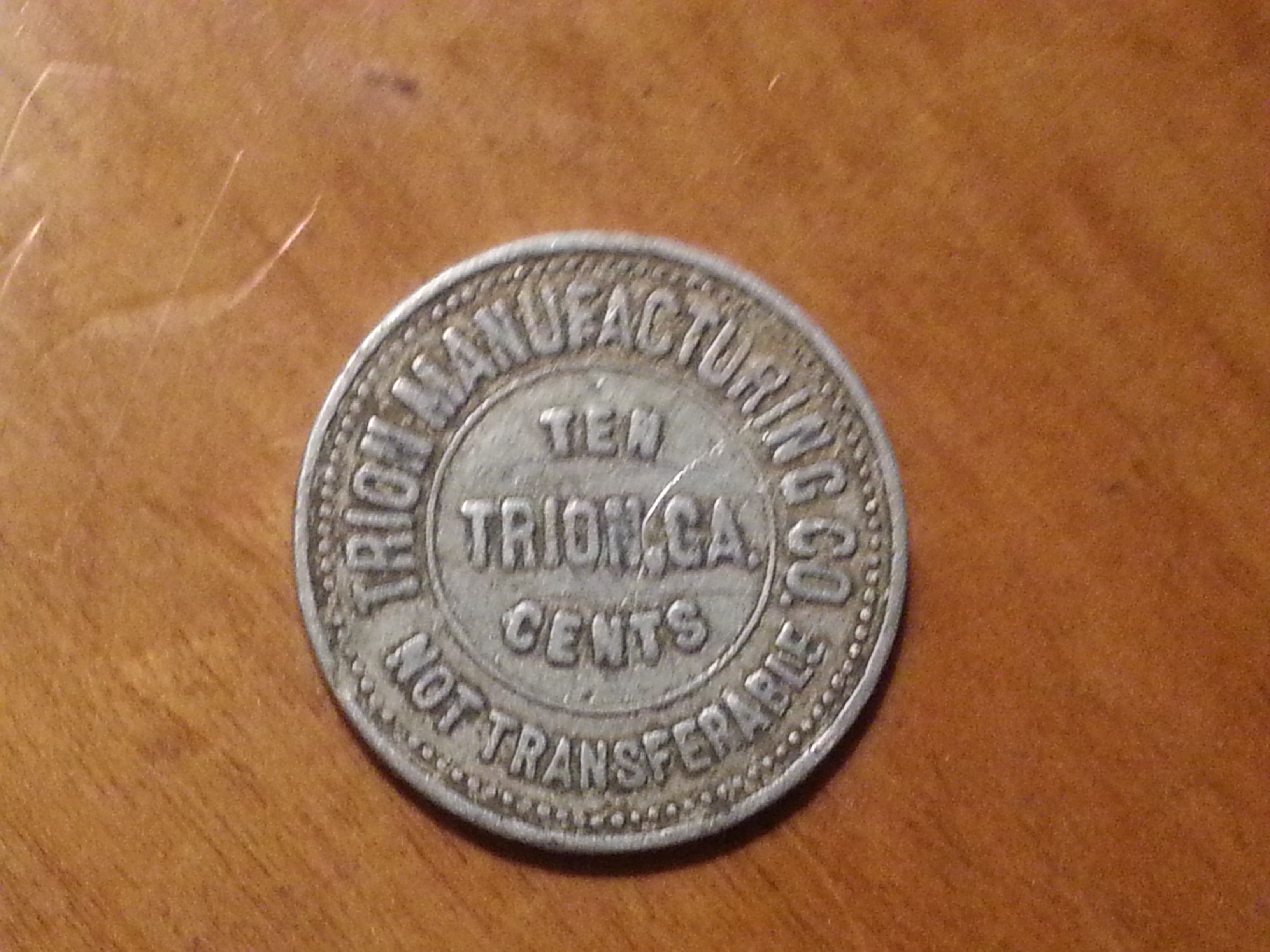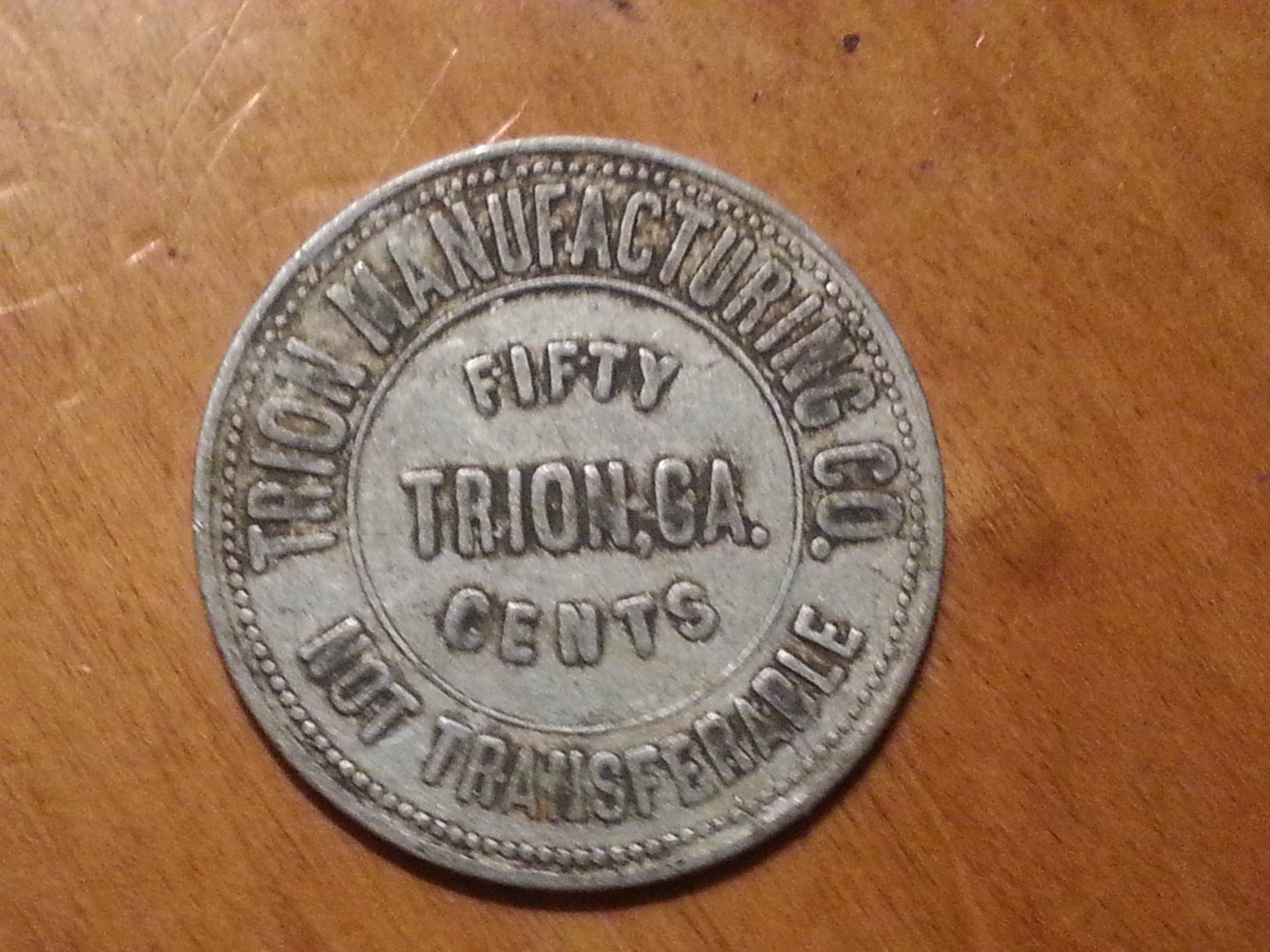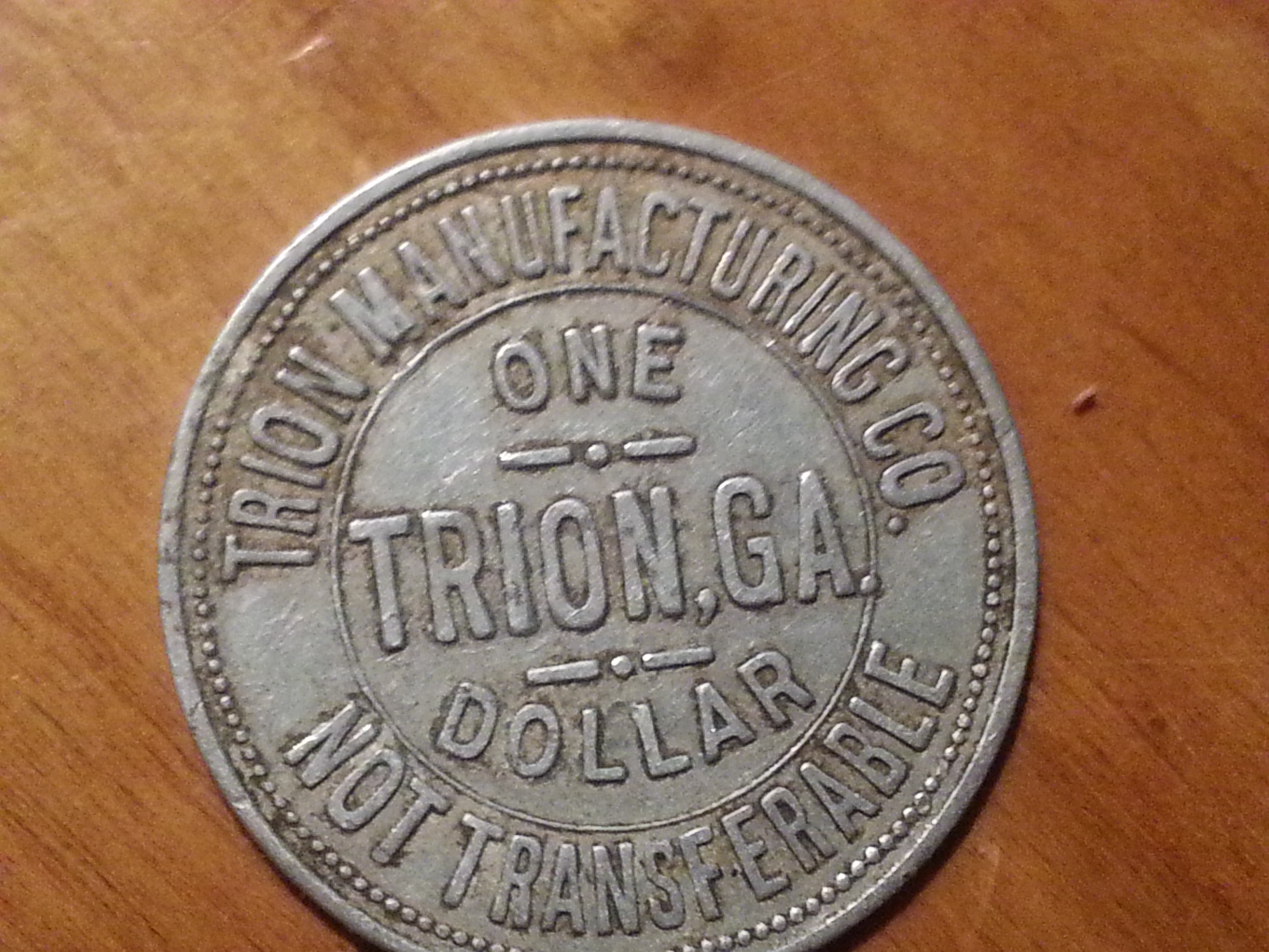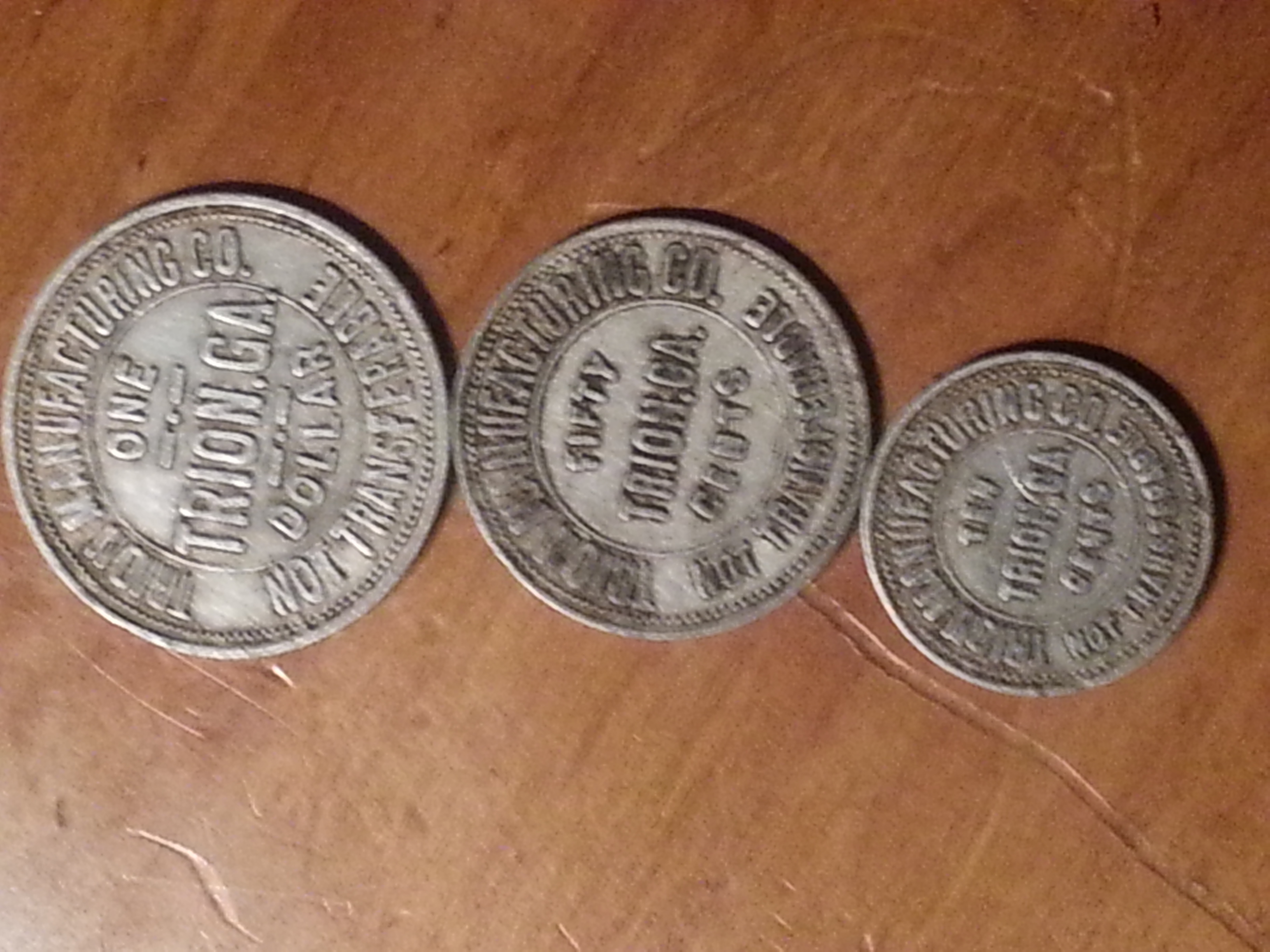 Trion ga manufacturing CO. Tokens.I have a 50 cent one that reads payable in merchandise and 50 on one side, other side says trion manufacturing CO. NOT TRANSFERABLE fifty cents trion ga. I have a ten cent one that reads the same except had ten cents and 10 on it rather than 50 or fifty. And last I have a $1.00 one as well.