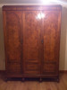 This is a triple armoire or closet that has 3 solid wood doors. The middle door has beautiful wood grain of huge oval tree rings. I believe it is a veneer. The middle compartment has a brass closet rod with brass fittings to hold the rod in place. The top is one piece (looks oak) that has grooves cut in it to align the walls of the piece. They fit into the base and top. The base is also solid and has 4 short legs supporting it. They are attached to the base with wooden pegs about the size of a nickle or quarter. The walls have a brass fitting at the top and bottom that a little angular brass piece slides into to support them. All the hinges, rods, etc. are brass except for a few screws added over the years.