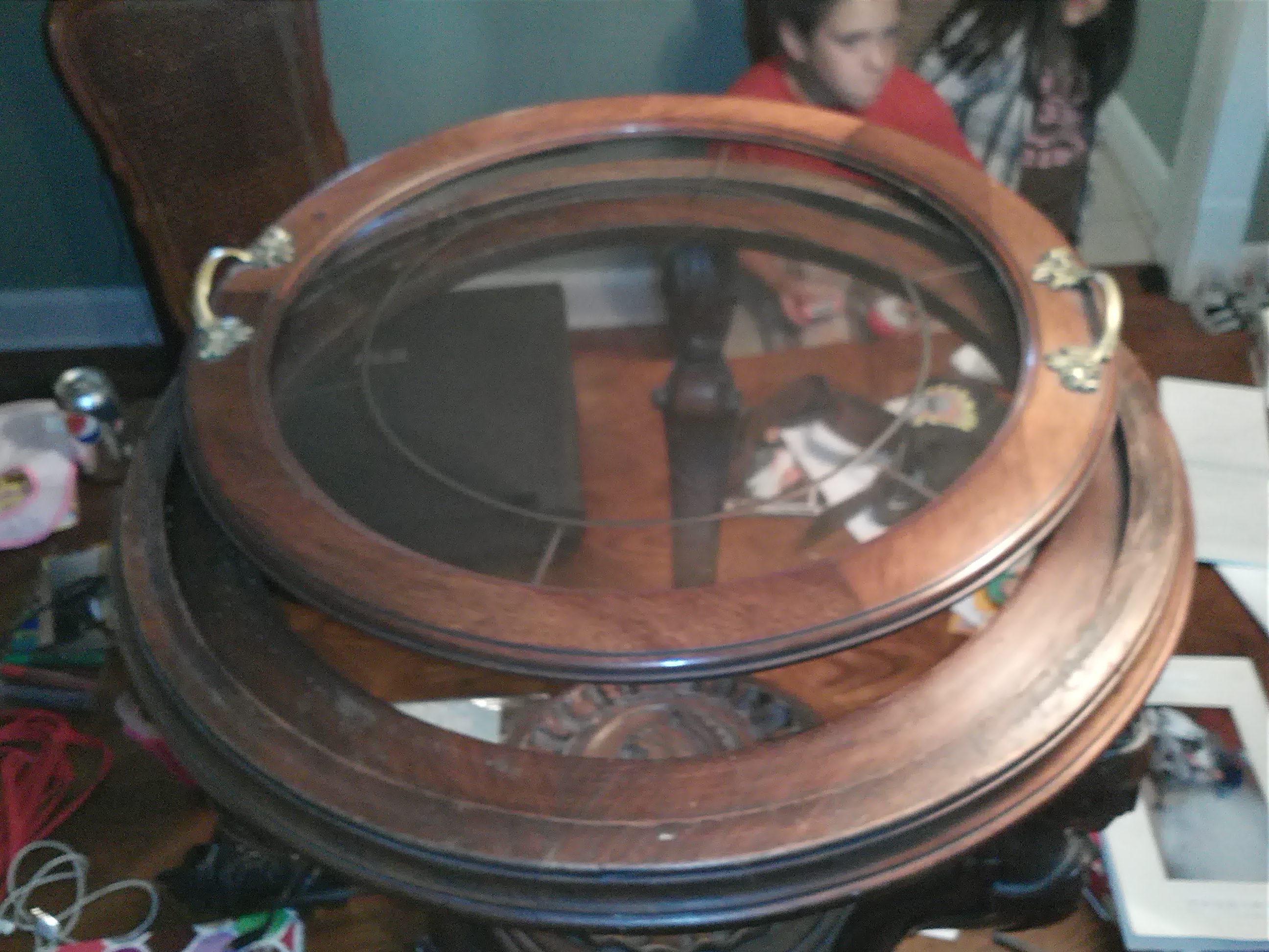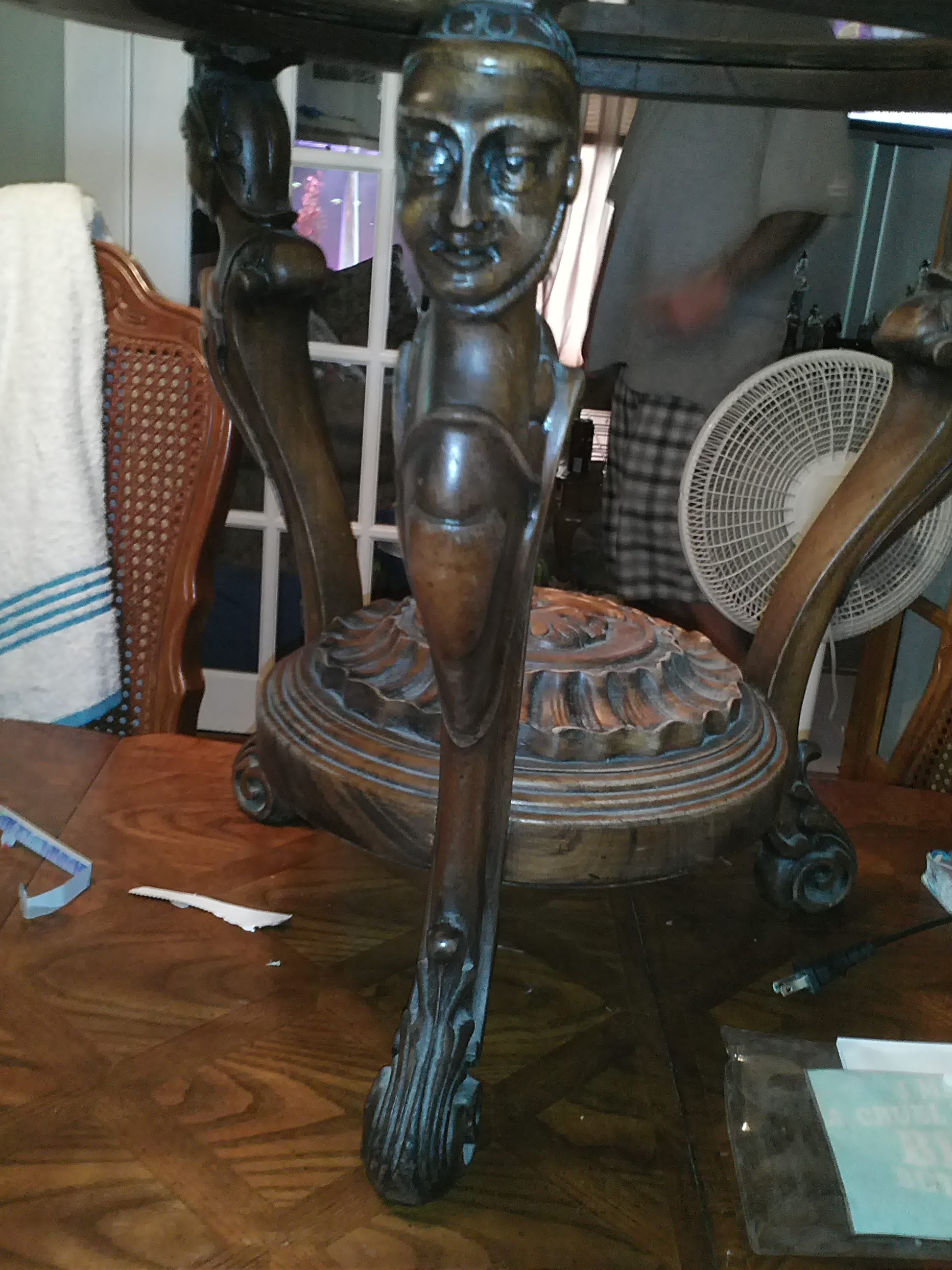 Round table with a Trojan head carved into the center wood piece, legs are also carved with the head/body of same style. Top is removable with a glass center piece, brass handles. This is all I know of it as it was given to me and curious as to the value. Thanks!!!