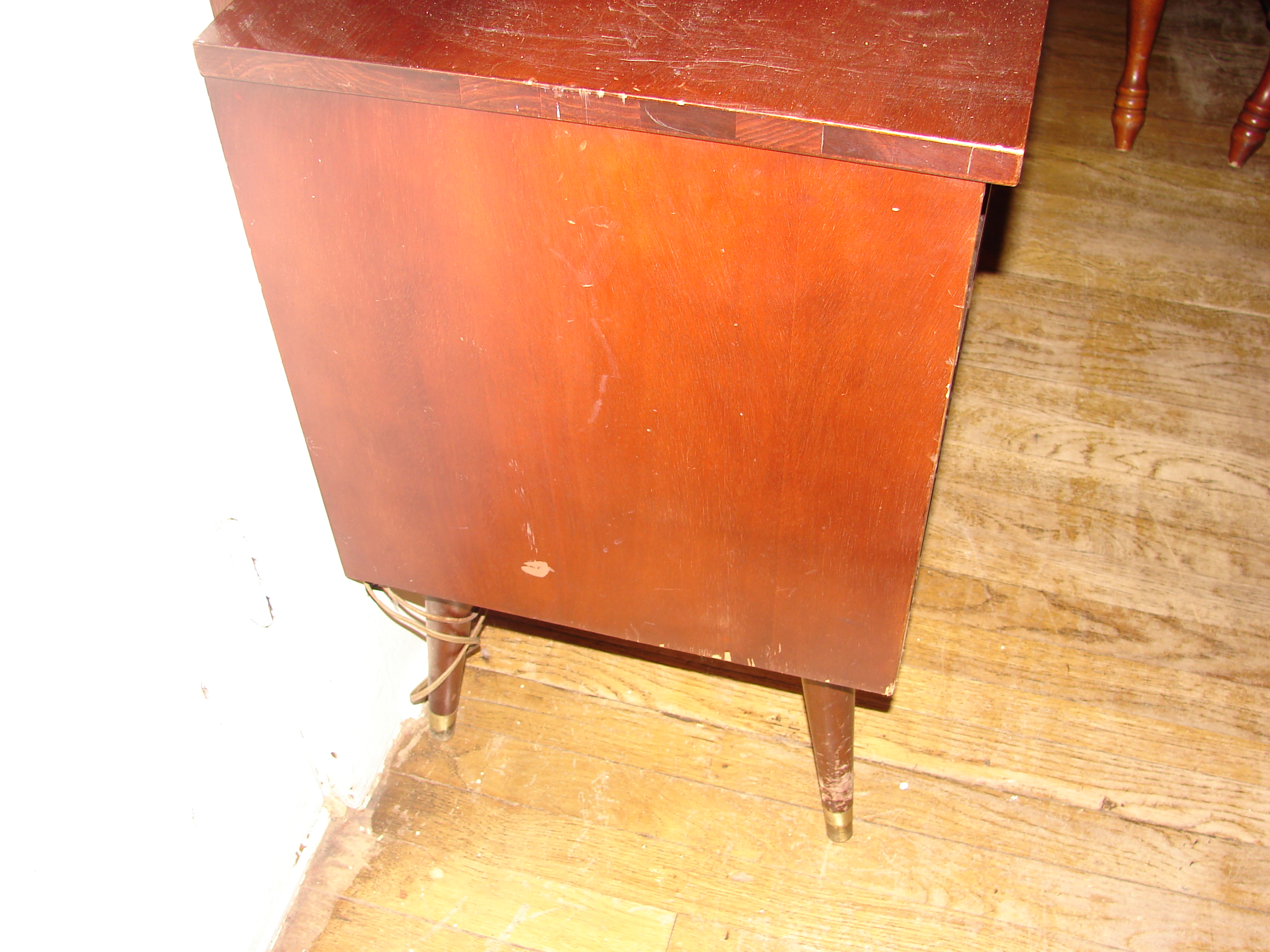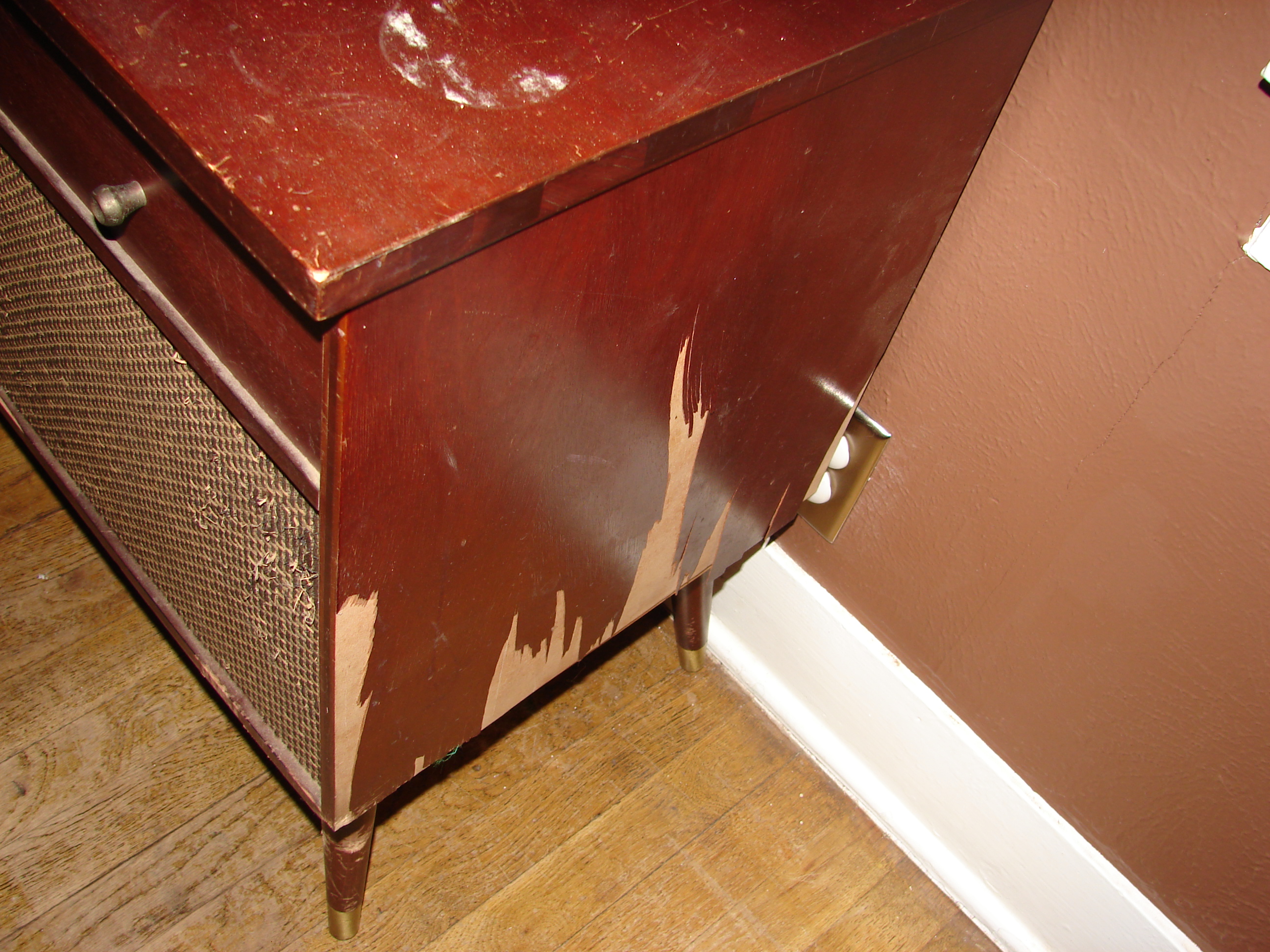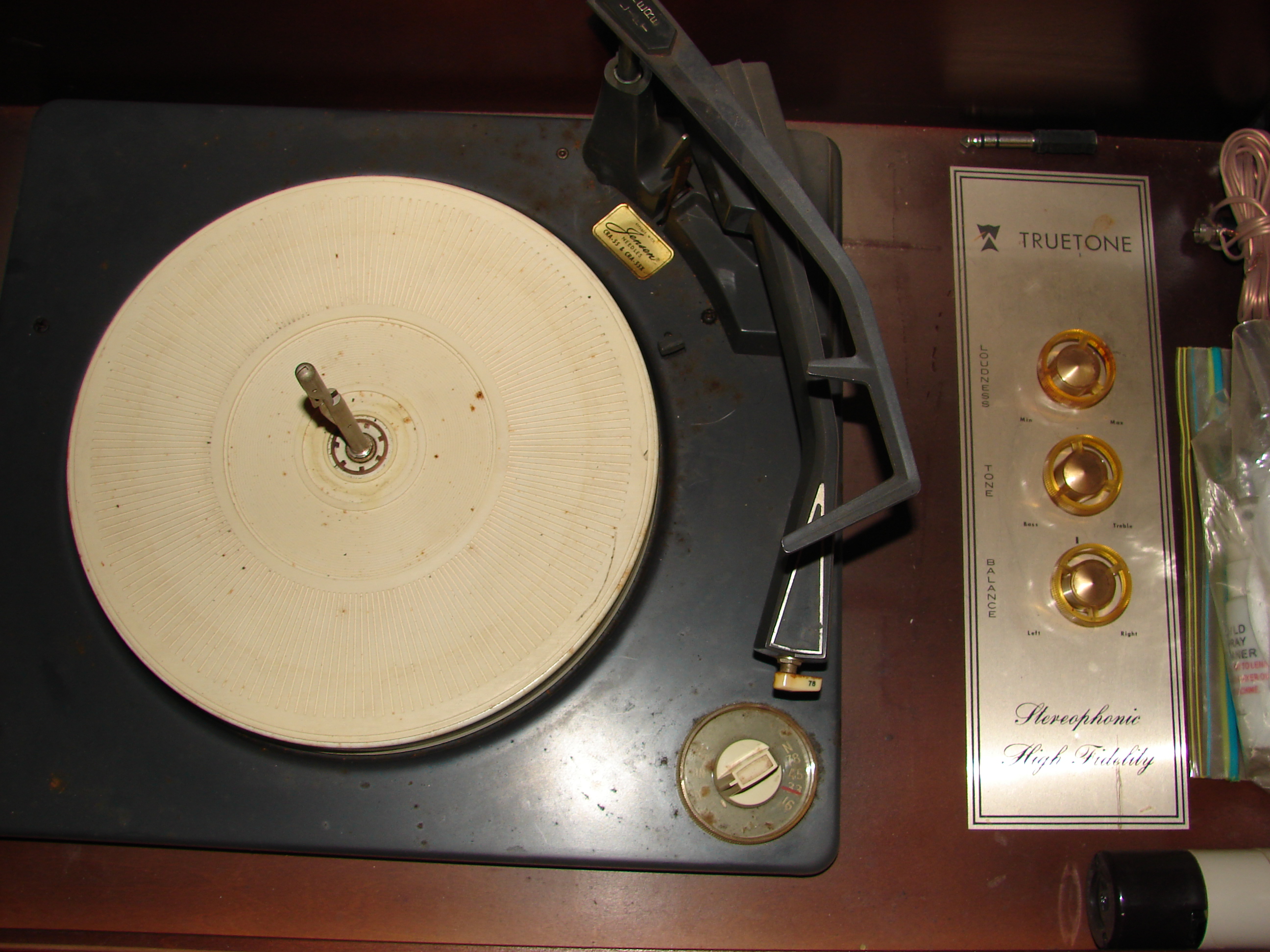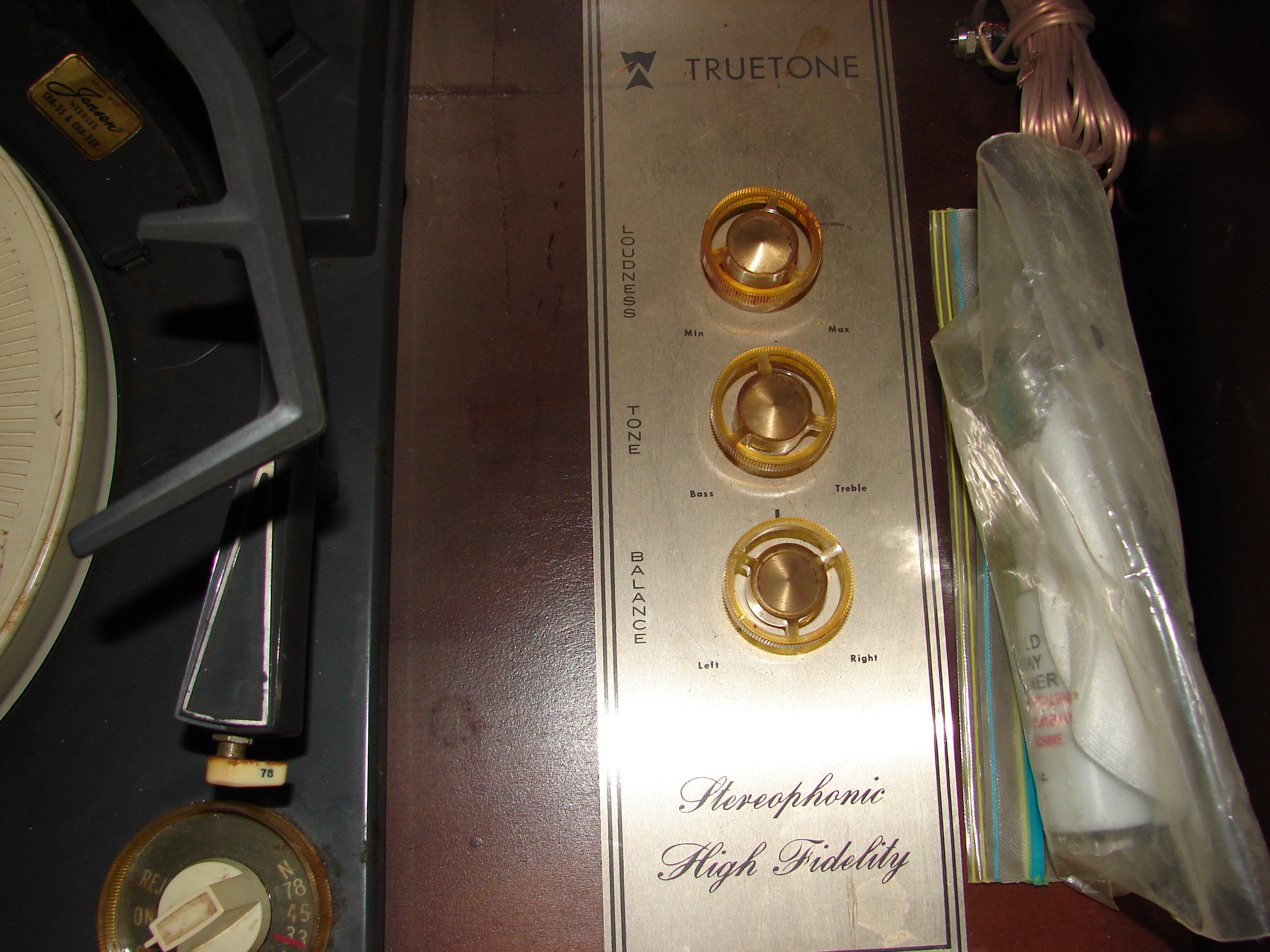 TrueTone record player Console, Stereophonic High Fidelity. Works but slow to start, some external damage to outside shown in pics. Serial # A 94055. Overall in good shape. Need to find out how old this is and possible value.